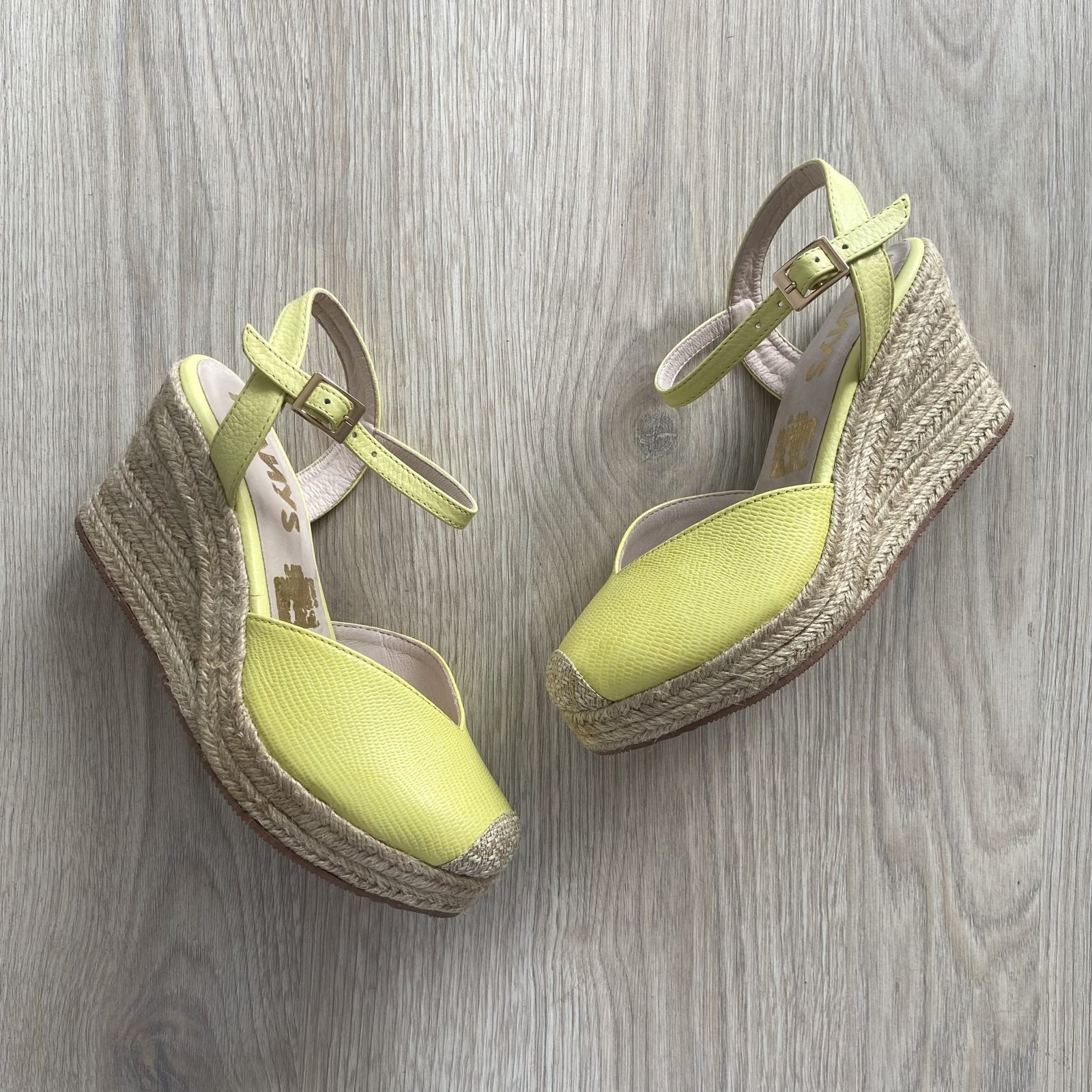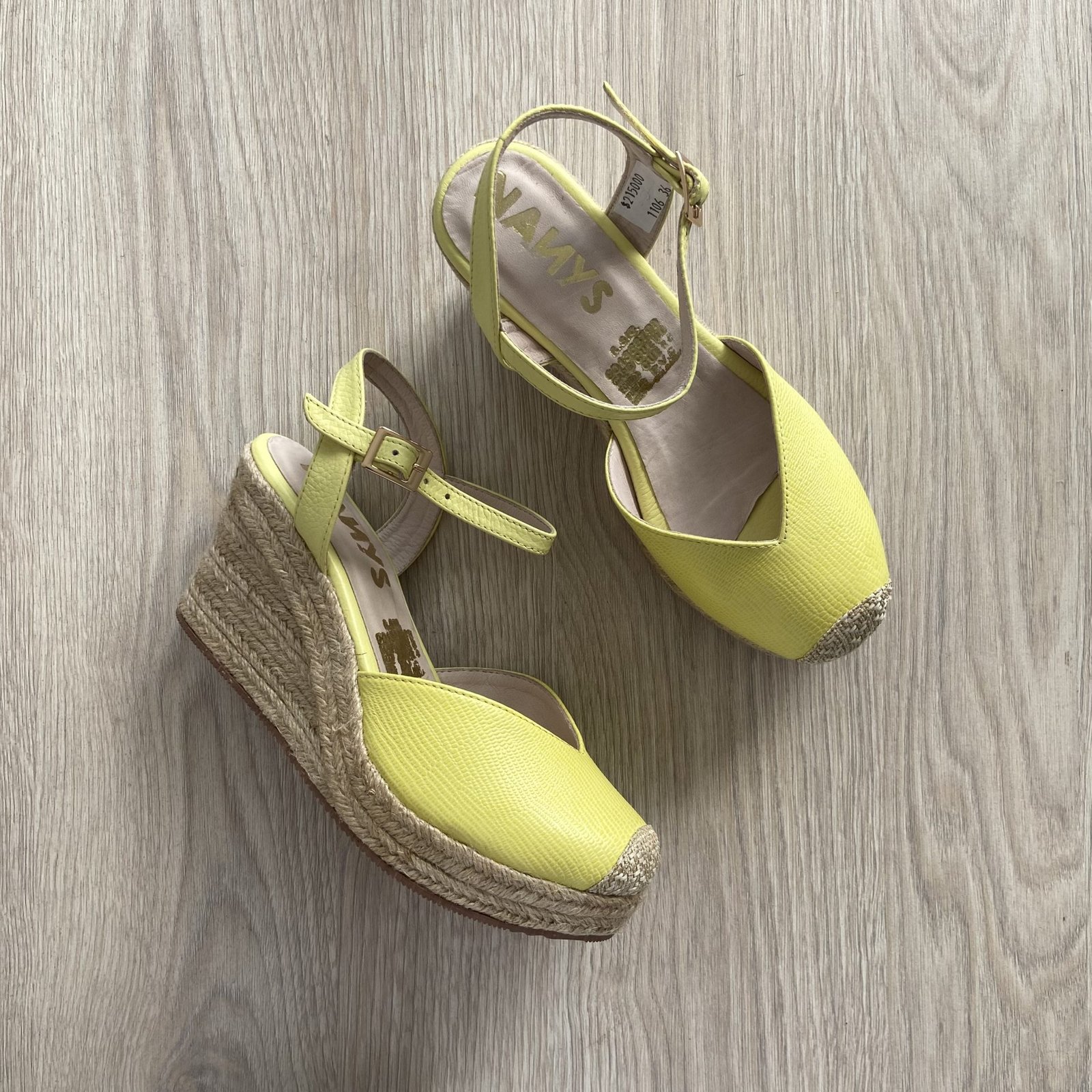 Sandalias amarillas en cuero con plataforma en yute. Tacón 5.5 mas plataforma con suela en goma. Forrados en cuero. Hechos en Colombia.
