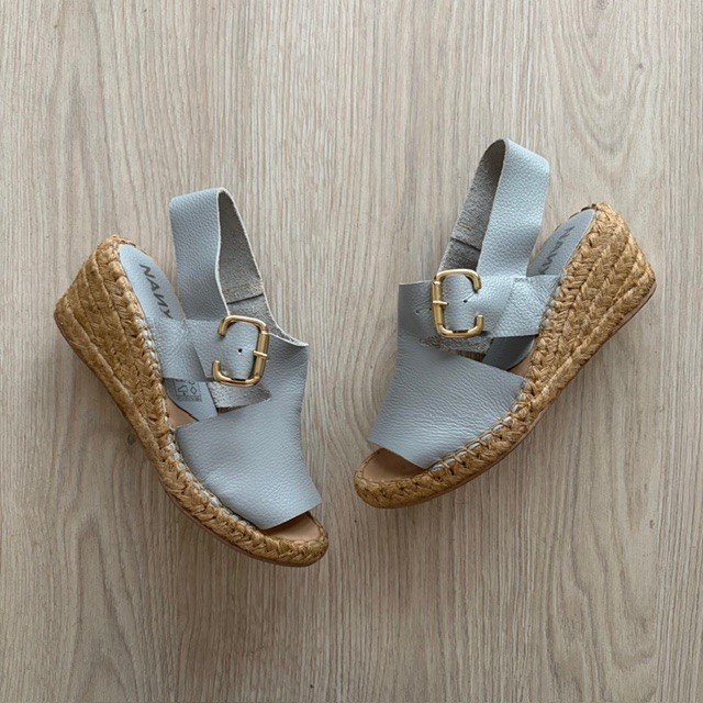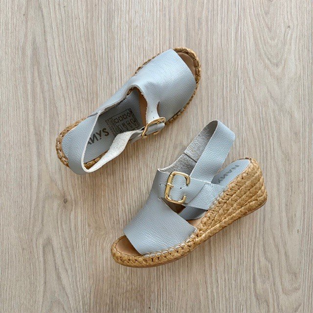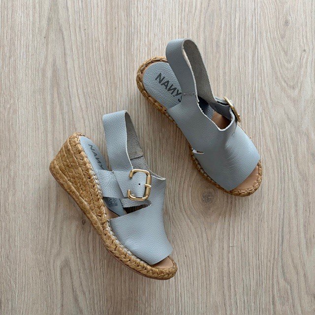 Sandalias azul claro en cuero con hebilla y plataforma en yute