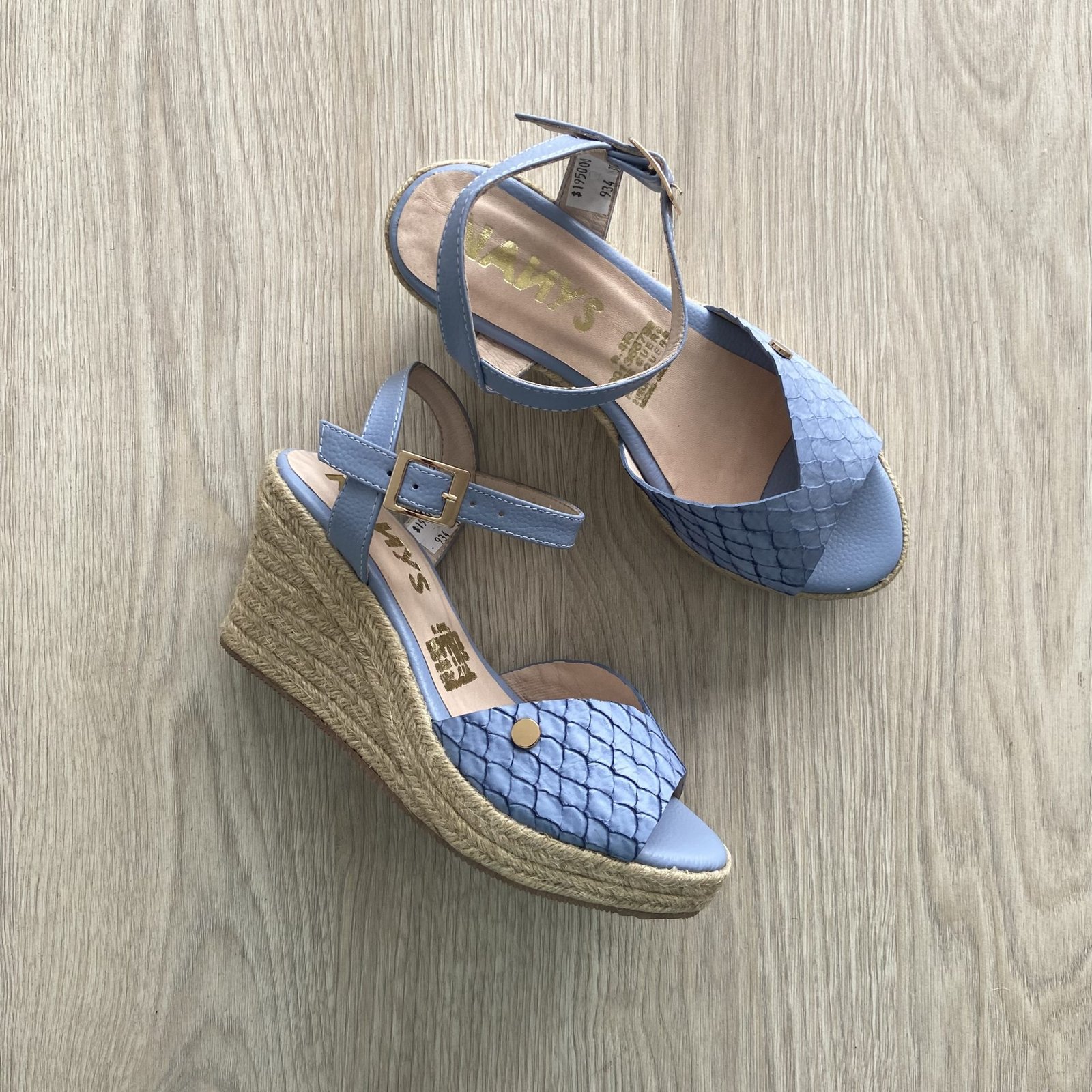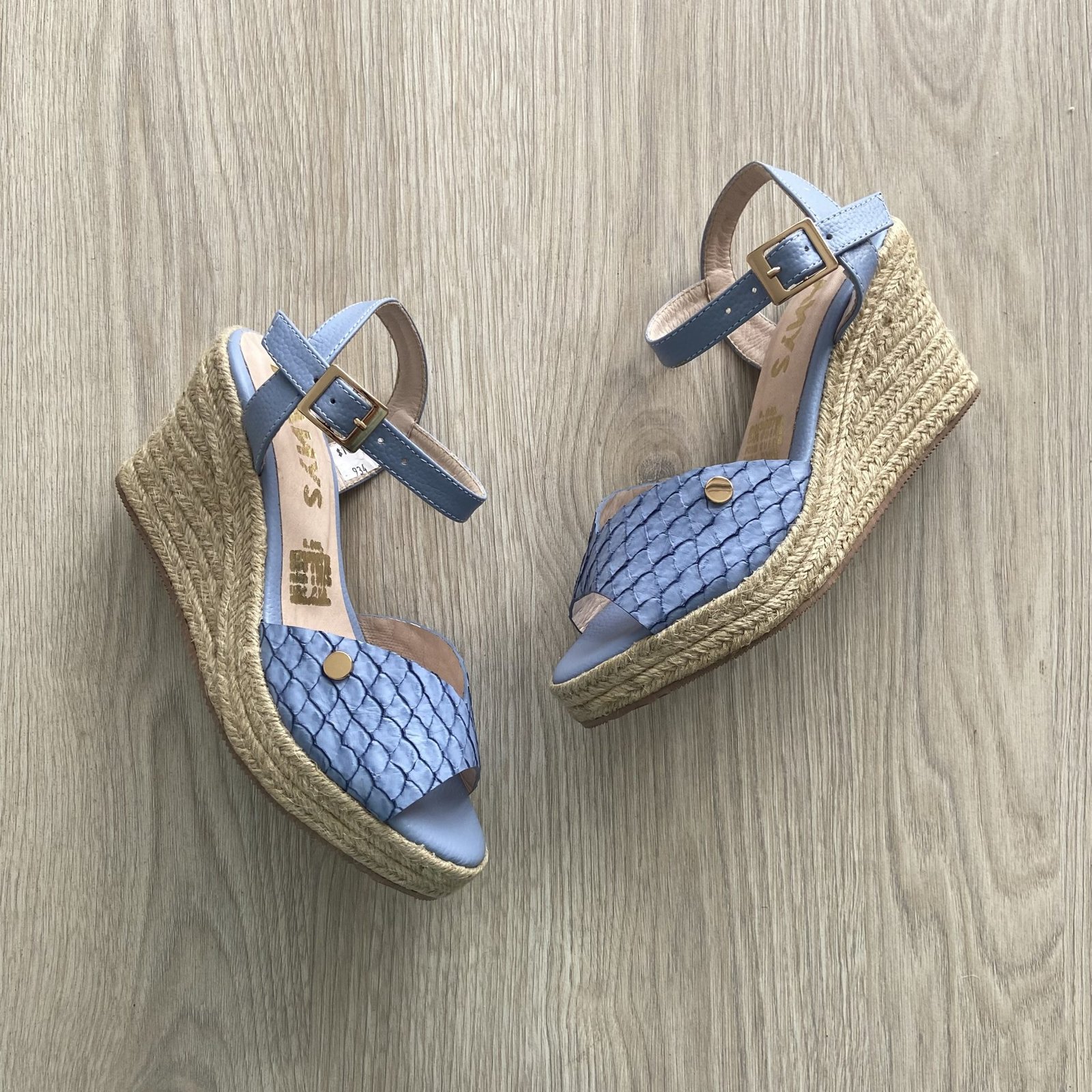 Sandalias azul hortensia en cuero. Con plataforma forrada en yute. Forradas en cuero. Hechas en Colombia.