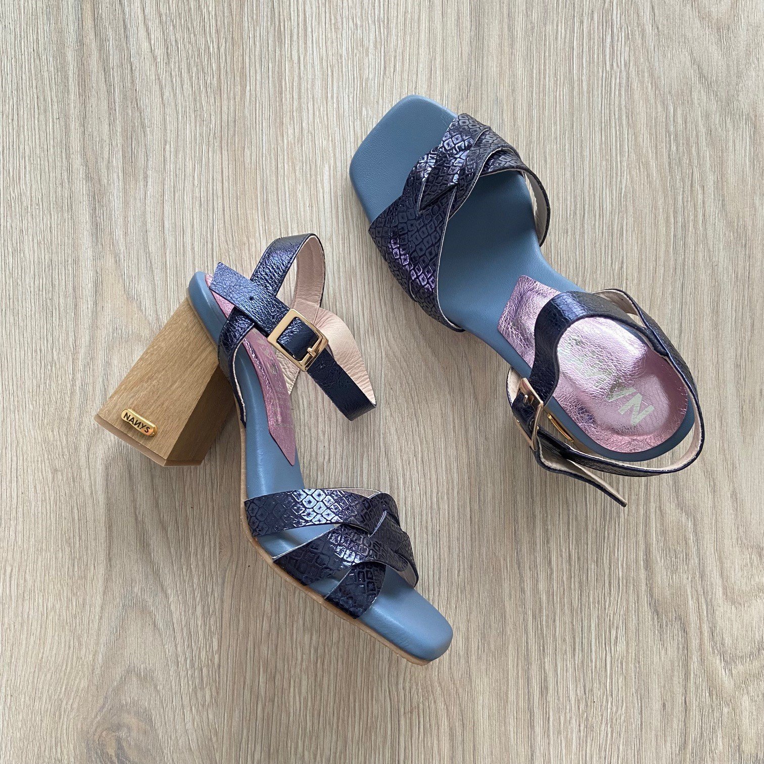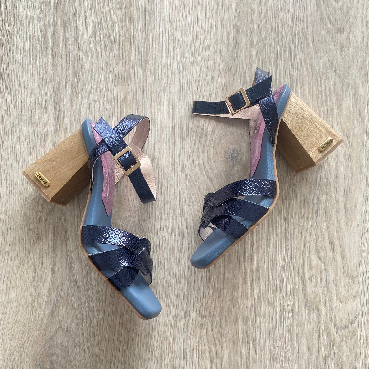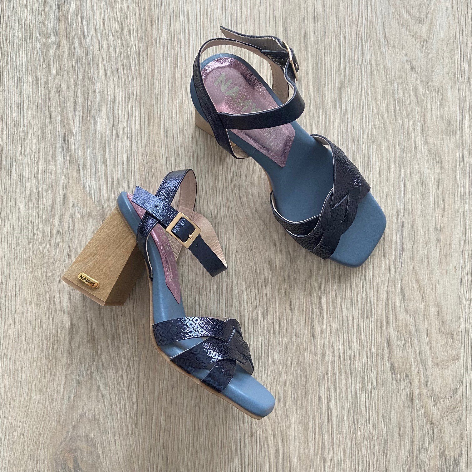 Sandalias azules en cuero con aplique dorado. Tacón 7.5 cm en madera. Suela en goma beige. Forradas en cuero. Hechas en Colombia.