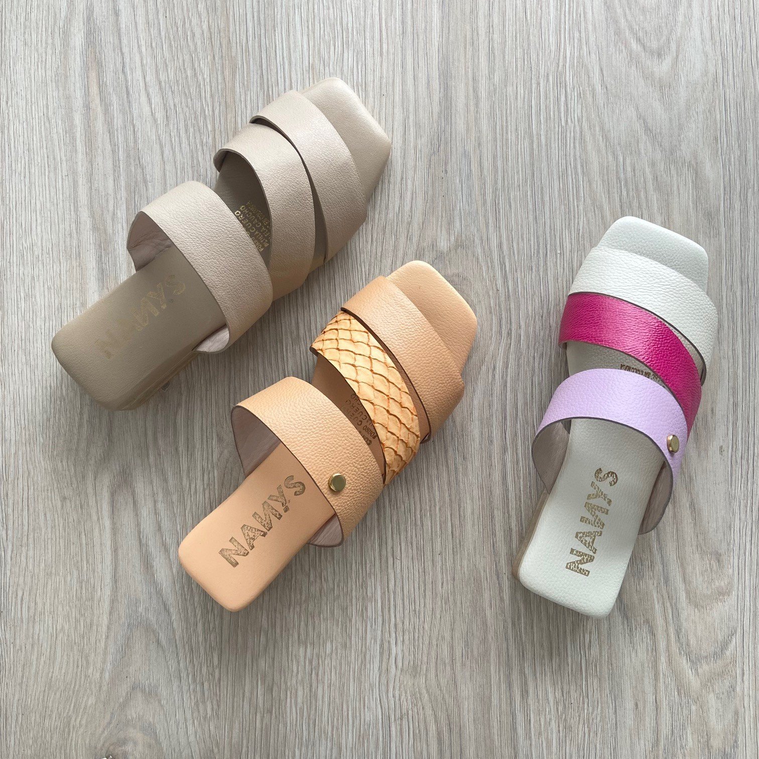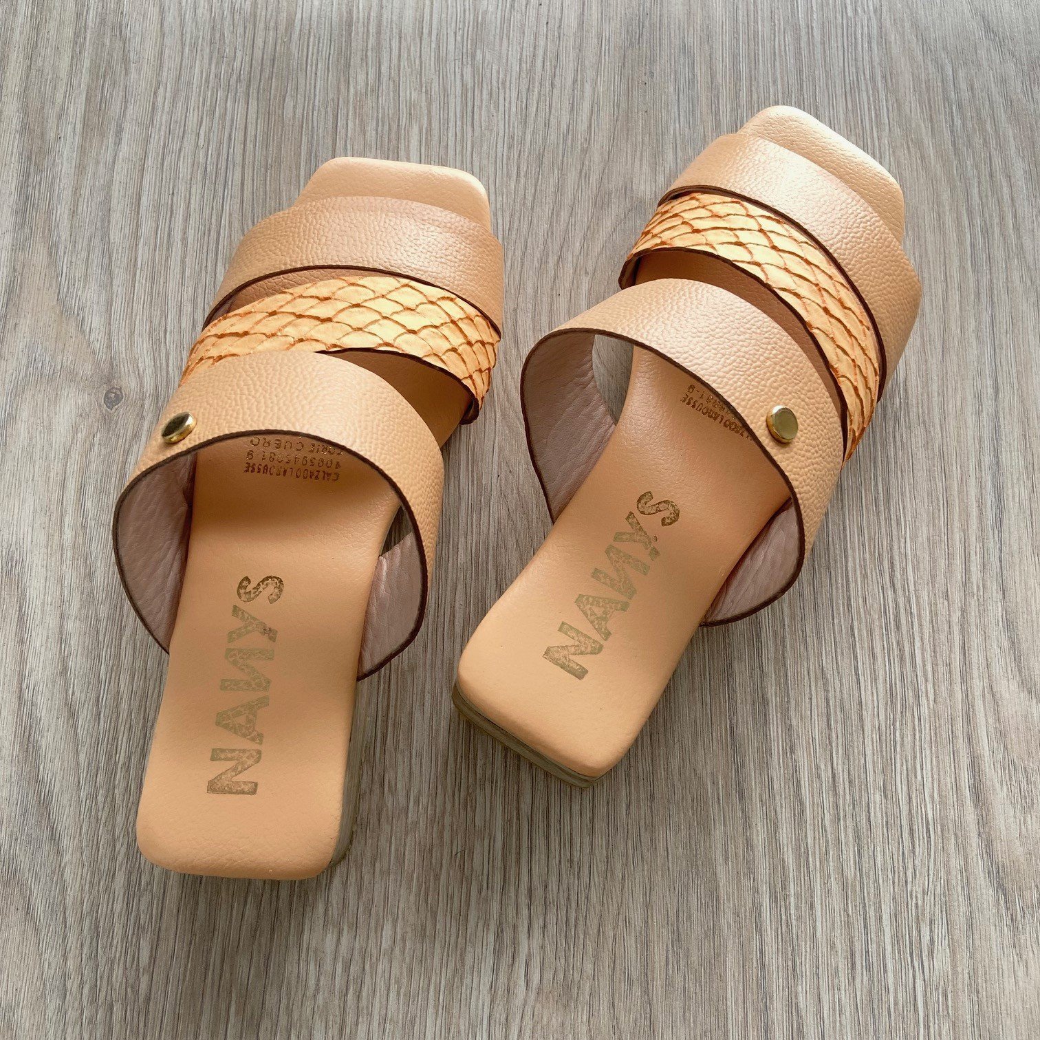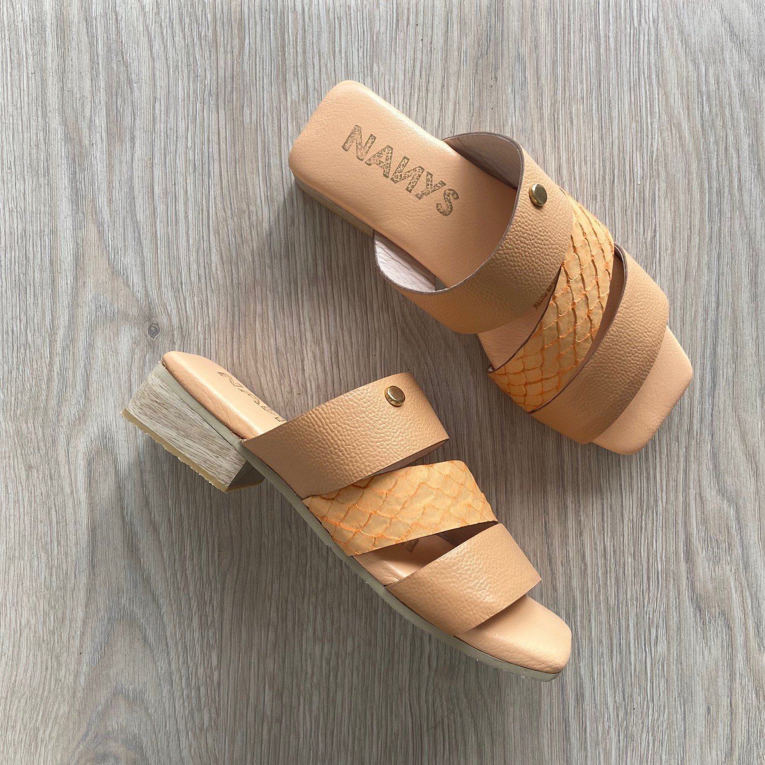 Sandalias bajitas durazno en cuero. Tacón 2.5 cm en madera. Forradas en cuero. Hechas en Colombia.