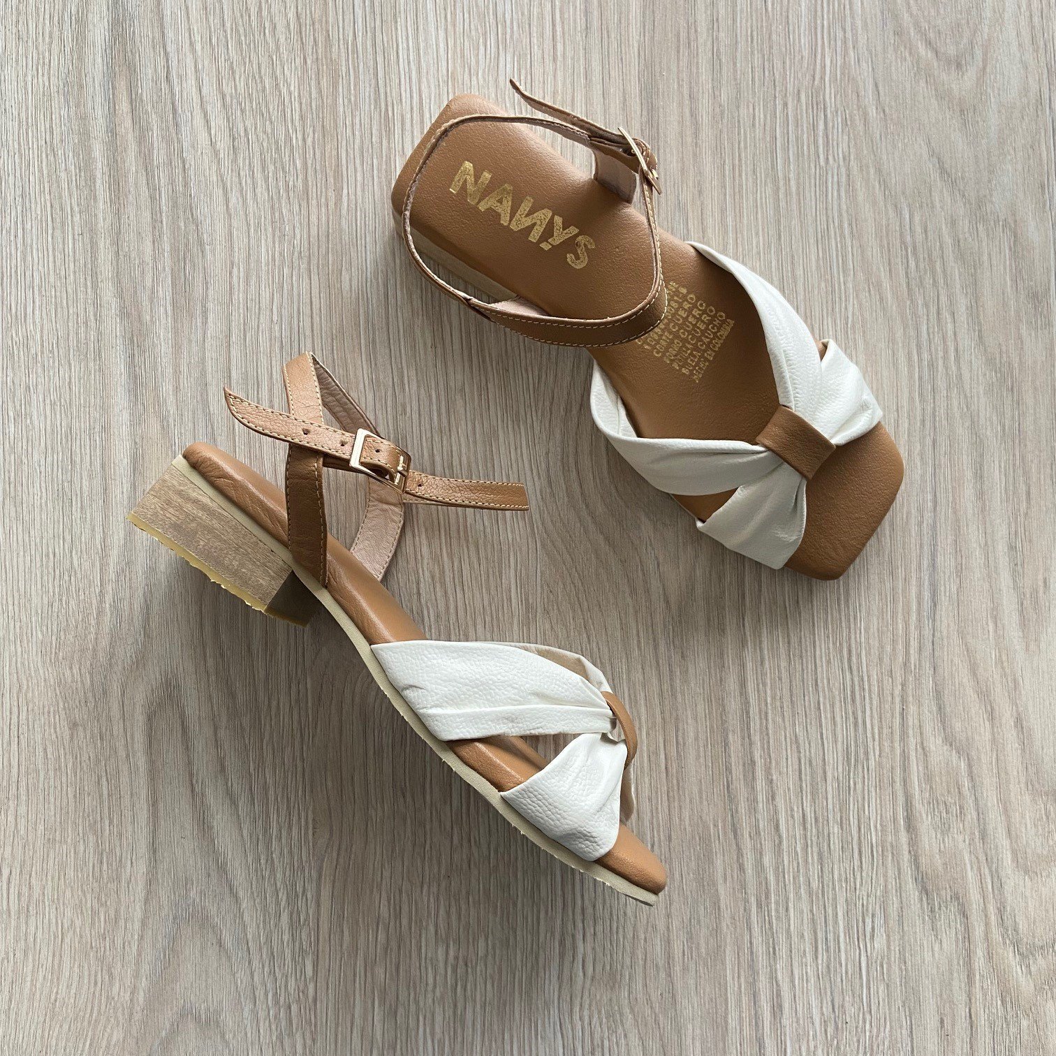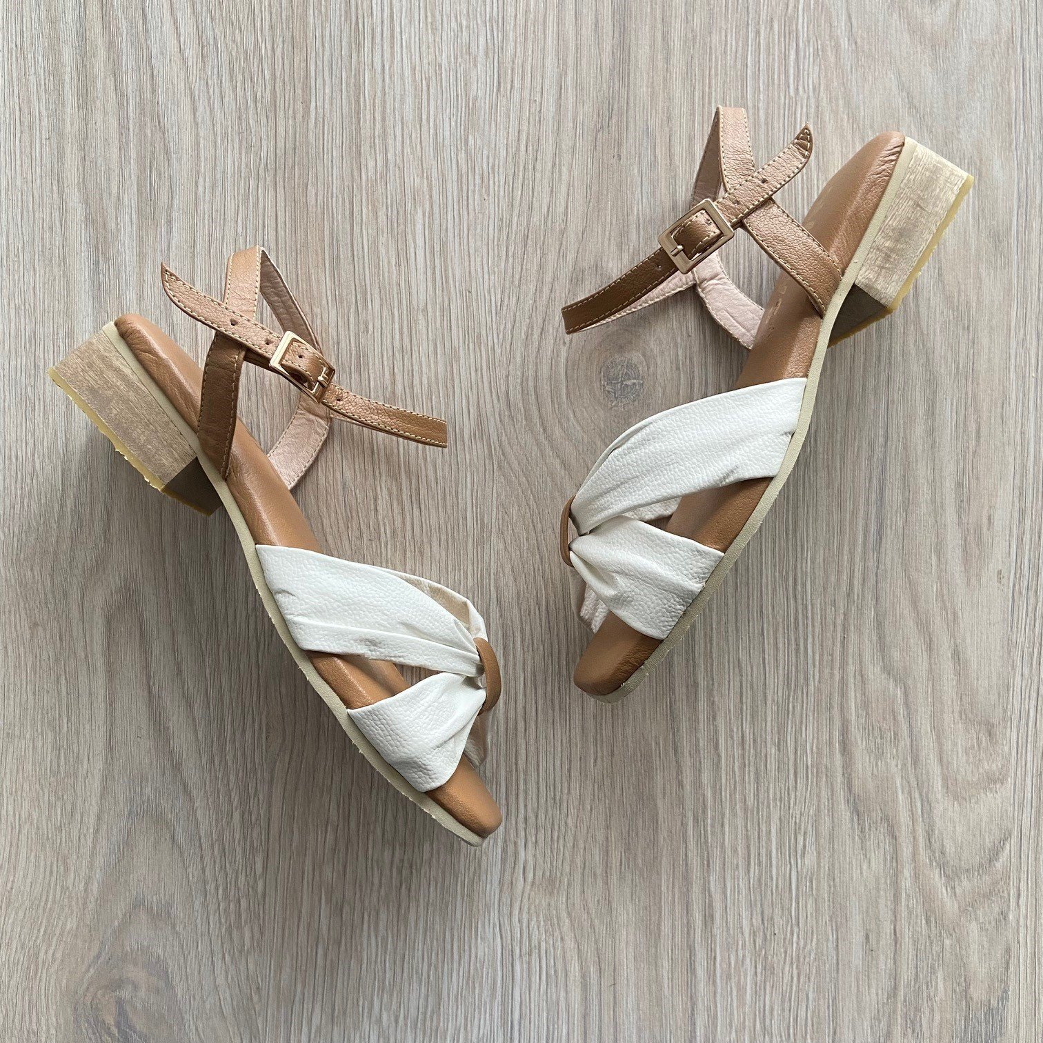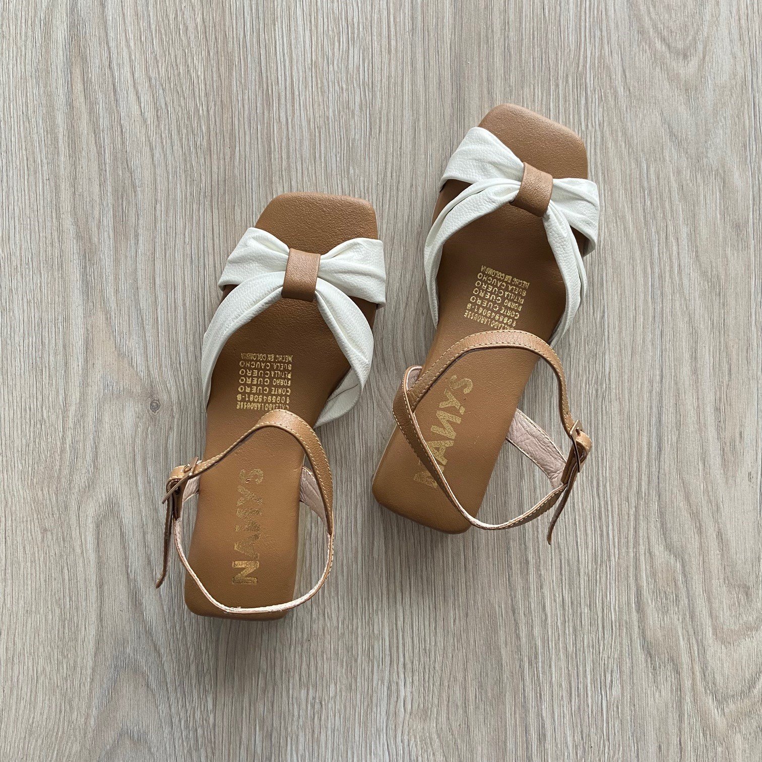 Sandalias bajitas talco con miel en cuero. Con pulsera color miel. Tacón 2.5 cm en madera. Forradas en cuero. Hechas en Colombia.