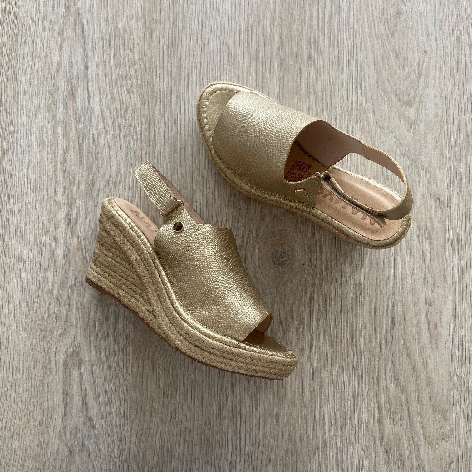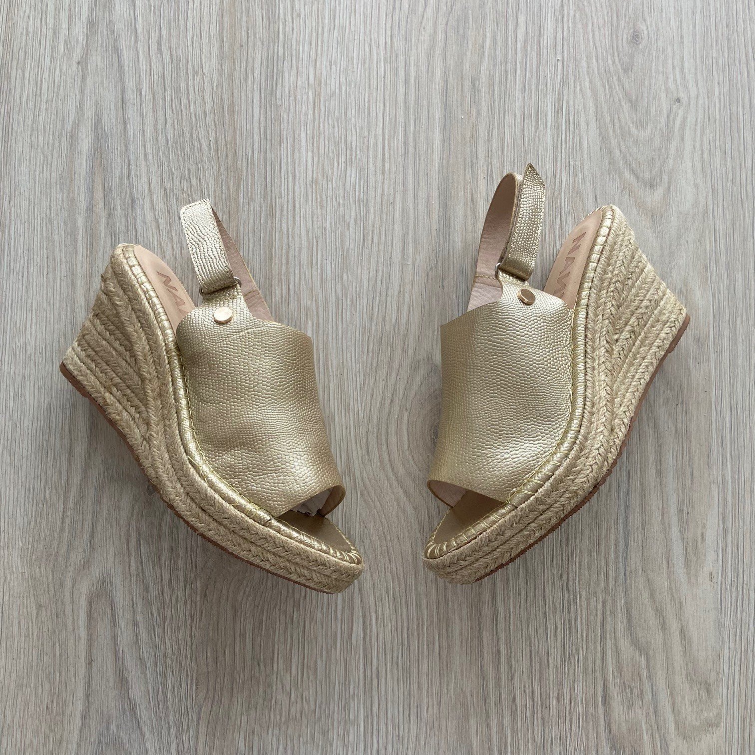 Sandalias despuntadas doradas en cuero con plataforma forrada en yute. Tacón 5.5 más plataforma. Forradas en cuero. Hechas en Colombia.