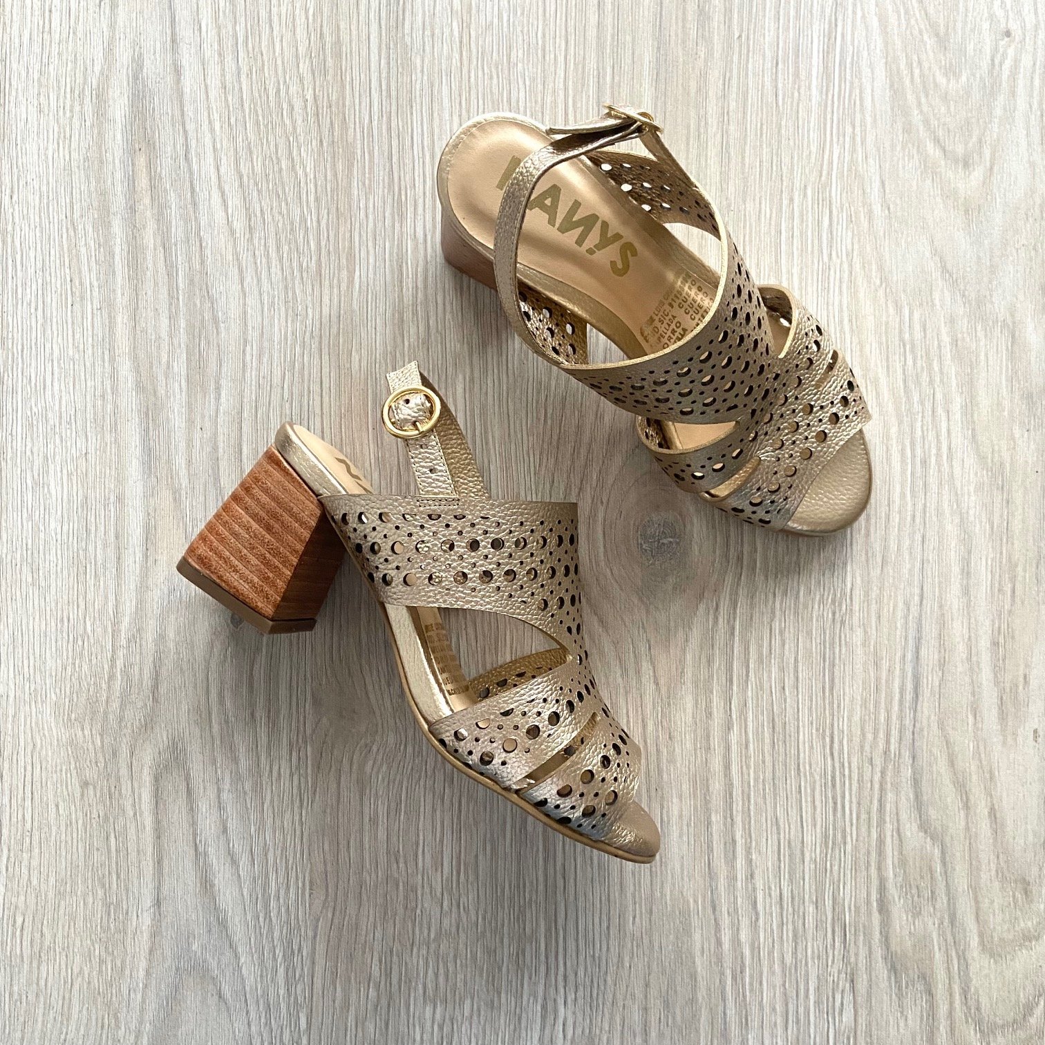 Sandalias doradas en cuero con tacón en vira