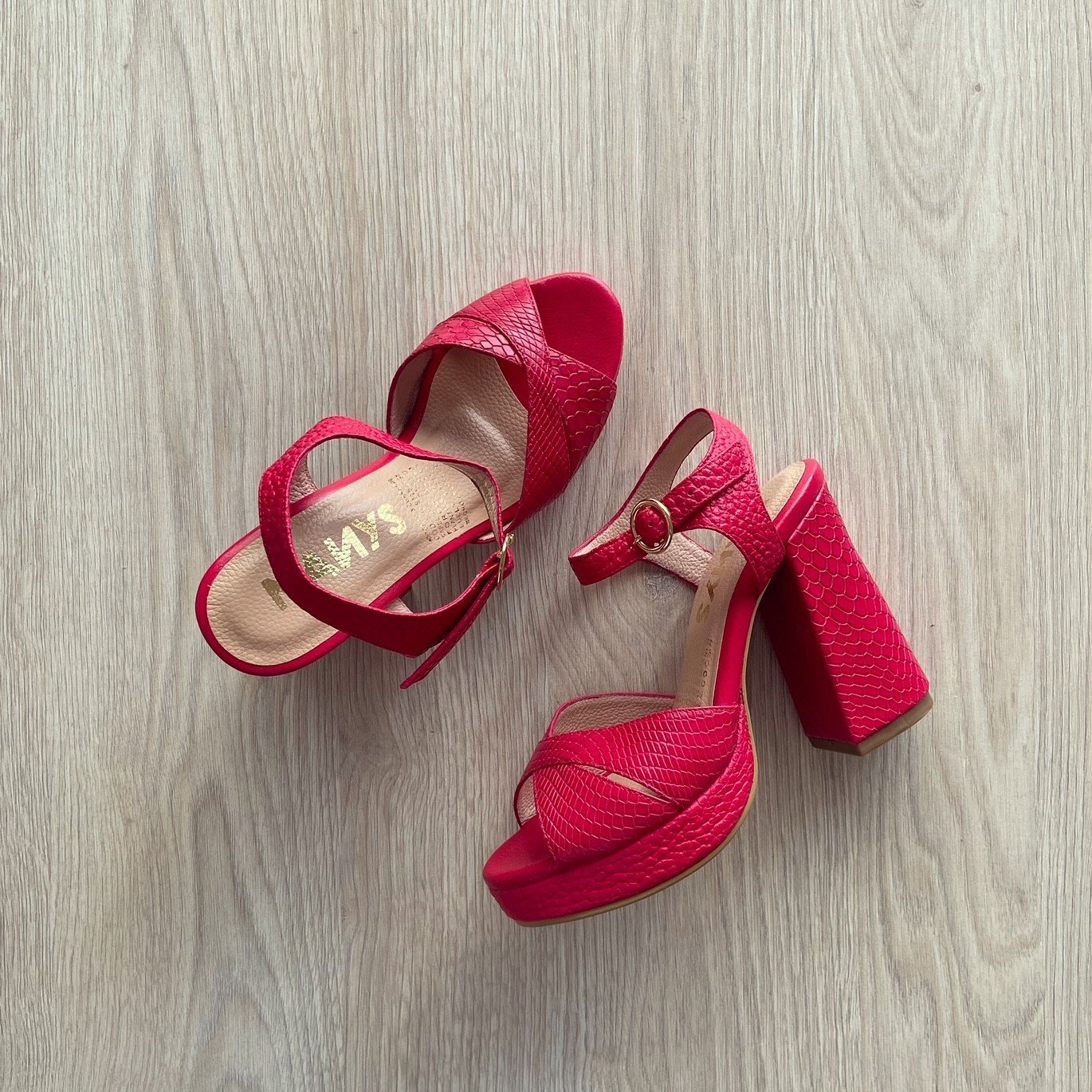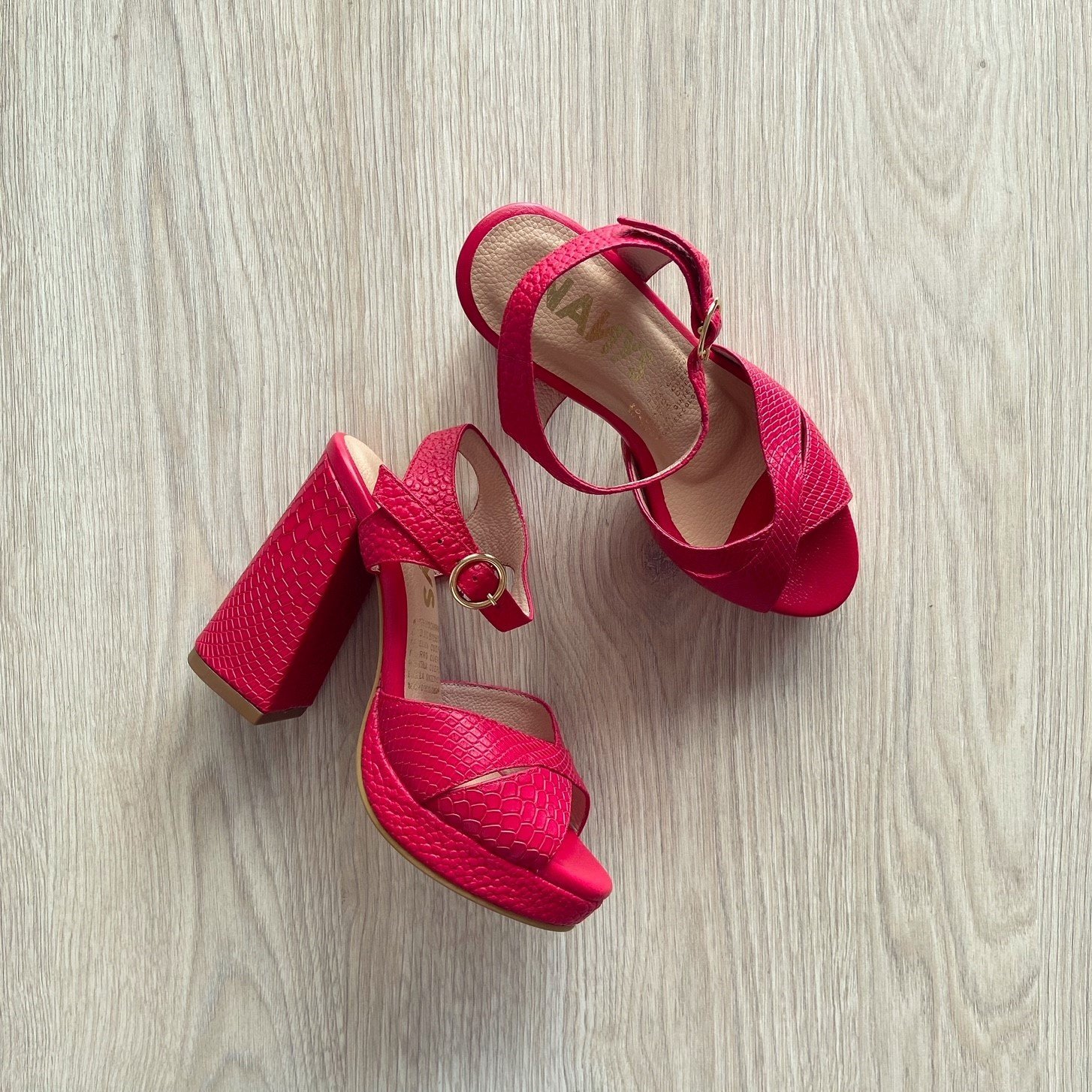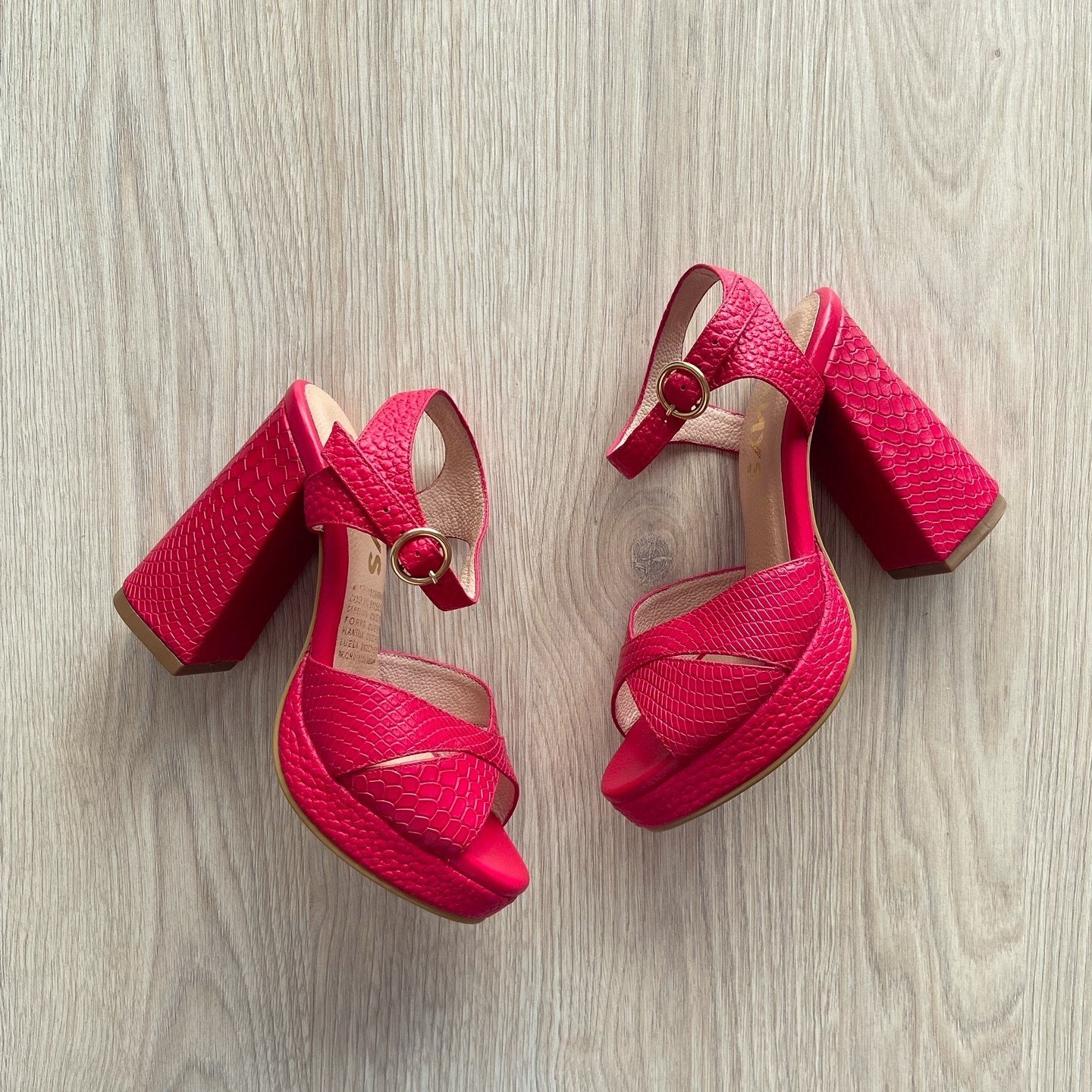 Sandalias magenta en cuero con plataforma. Tacón 7.5 cm más plataforma 10. Forrados en cuero. Hechos en Colombia.