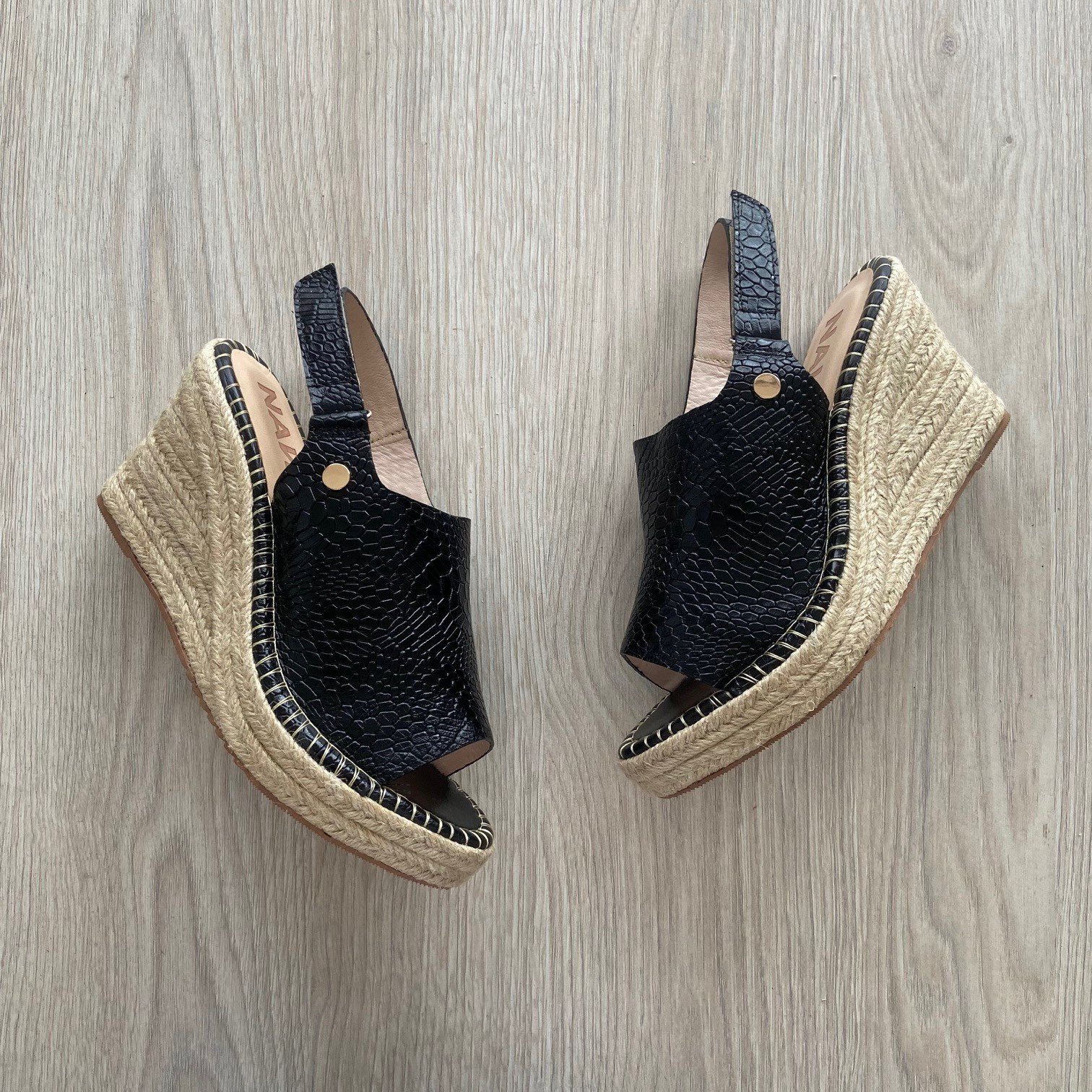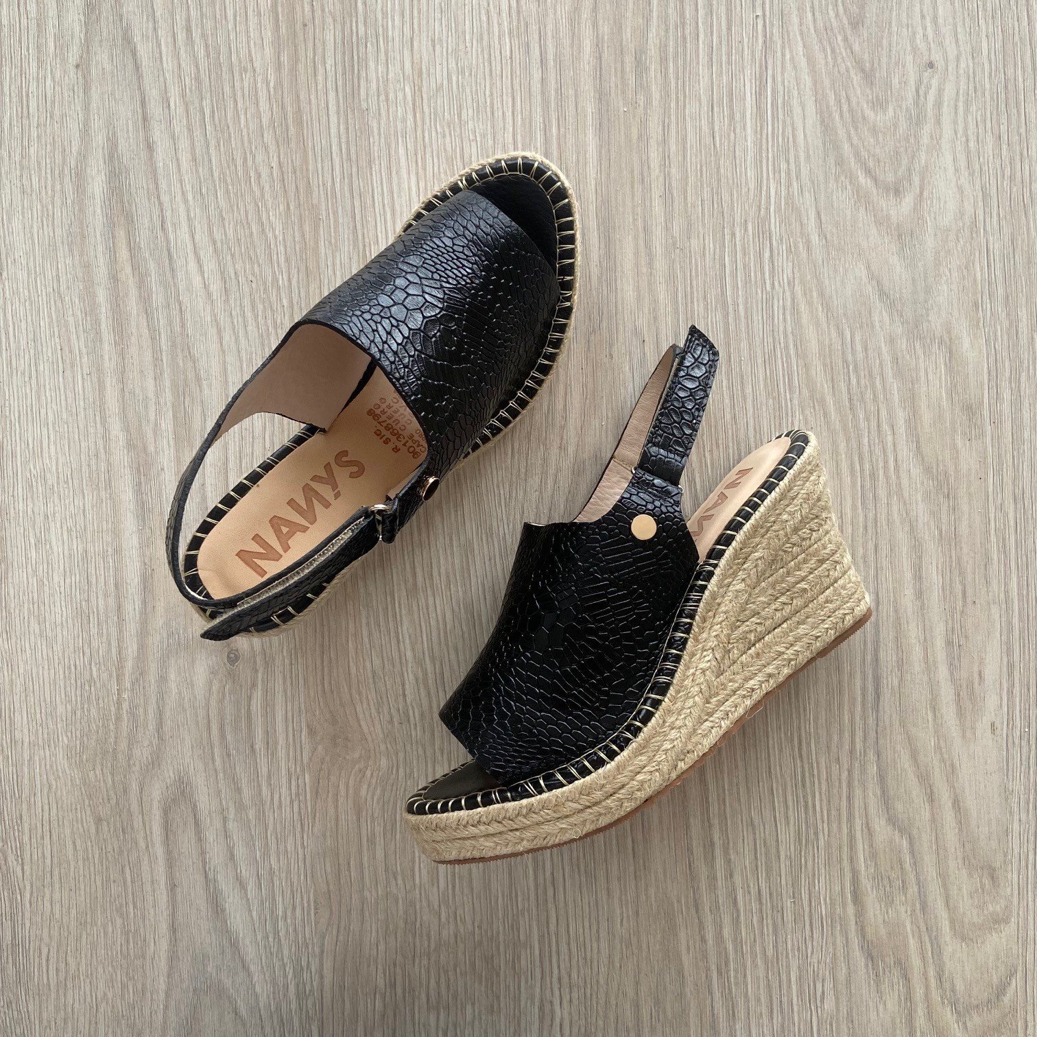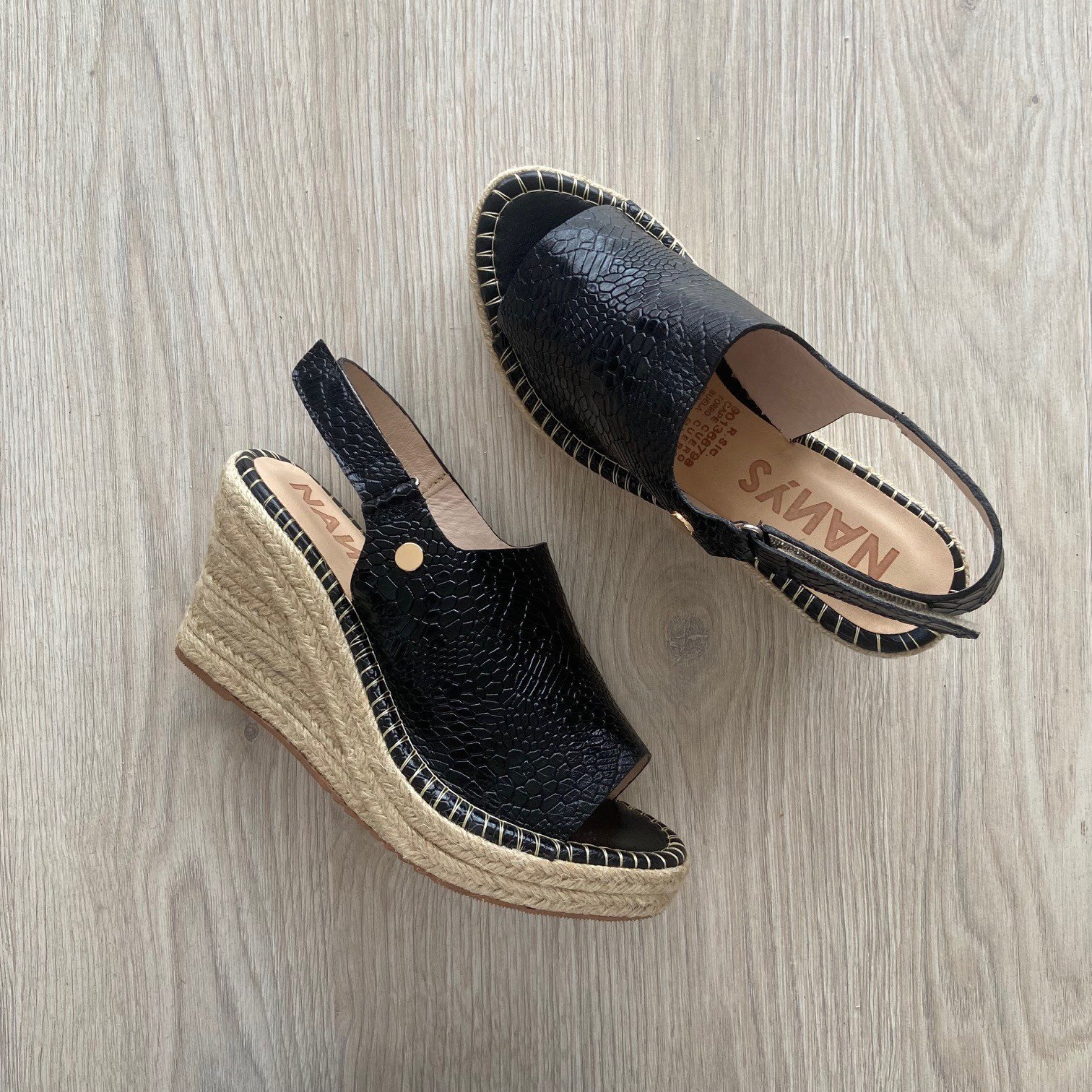 Sandalias despuntadas negras en cuero con plataforma forrada en yute. Tacón 5.5 más plataforma. Forradas en cuero. Hechas en Colombia.