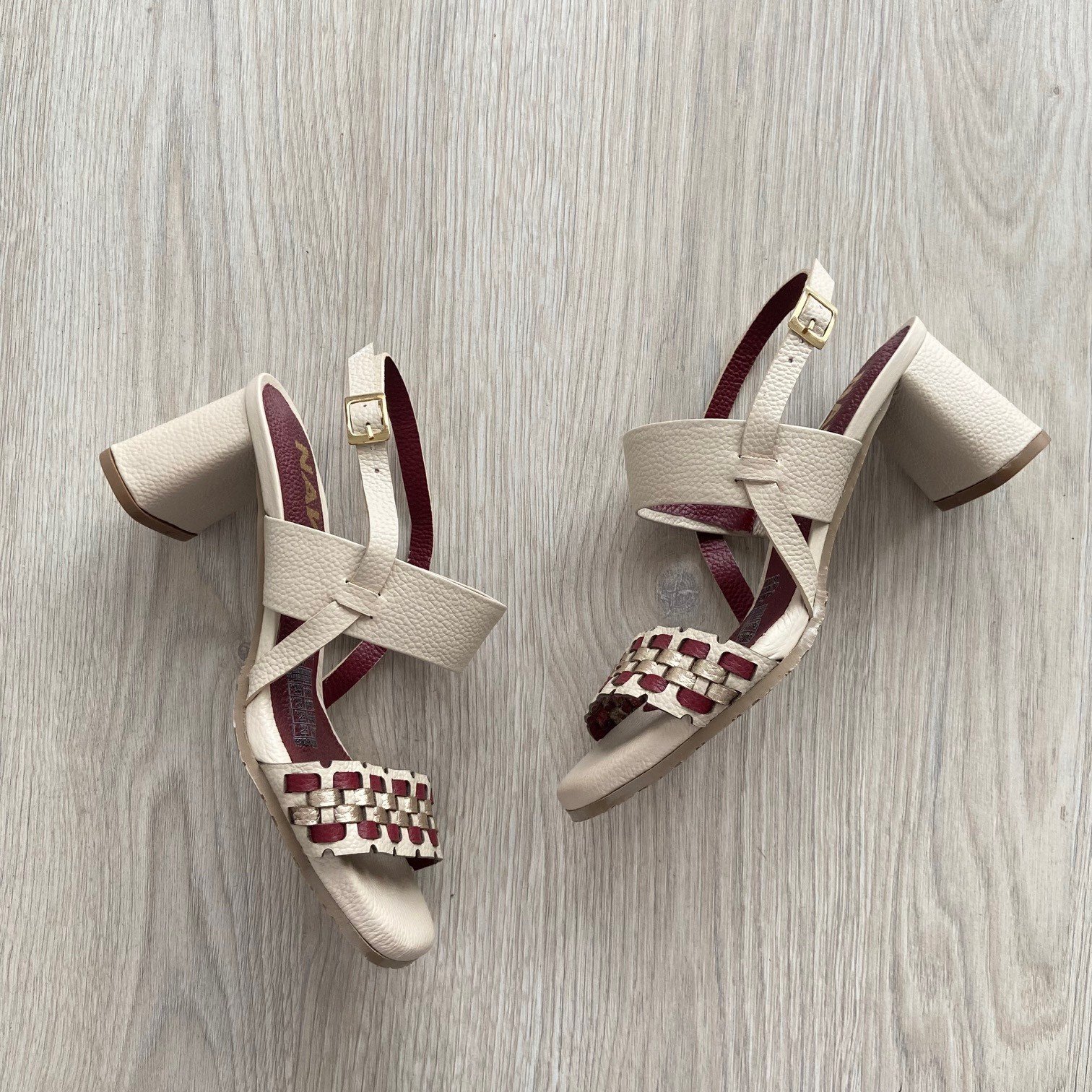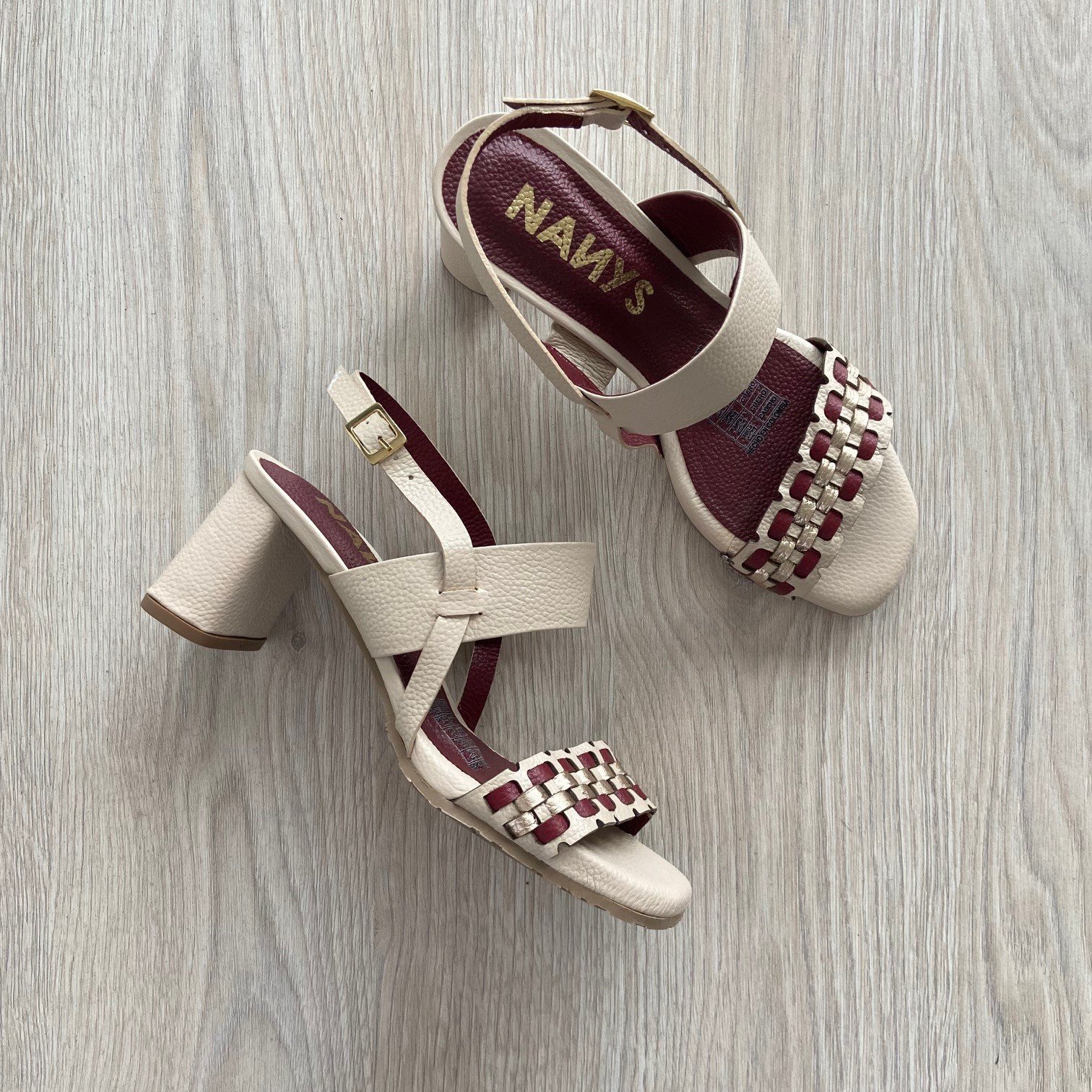 Sandalias nude con vinotinto y dorado en cuero. Tacón 5.5, con suela en goma antideslizante. Forradas en cuero. Hechas en Colombia.