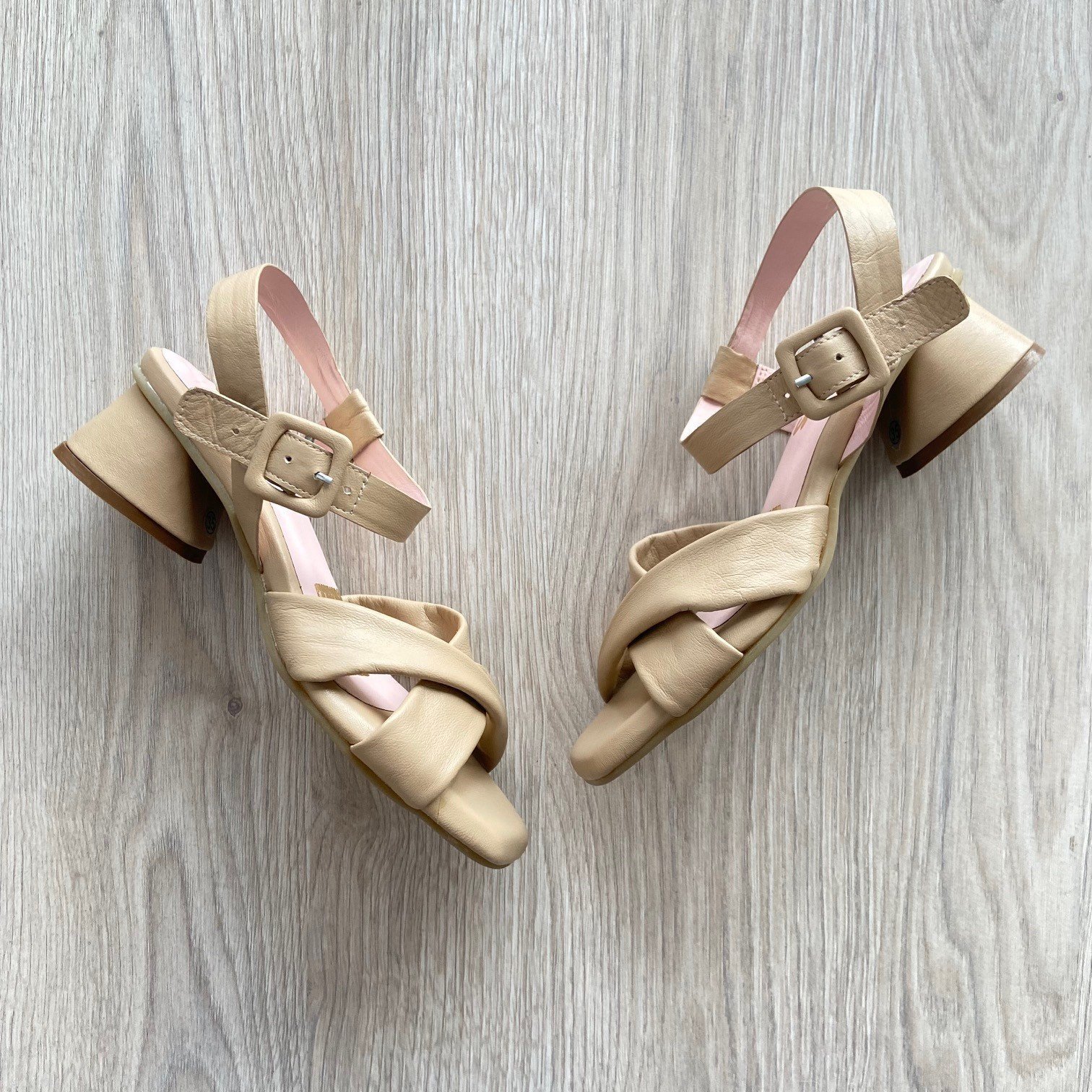 Sandalias pardo en cuero tipo confección. Forradas en cuero. Tacón 3.5 cm. Con hebilla. Suela en goma antideslizante. Hechas en Colombia.