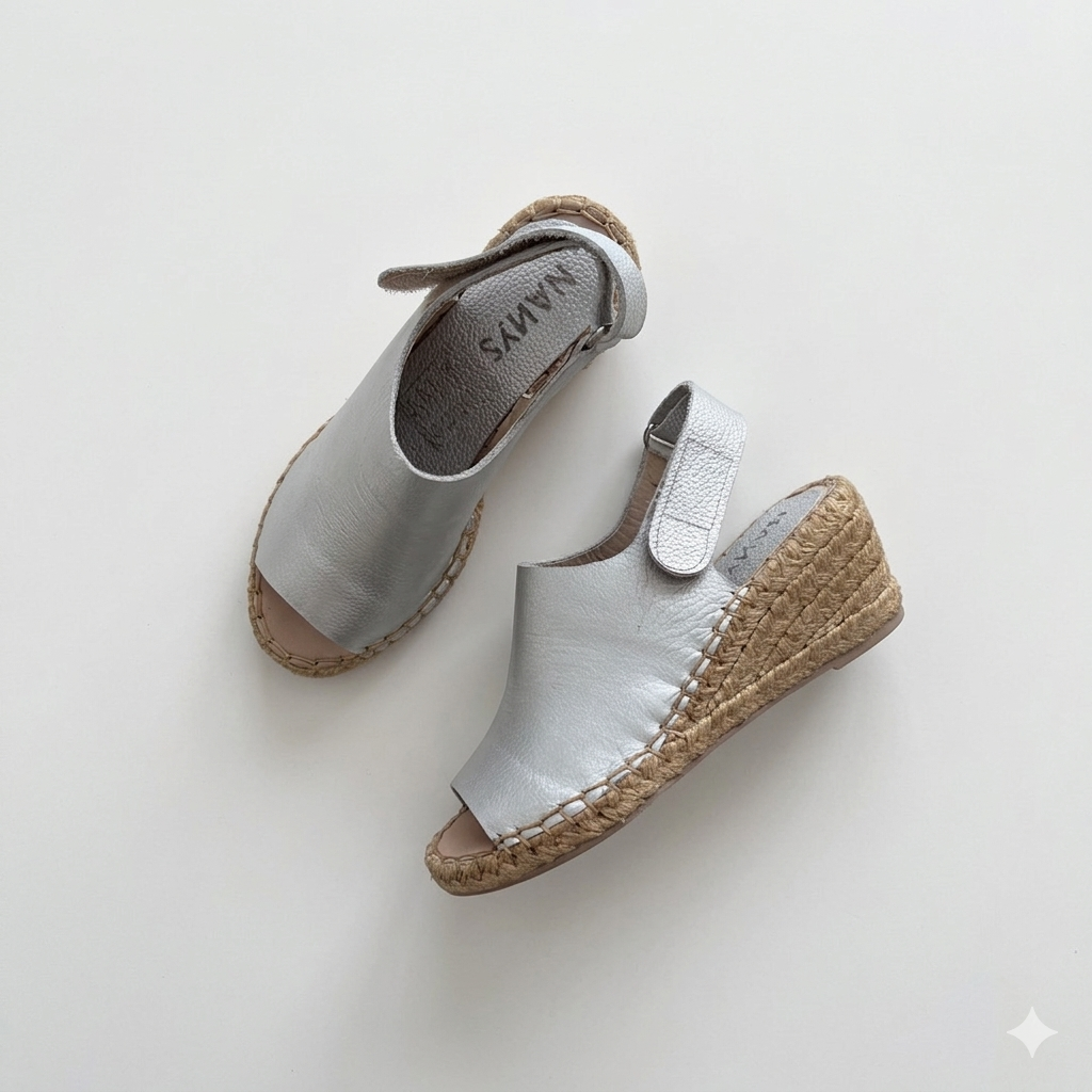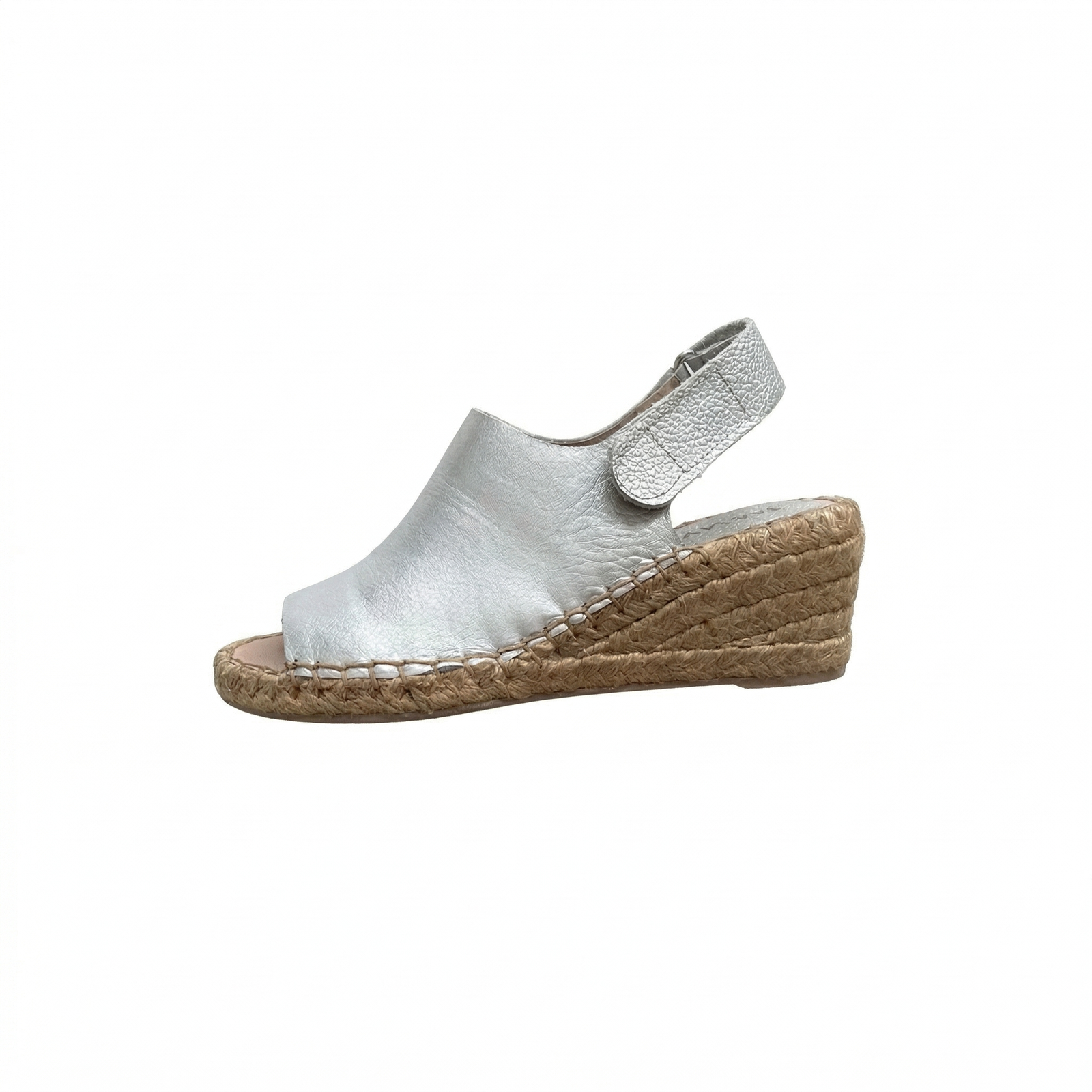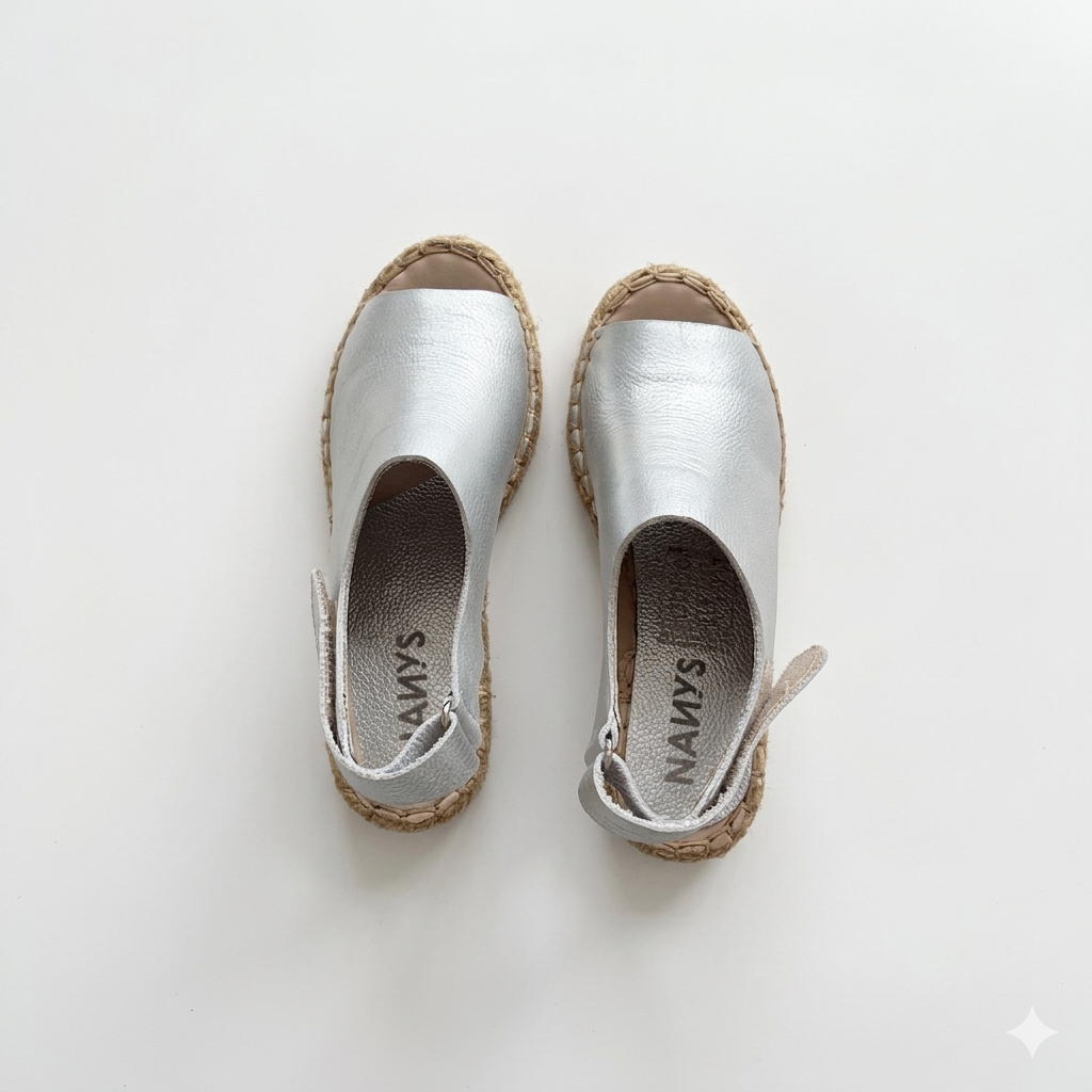 Sandalias plateadas en cuero con plataforma en yute. Con plataforma 3.5 con yute. Forradas en cuero. Hechas en Colombia.