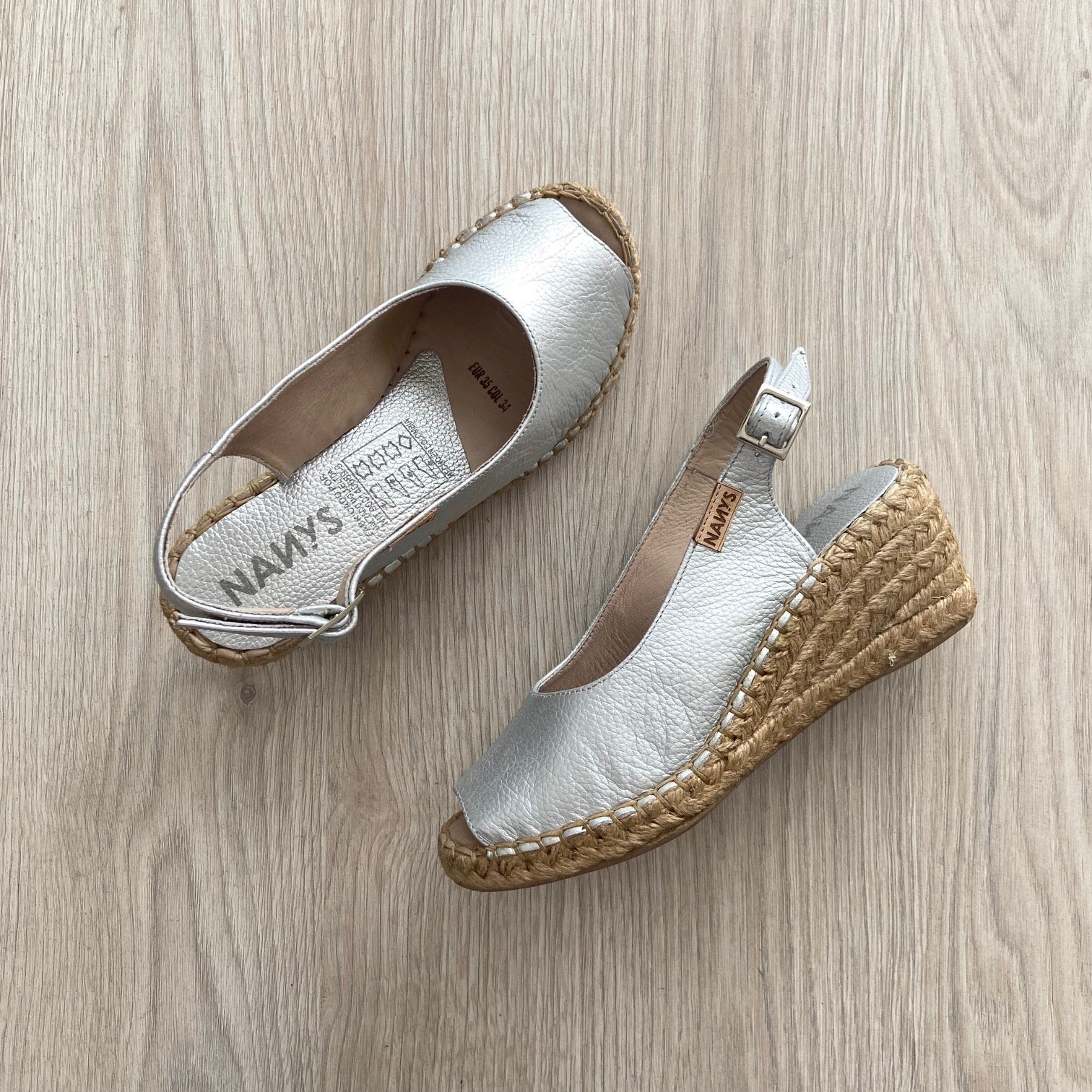 Sandalias plateadas en cuero despuntadas. Con hebilla. Con plataforma 5.5 con yute. Forradas en cuero. Hechas en Colombia.