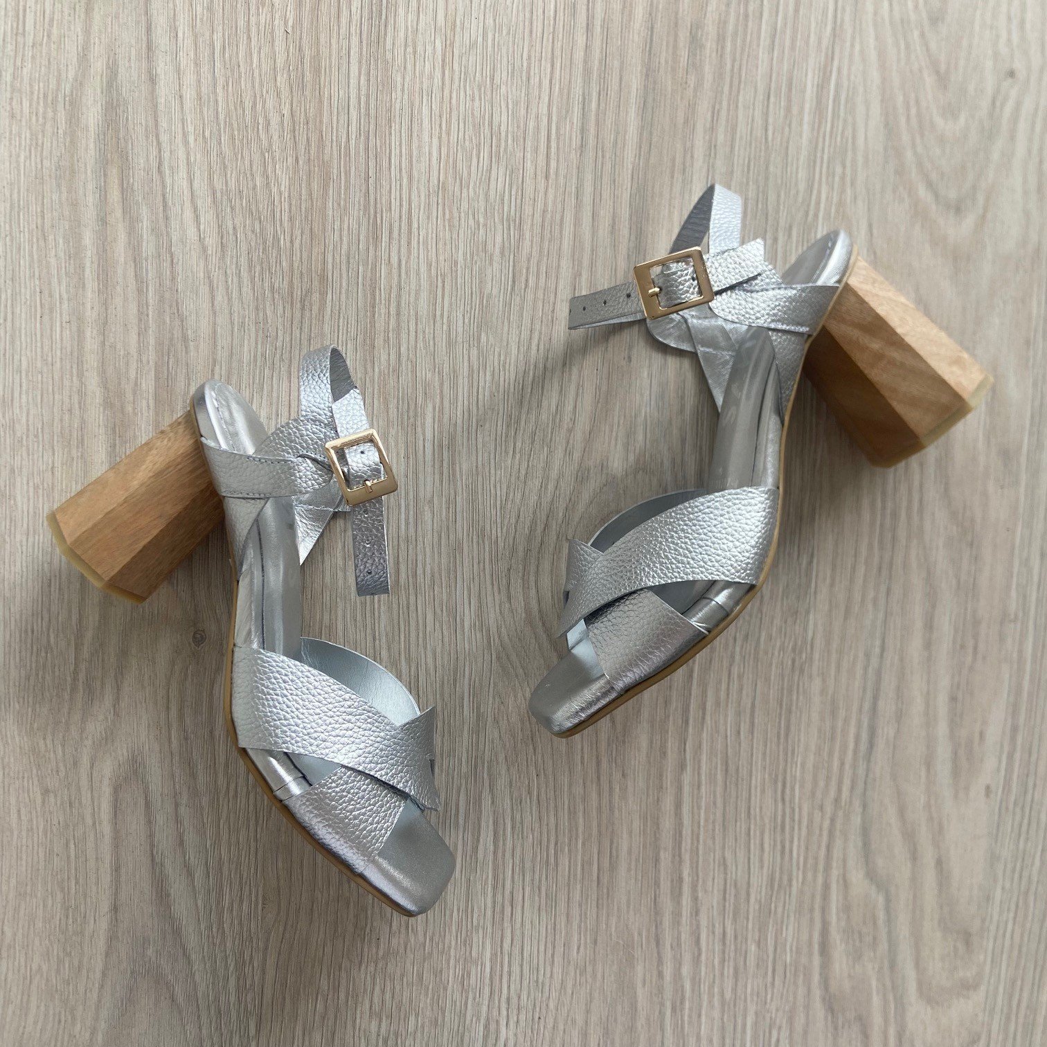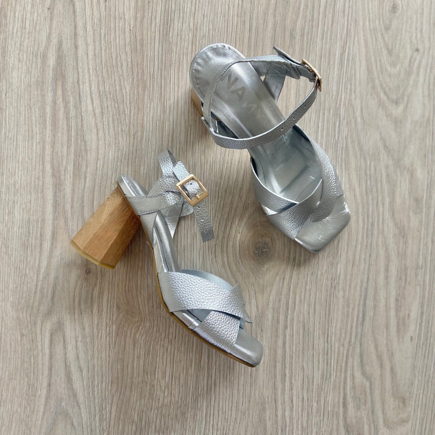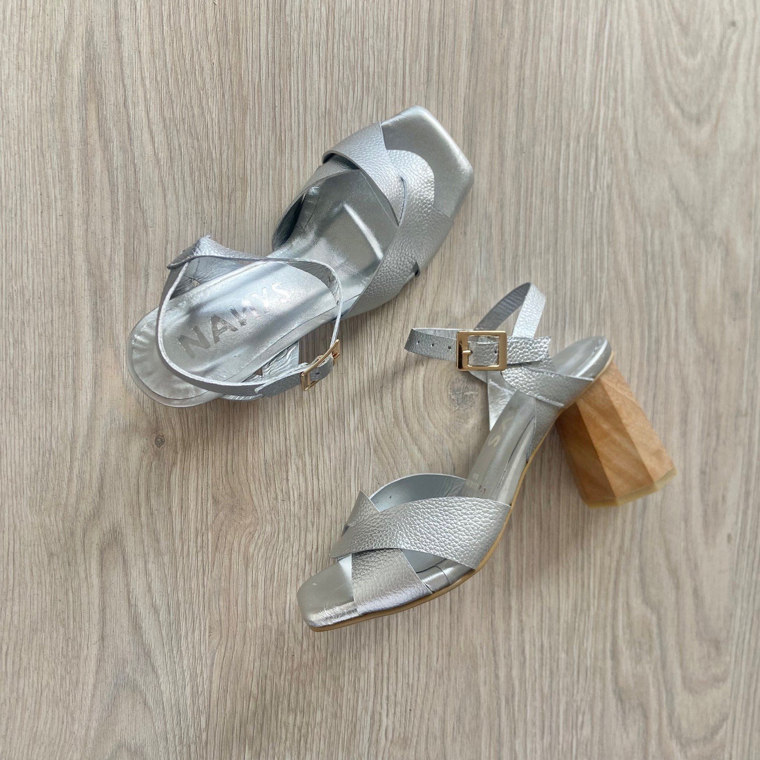 Sandalias plateadas en cuero tipo folia. Con hebilla. Tacón 7.5. Forradas en cuero. Hechas en Colombia.