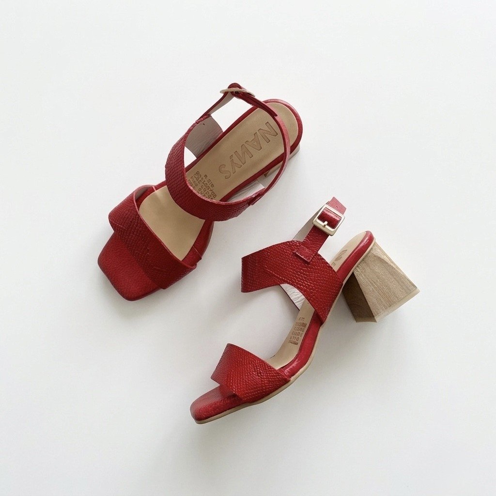 Sandalias rojas en cuero con hebilla. Tacón 5.5 en madera con tapa en goma. Forradas en cuero. Hechas en Colombia.