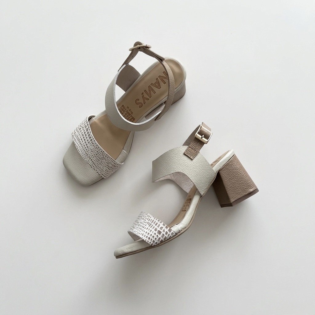 Sandalias talco con taupe en cuero con hebilla. Tacón 5.5. Forradas en cuero. Hechas en Colombia.