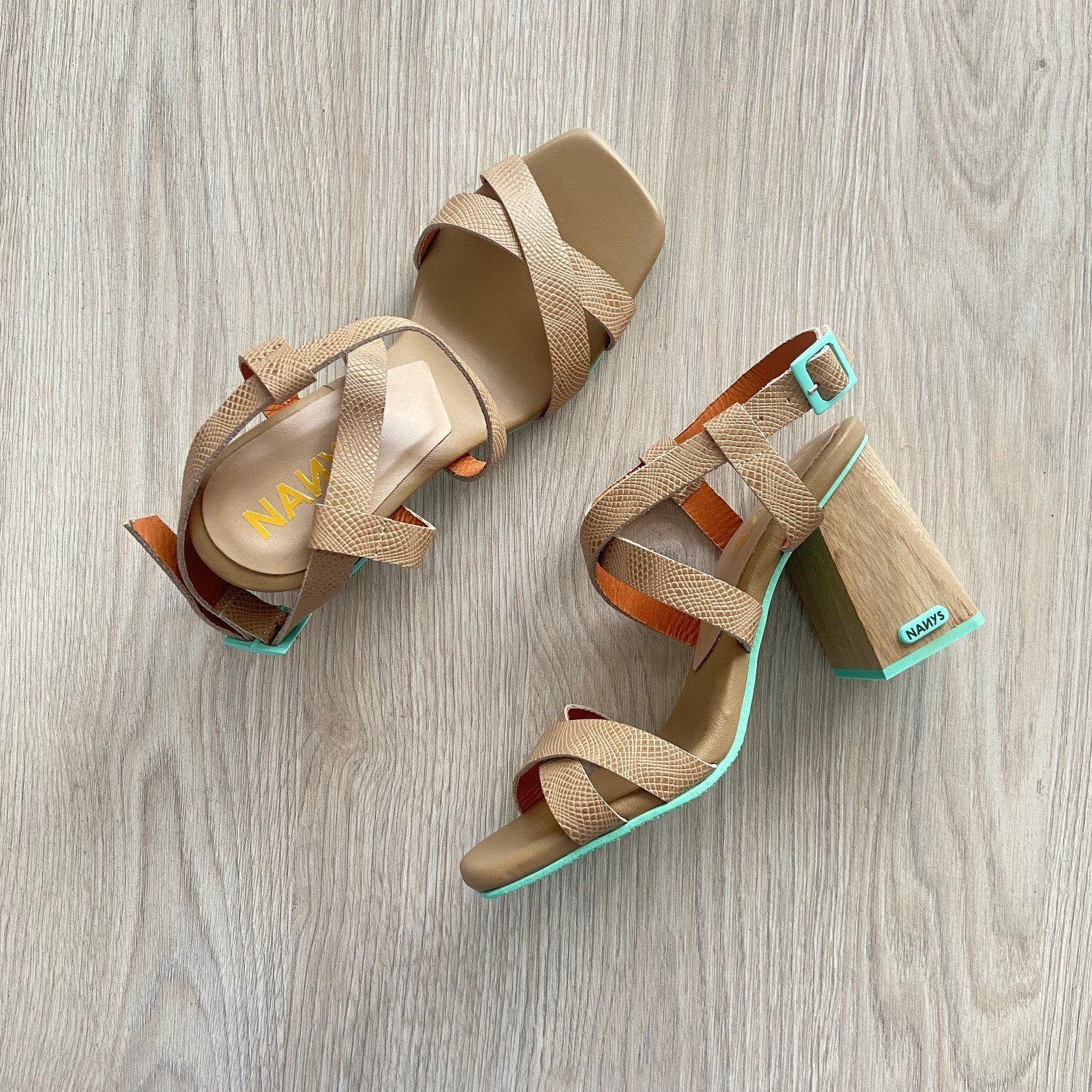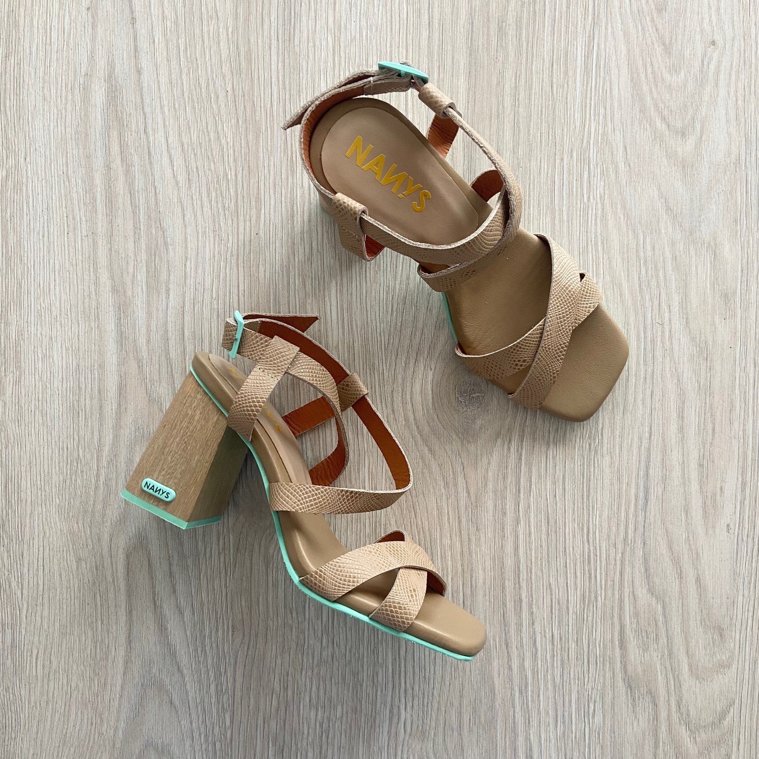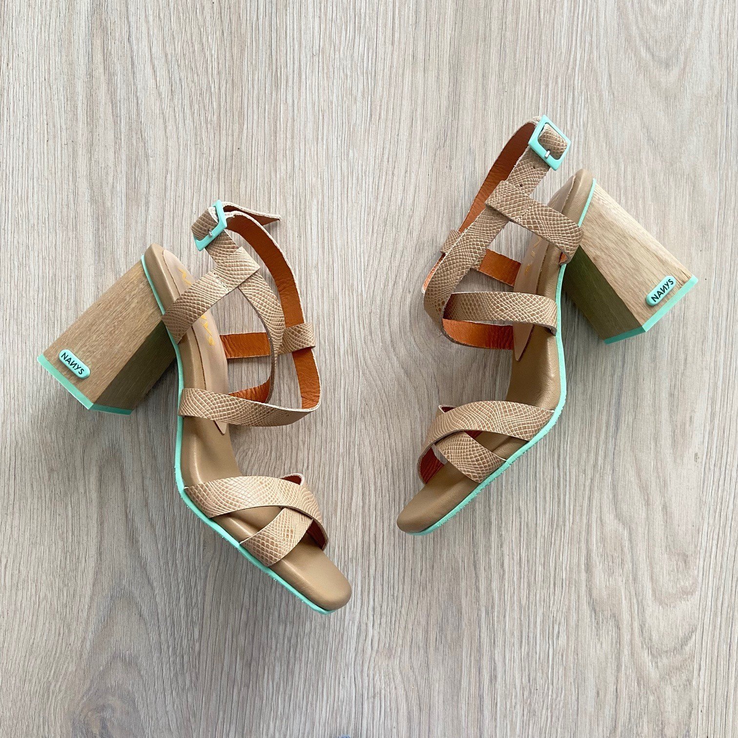 Sandalias taupe en cuero con aplique verde menta. Tacón 7.5 cm en madera. Suela en goma verde menta. Forradas en cuero. Hechas en Colombia.