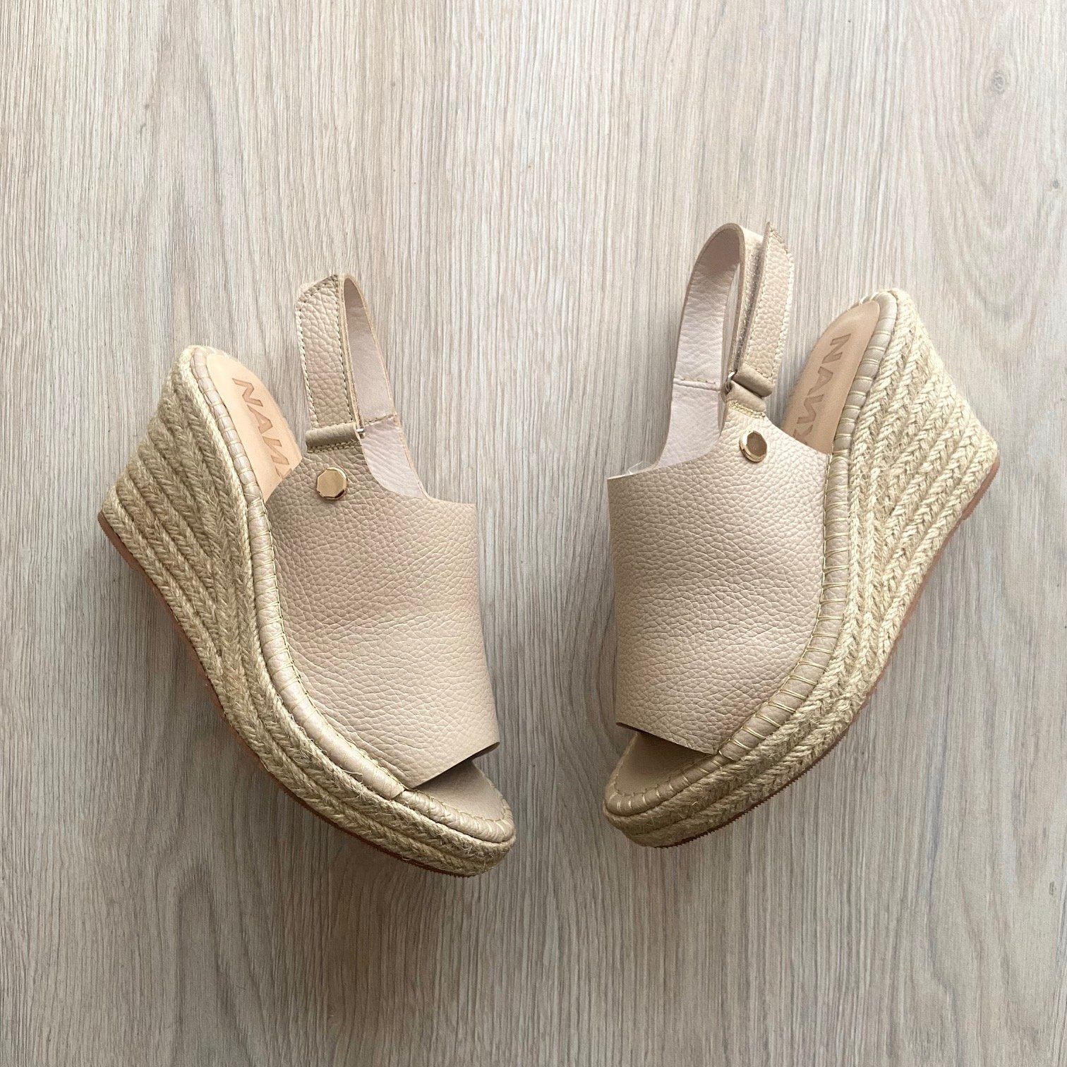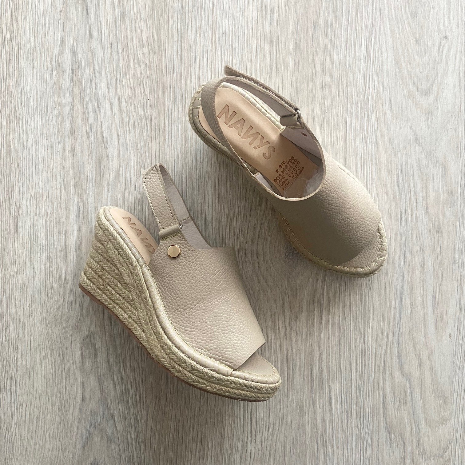 Sandalias despuntadas taupe en cuero con plataforma forrada en yute. Tacón 5.5 más plataforma. Forradas en cuero. Hechas en Colombia.