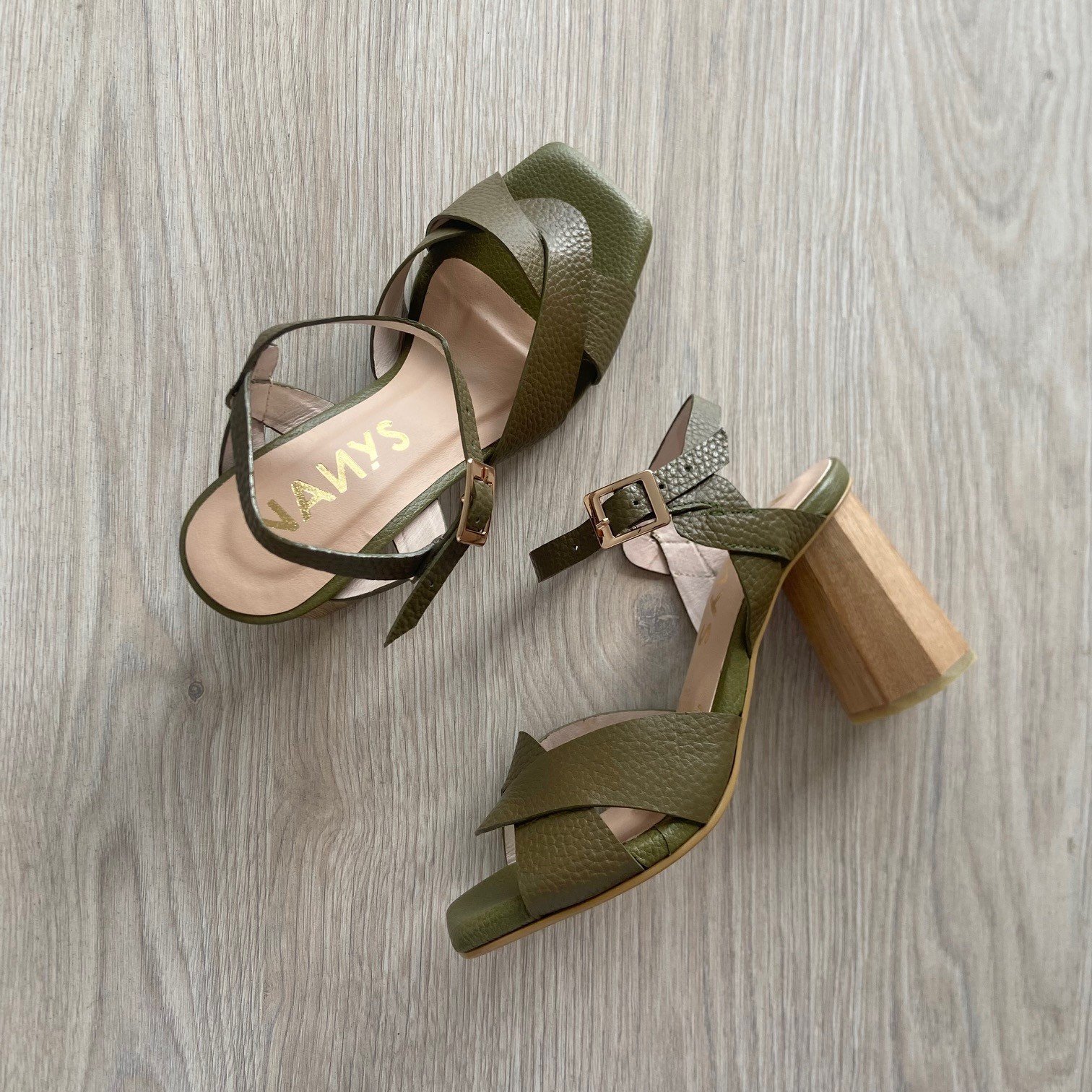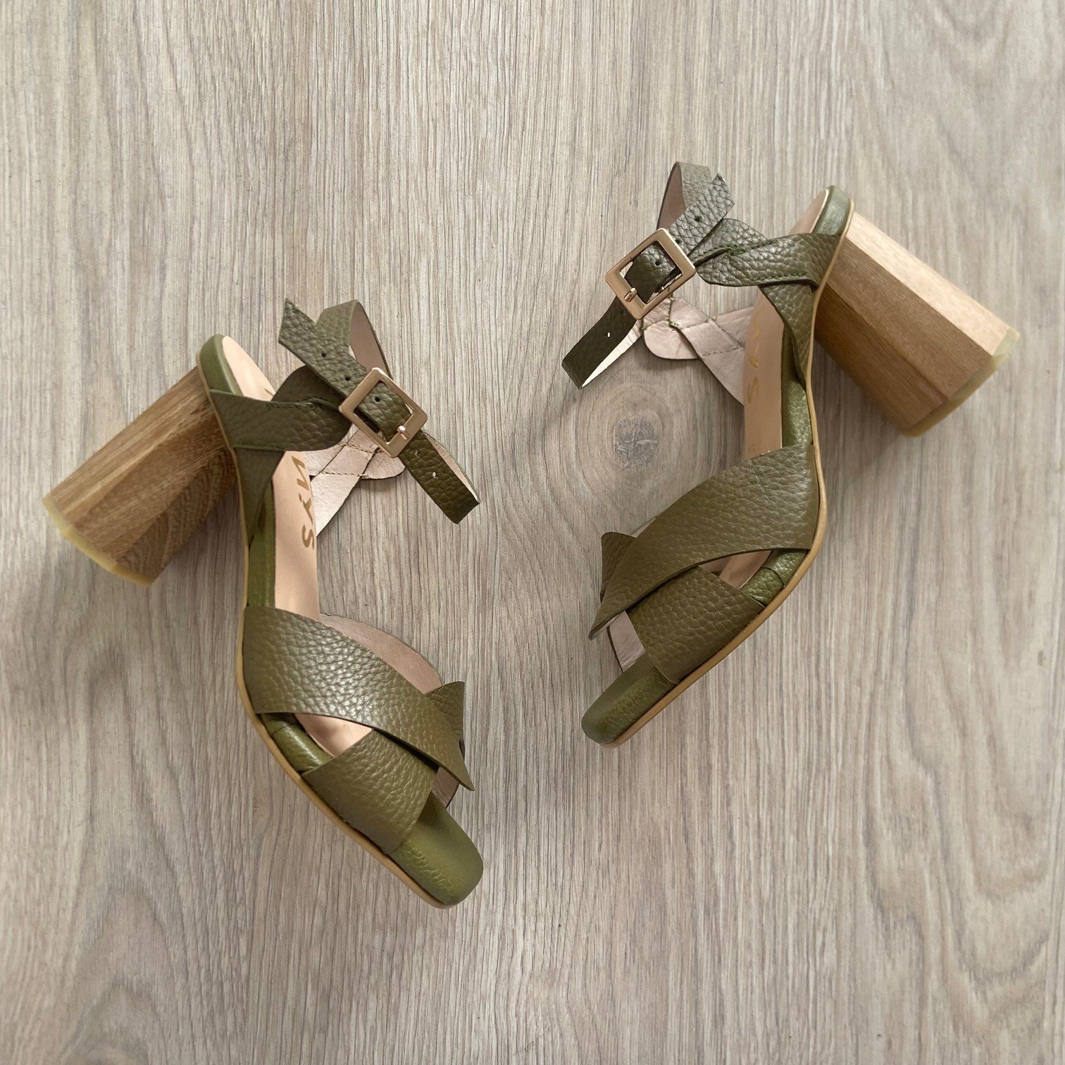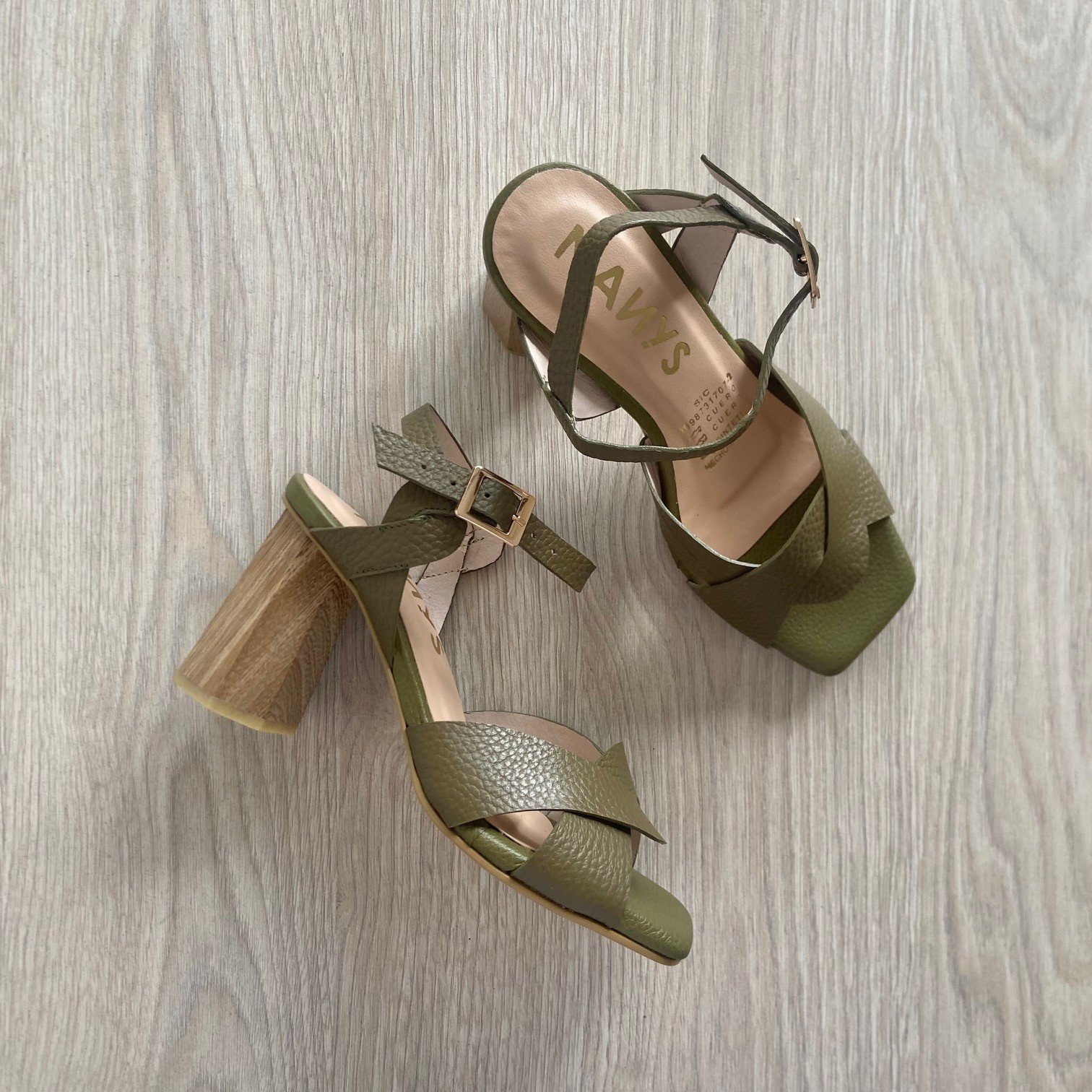 Sandalias verde en cuero. Con hebilla. Tacón 7.5. Forradas en cuero. Hechas en Colombia.