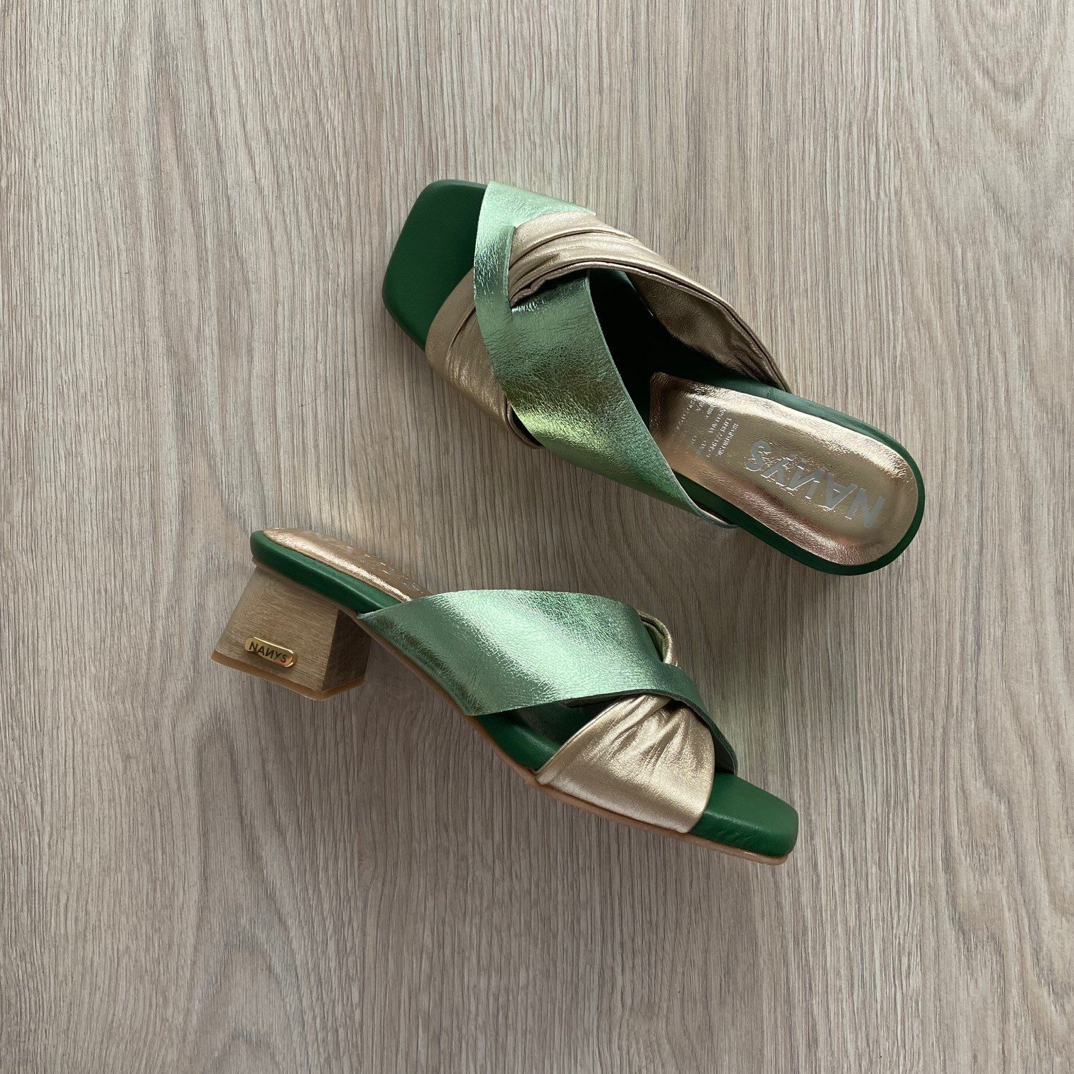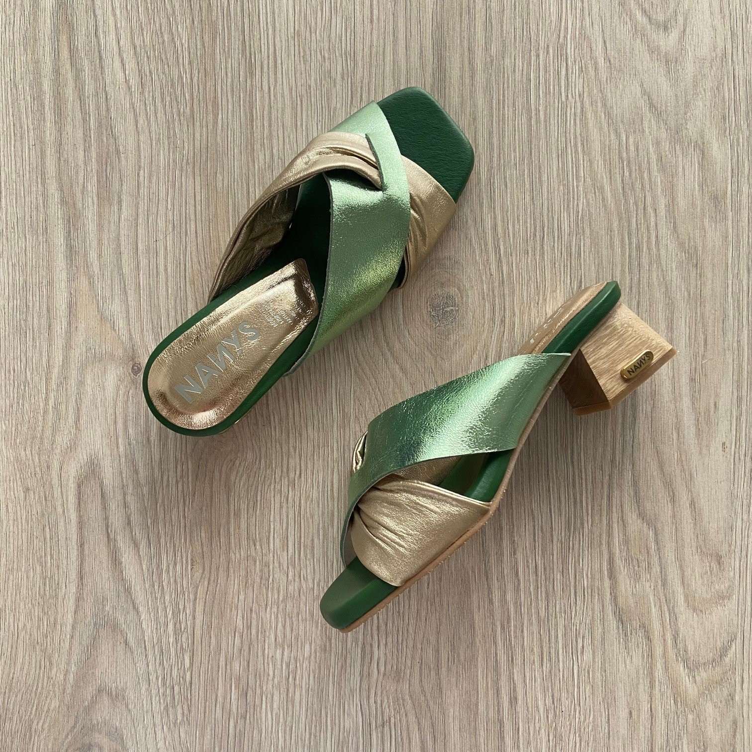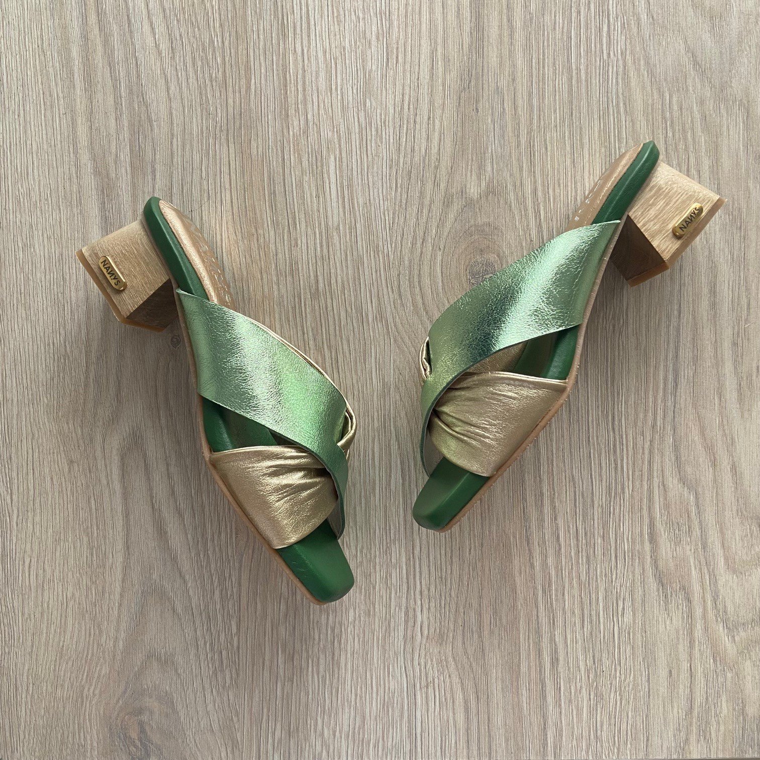Sandalias verde metalizadas con dorado en cuero. Tacón3.5 cm en madera. Tapa y suela en goma antideslizante. Forrada en cuero. Hechas en Colombia.