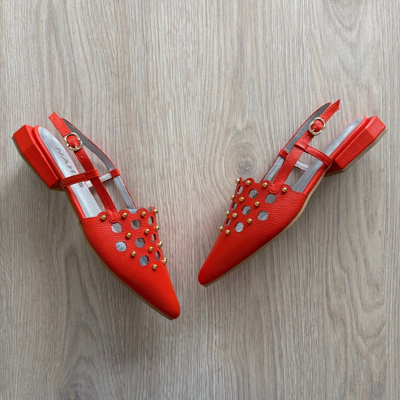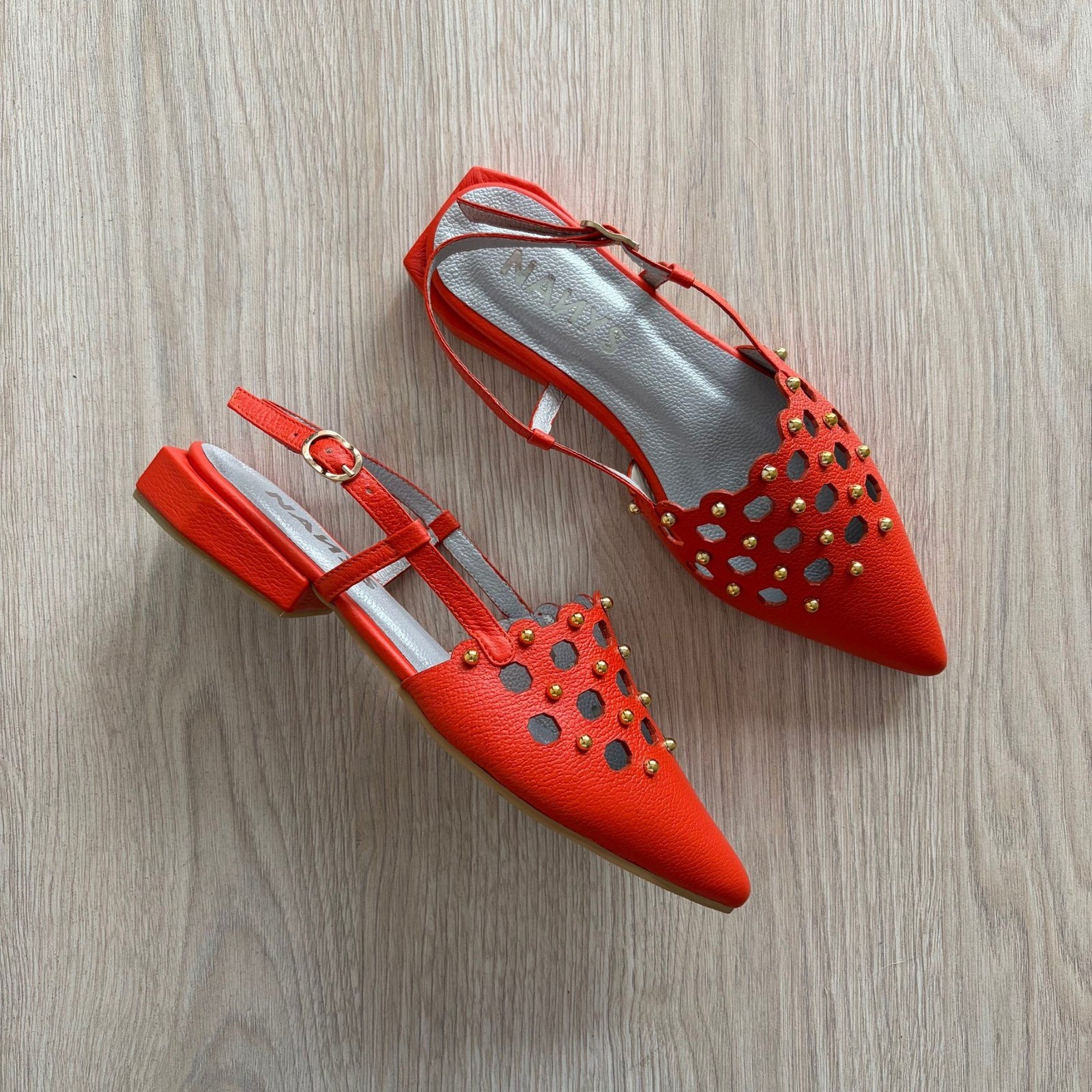 Sueco naranja en cuero con taches dorados. Con hebilla. Tacón 1.5. Forrados en cuero.