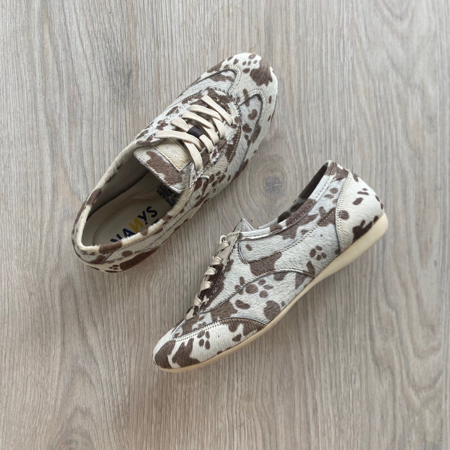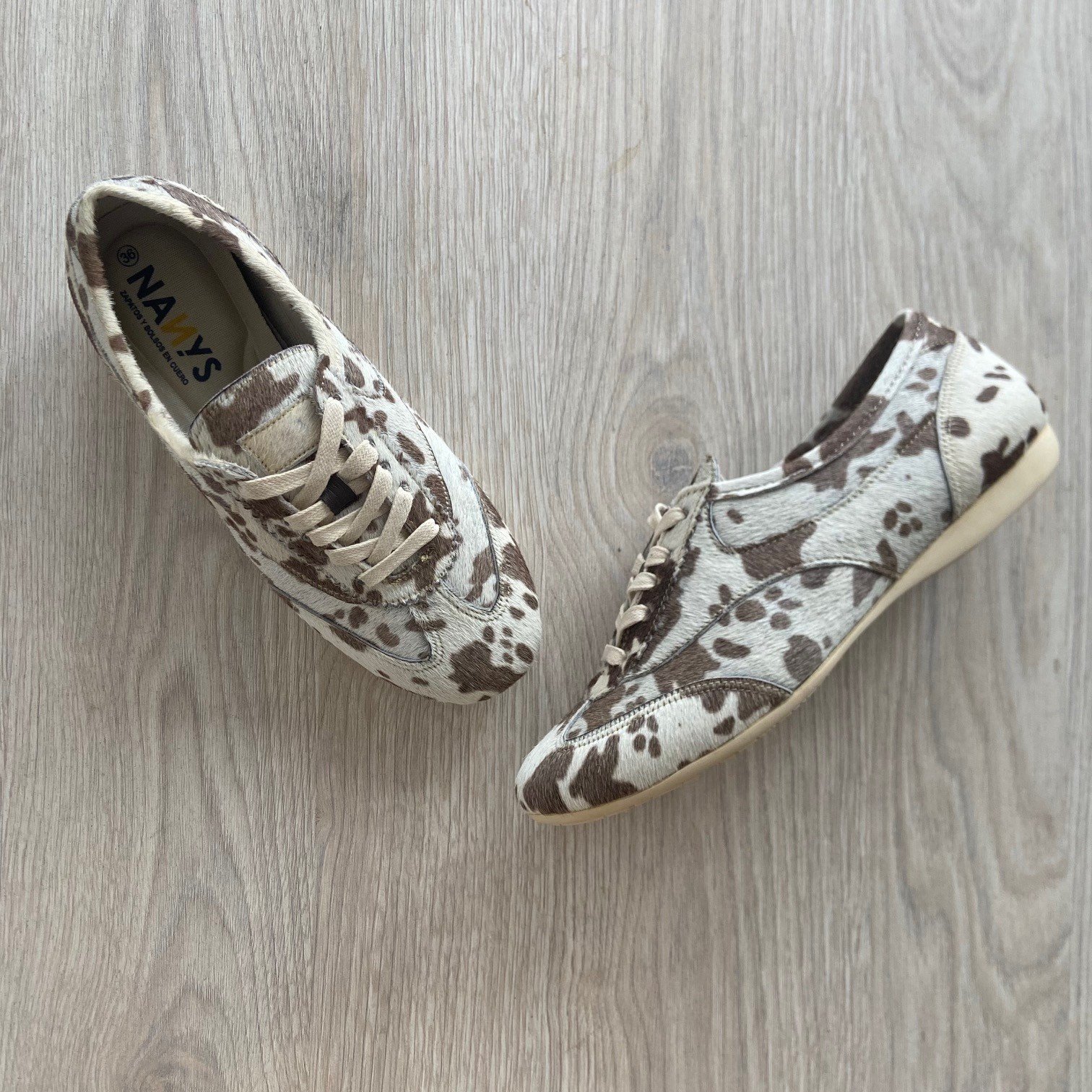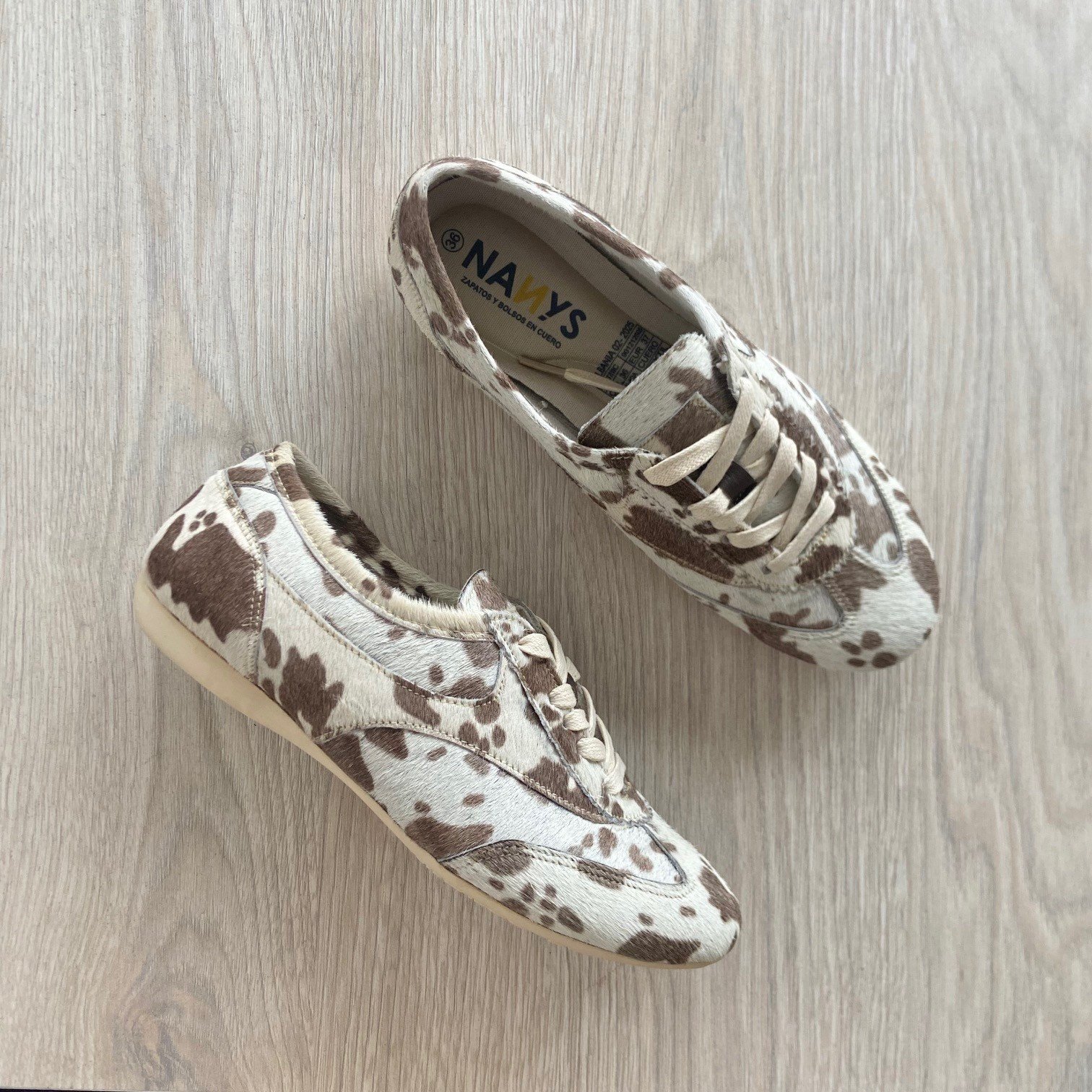 Tenis animal print vaca en cuero peludo. Forrados en textil. Plantilla ergonomica. Cordones encerados. Hechos en Colombia.