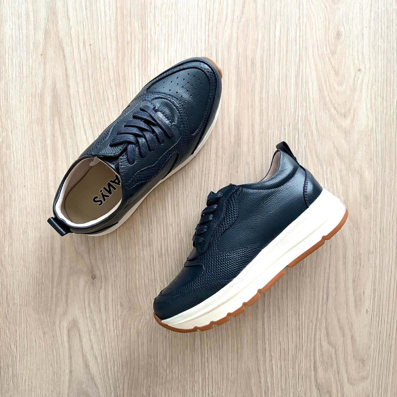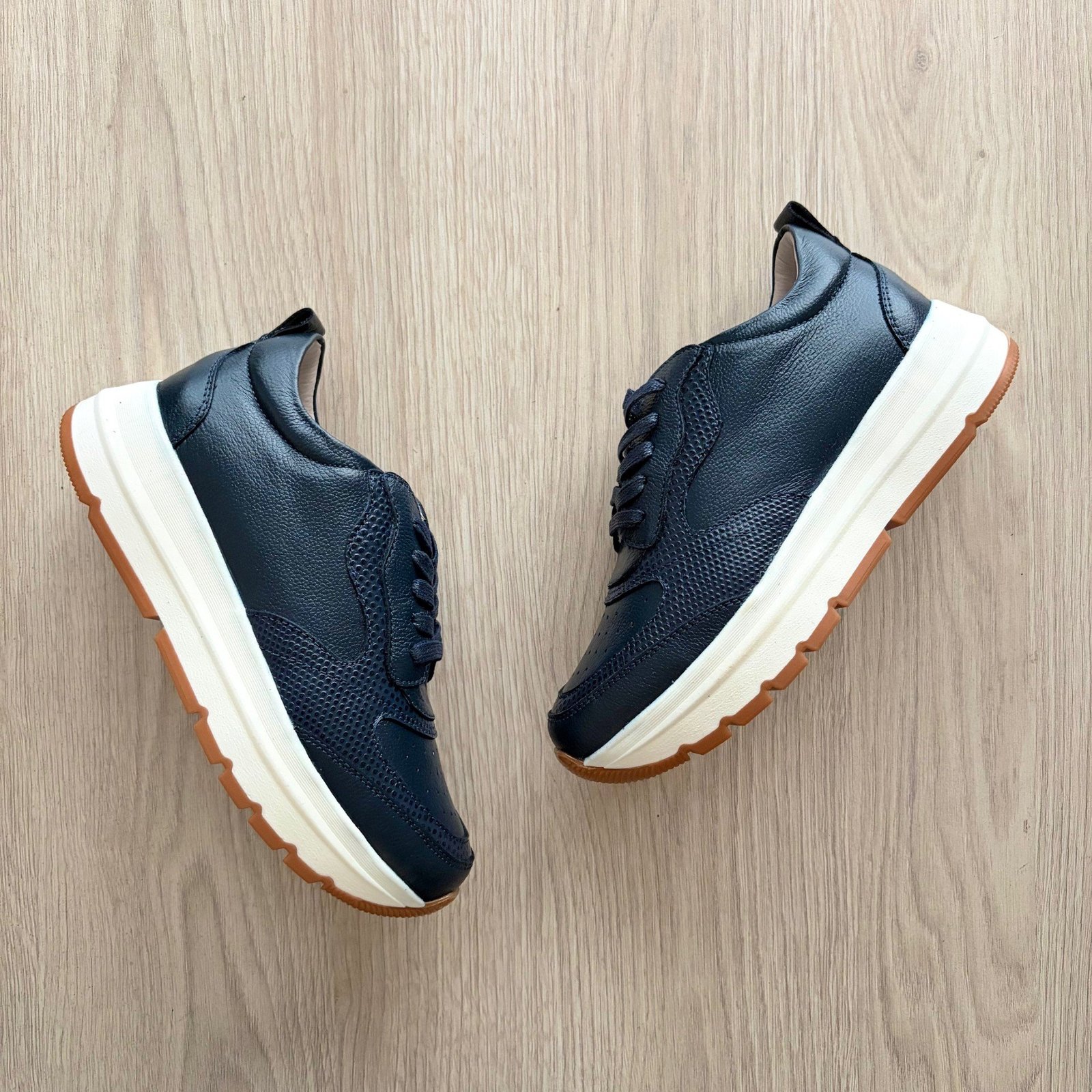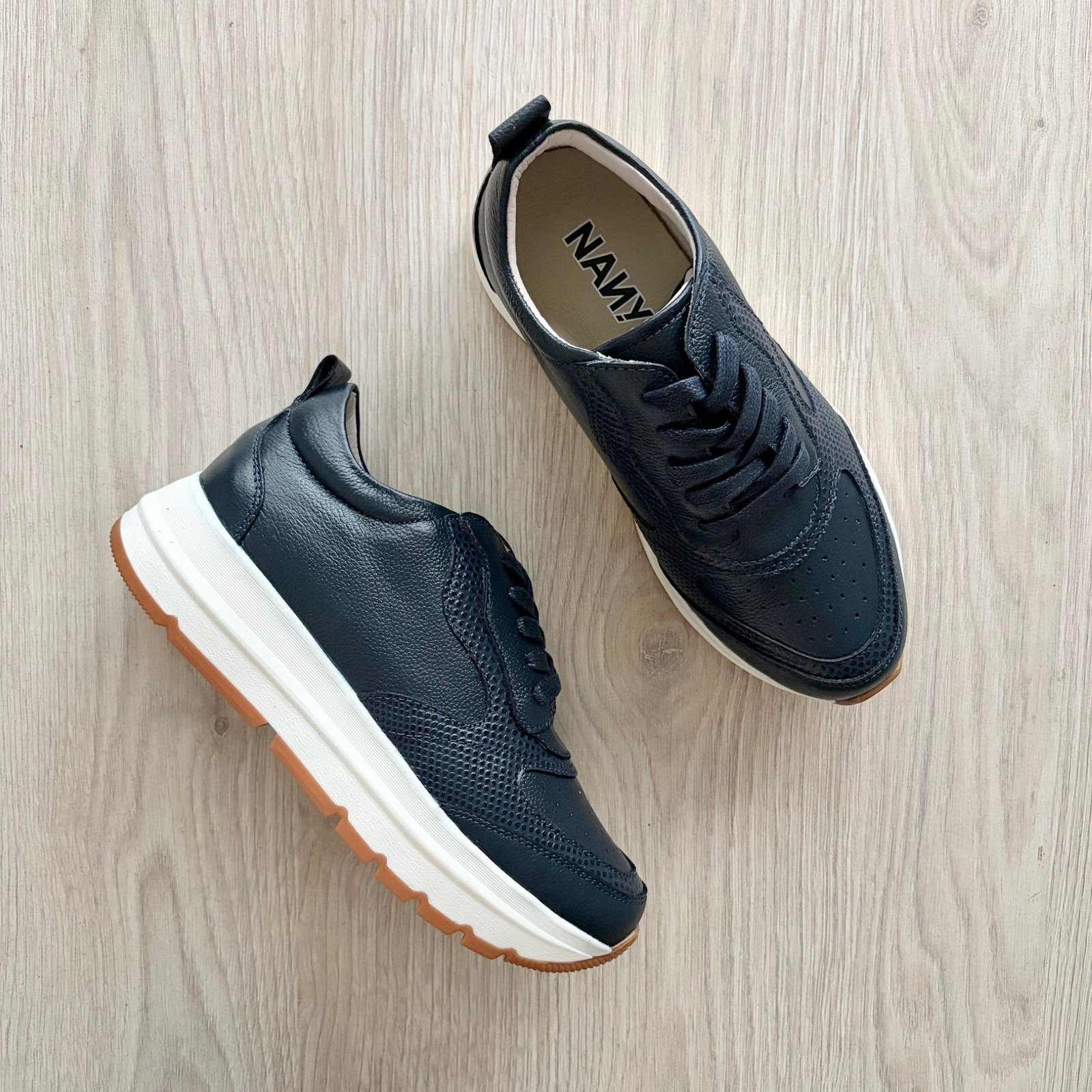 Tenis azules en cuero con suela alta. Forrados en cuero. Cordones encerados. Hechos en Colombia.