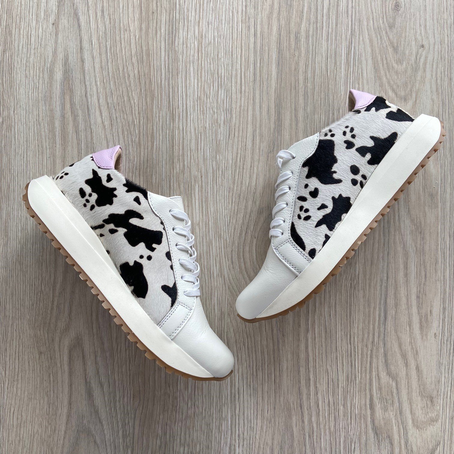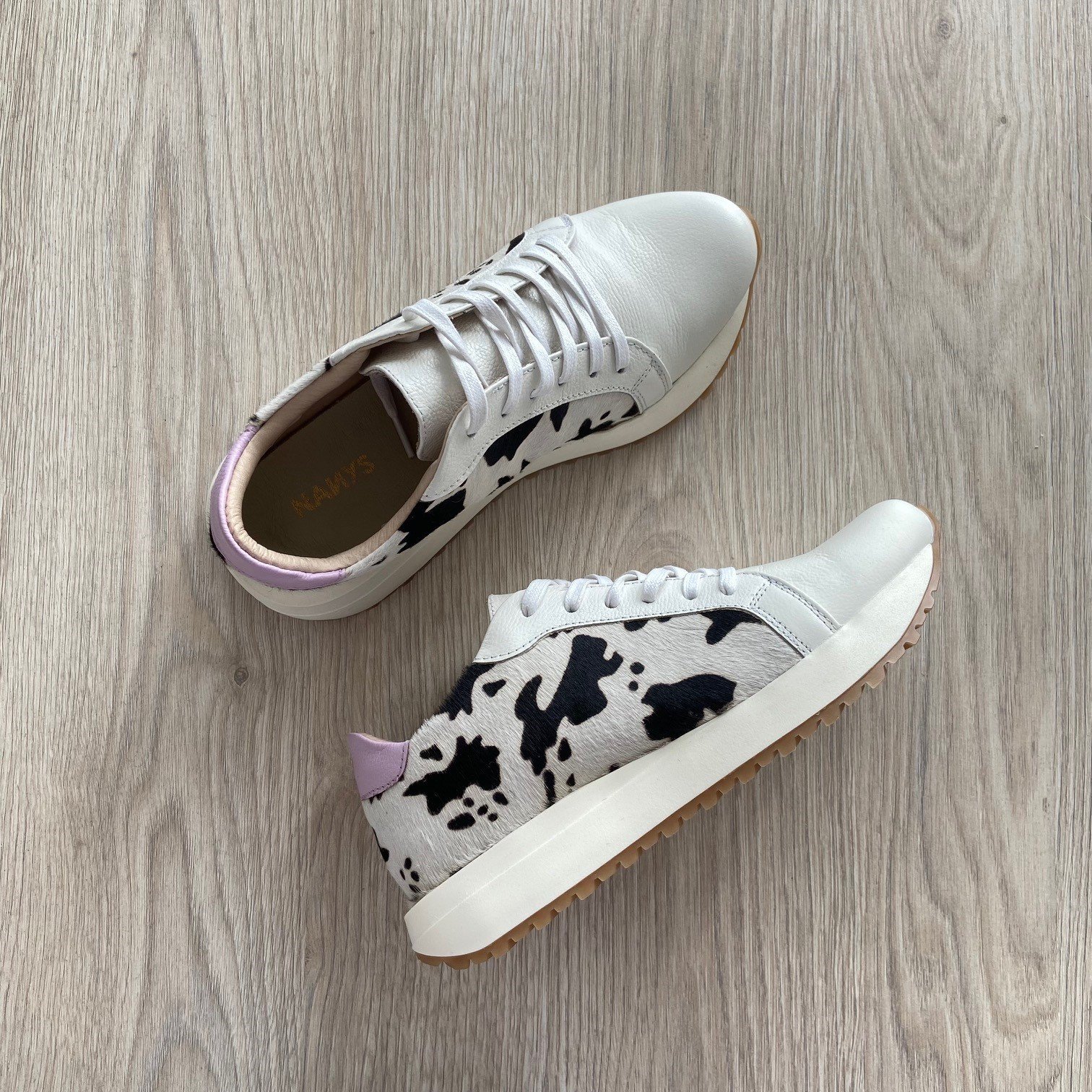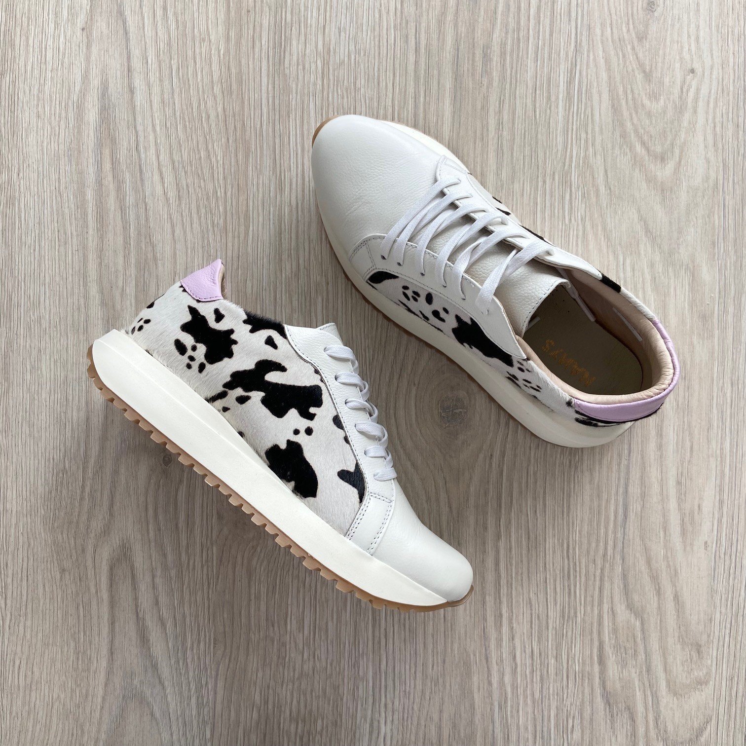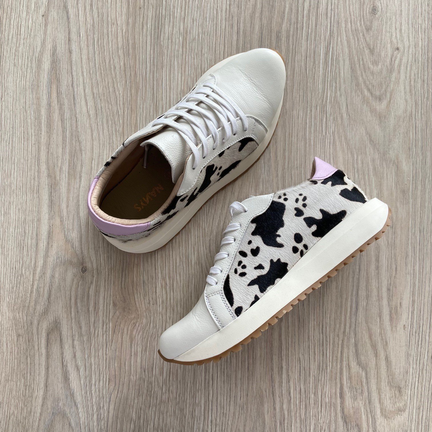Tenis blancos con animal print y lila en cuero. Forrados en cuero. Cordones encerados. Hechos en Colombia.