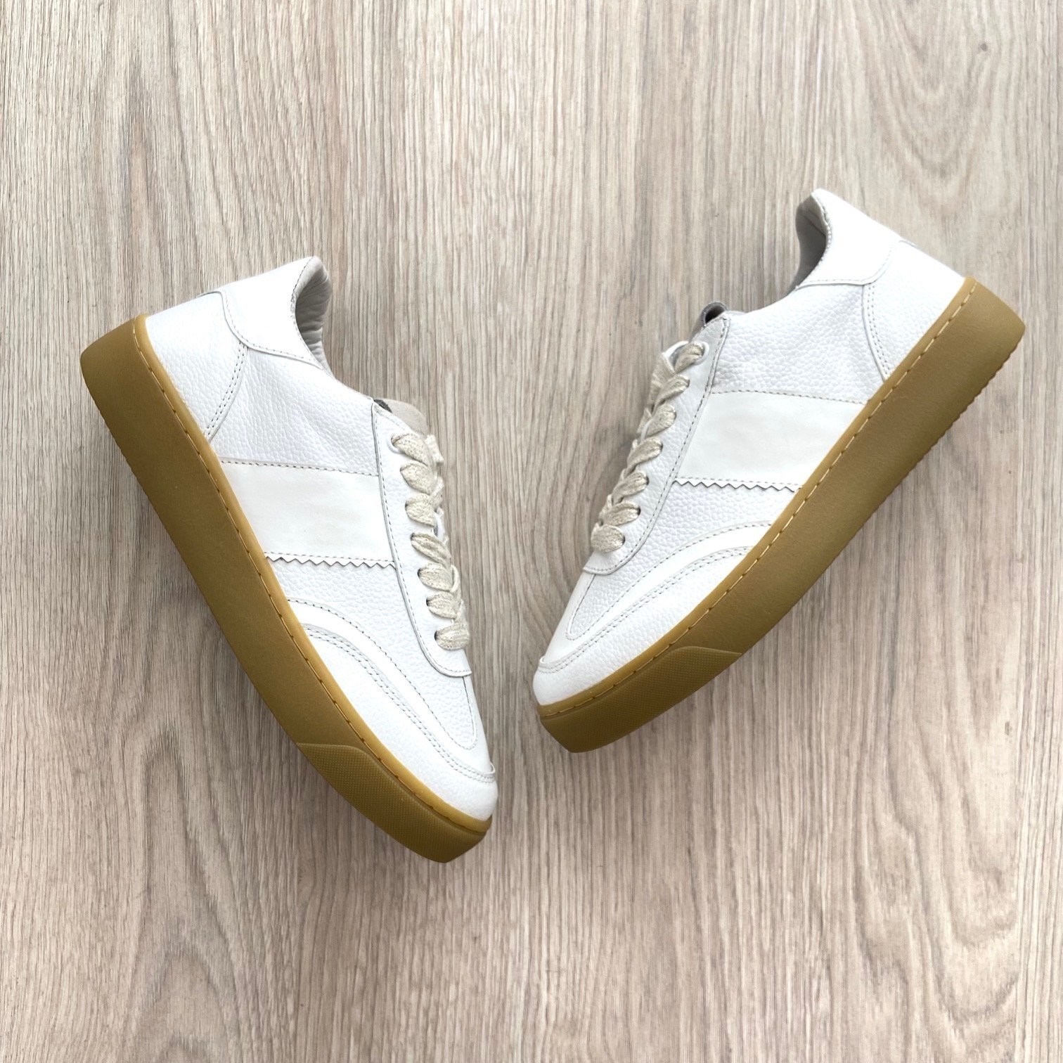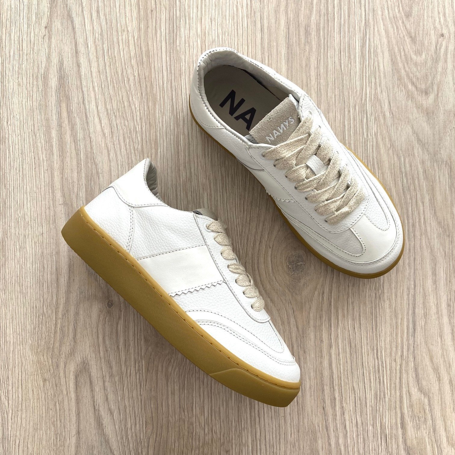 Tenis blancos en cuero con suela en goma. Forro en cuero y textil. Hechos en Colombia.