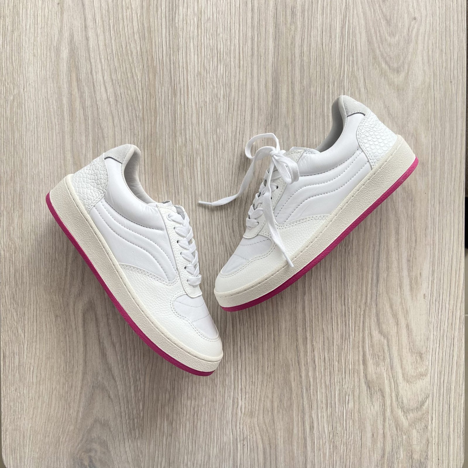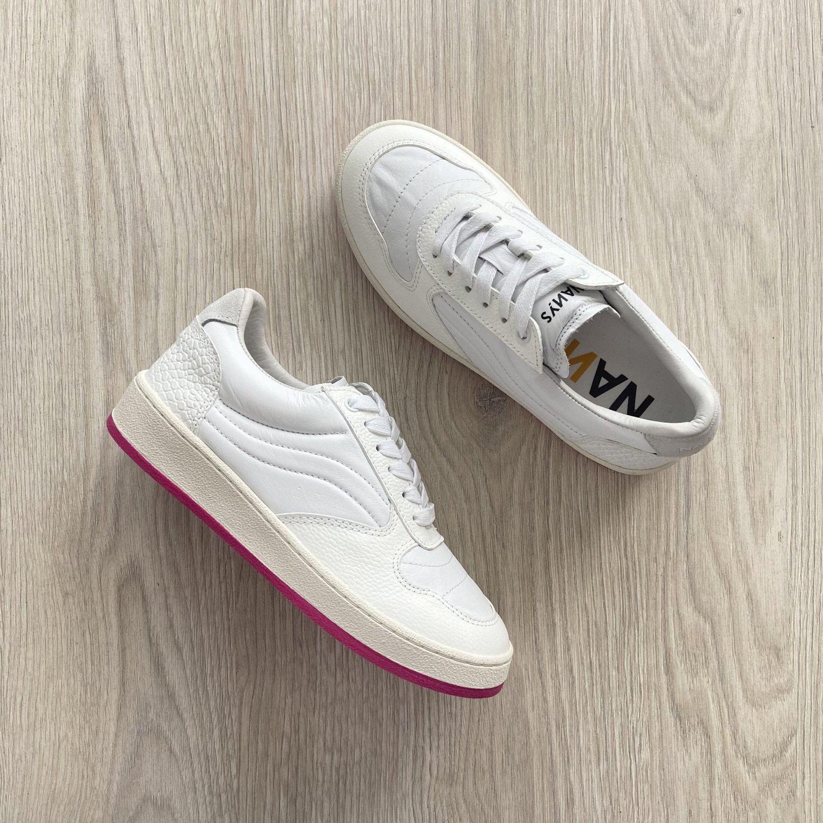 Tenis blancos en cuero con suela bajita antideslizante con tapete fucsia. Hechos en Colombia.