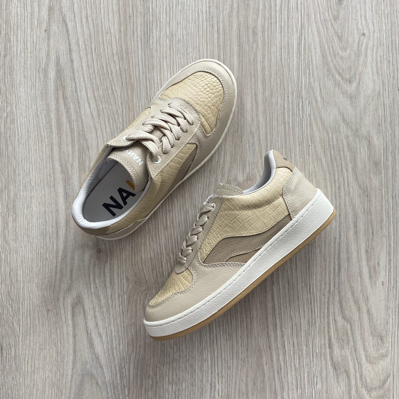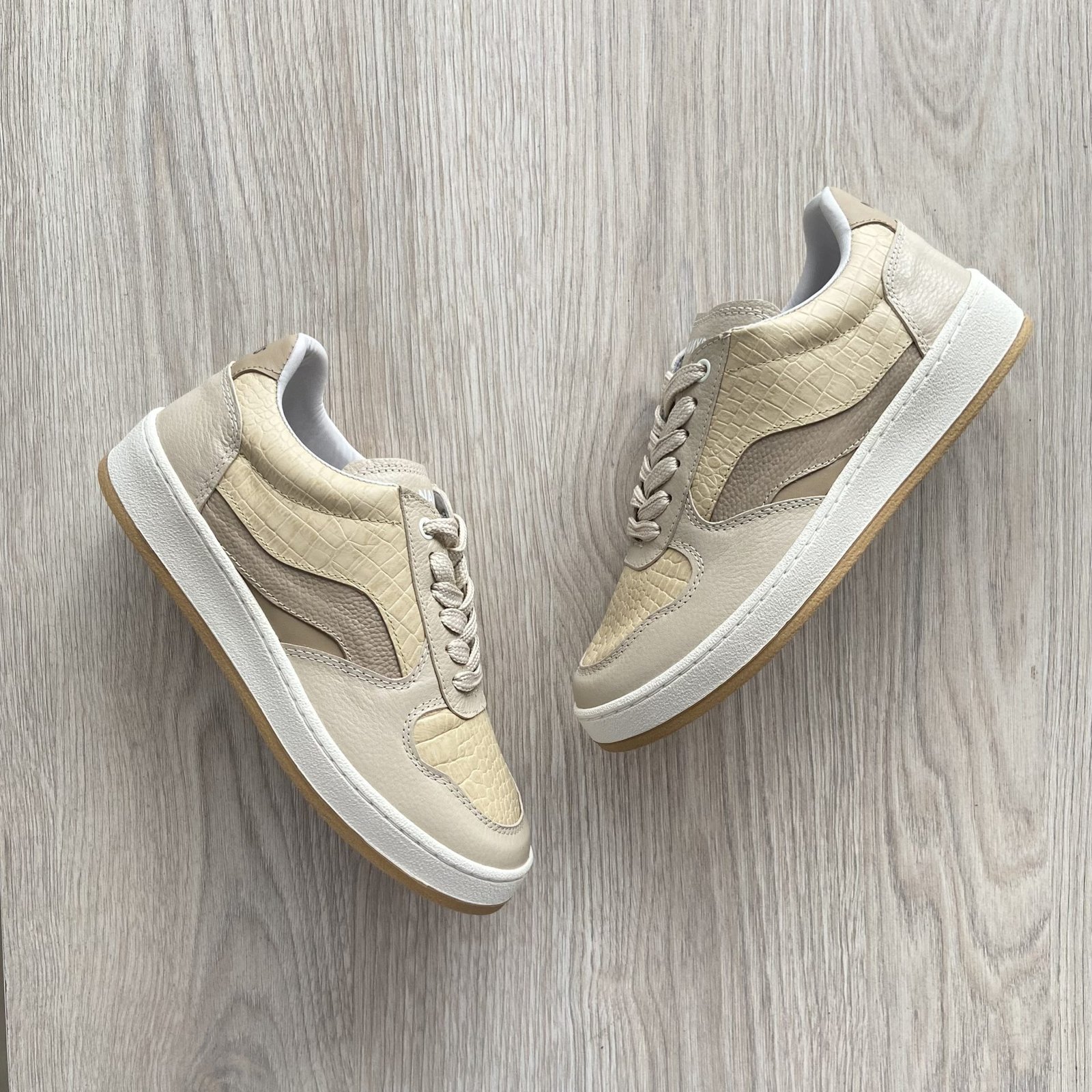 Tenis caqui y taupe en cuero con suela bajita antideslizante. Hechos en Colombia.