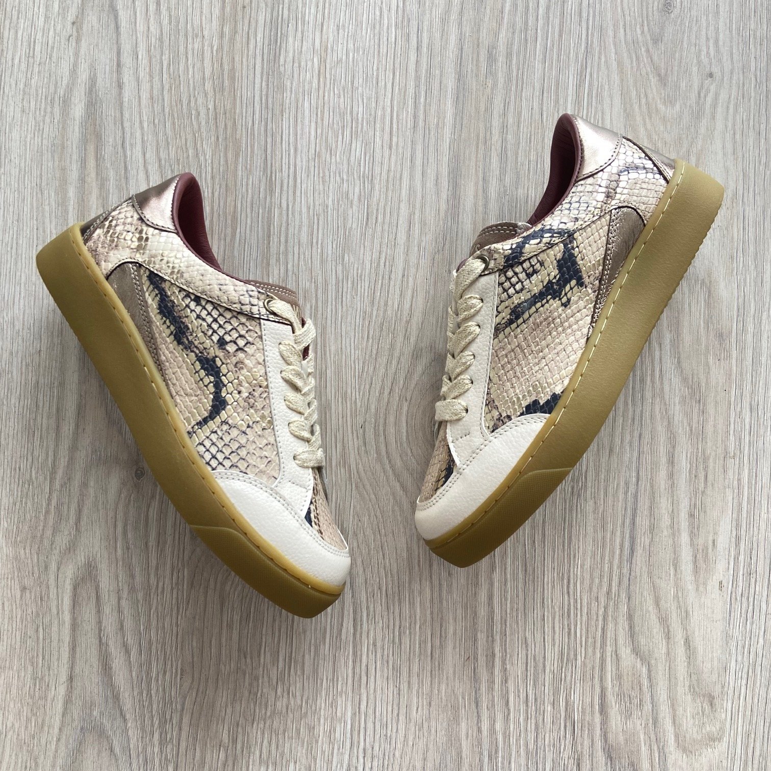 Tenis dorados en cuero con folia con suela en goma