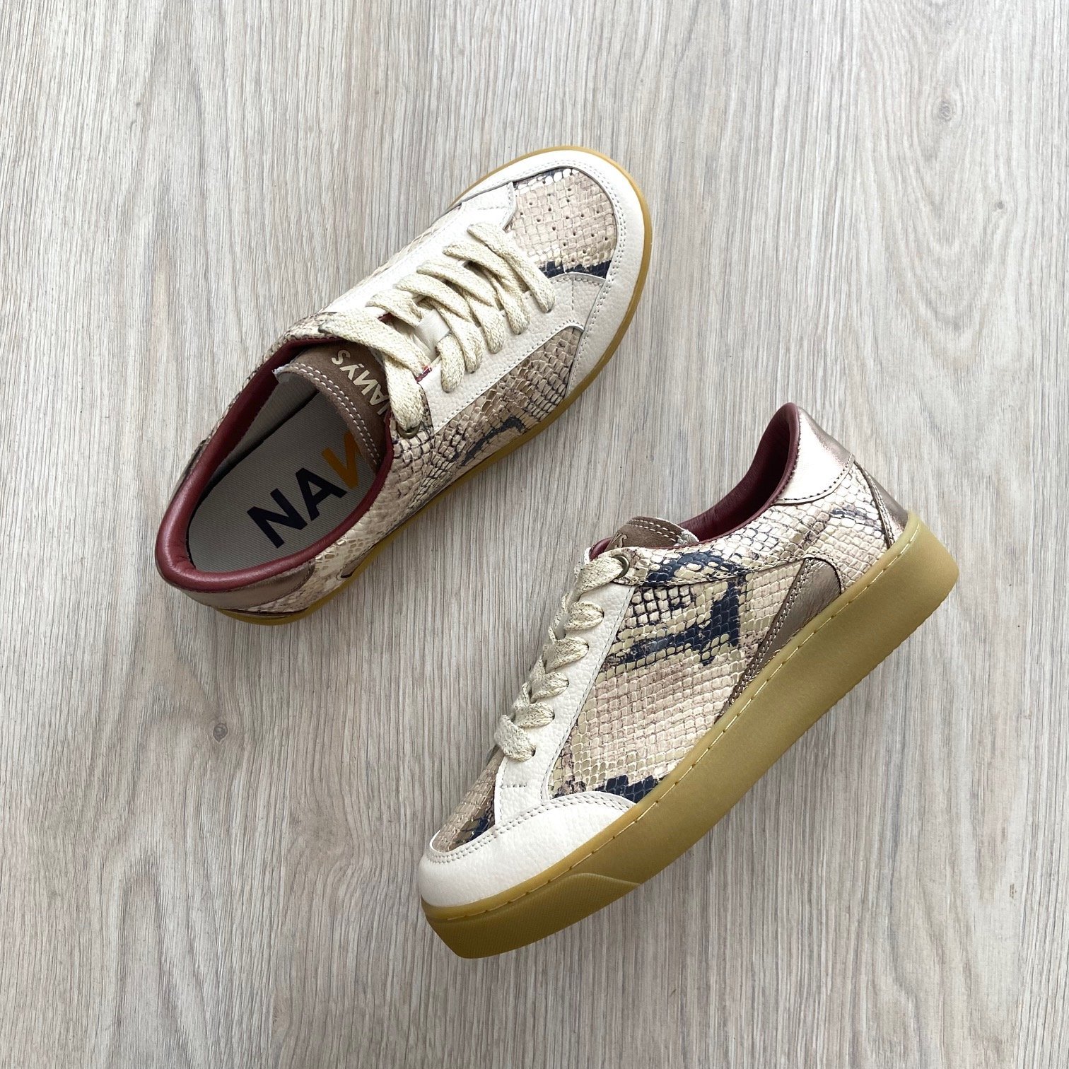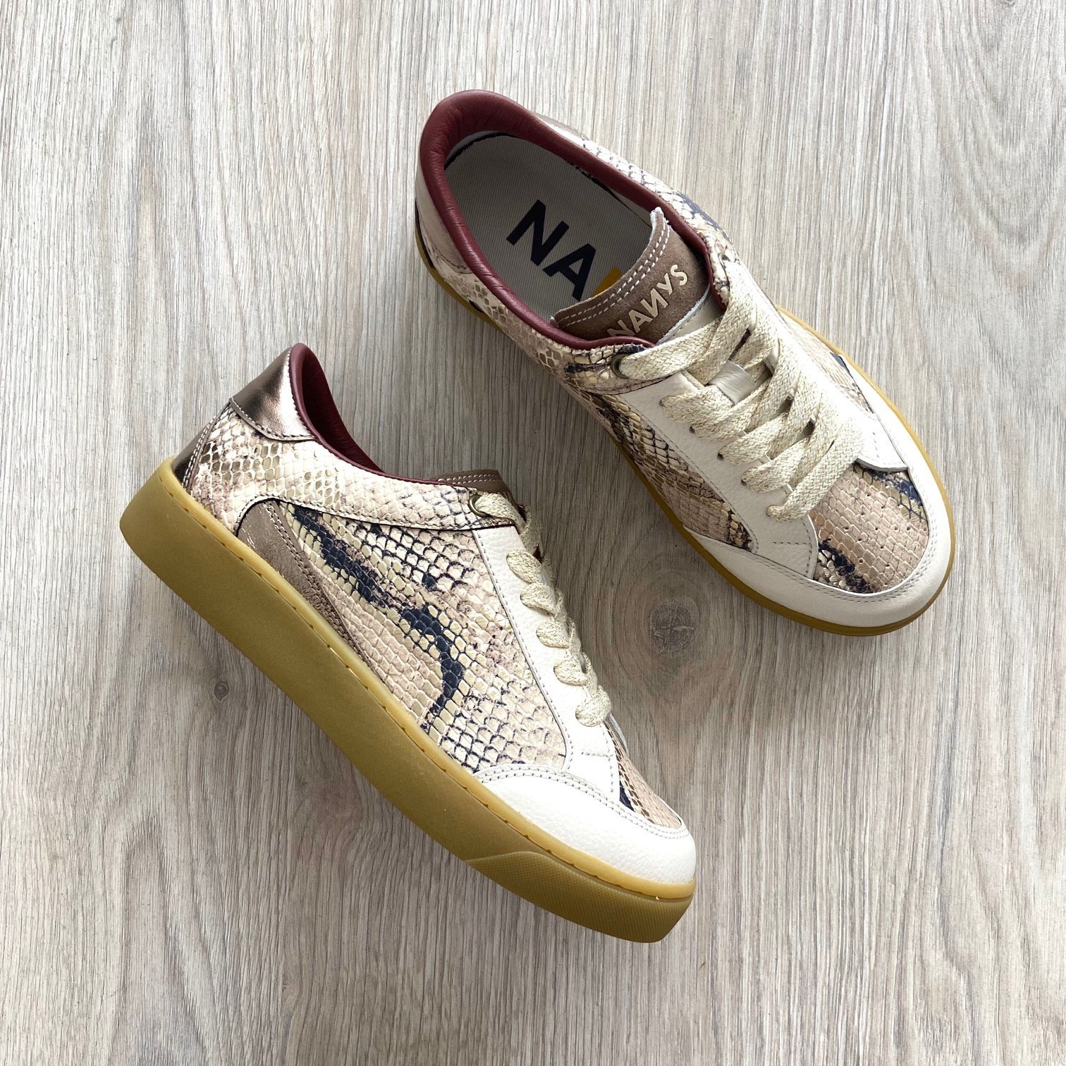 Tenis dorados en cuero con folia con suela en goma. Forro en cuero y textil. Hechos en Colombia.