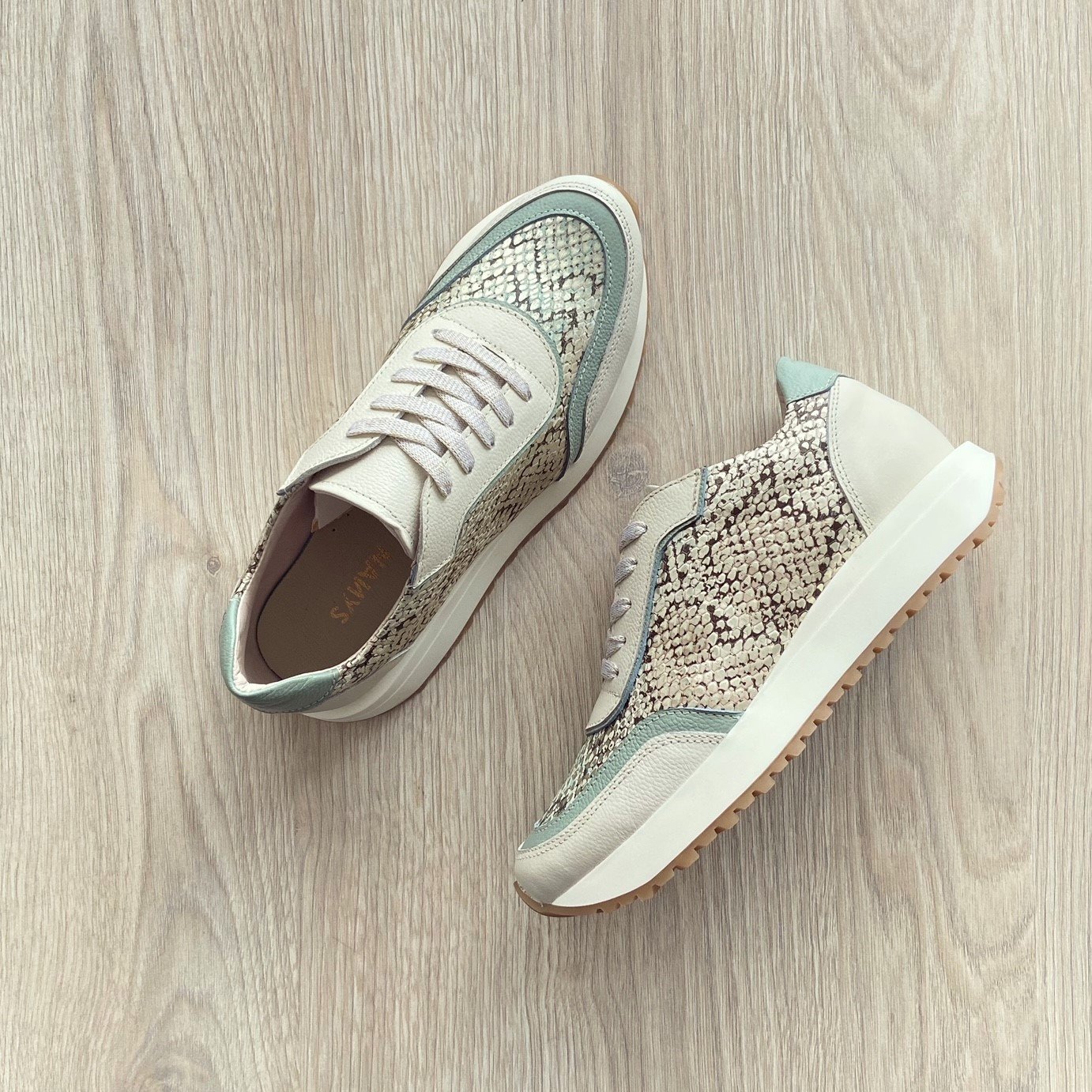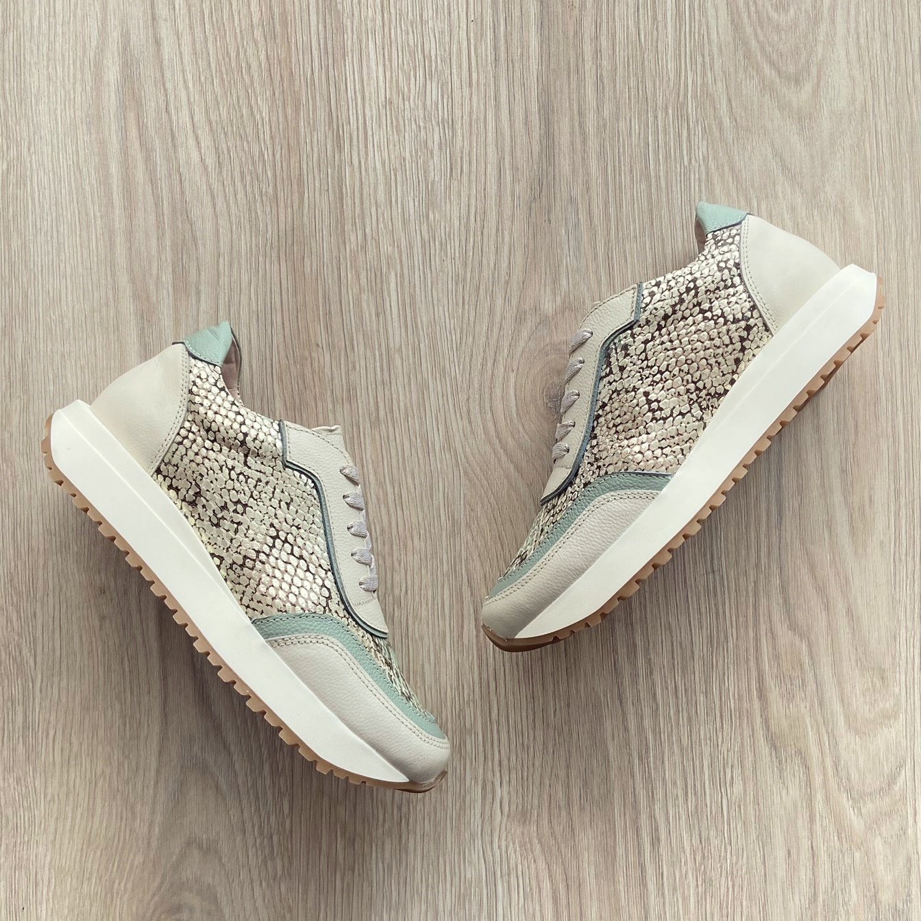 Tenis talco con verde menta y grabado en cuero