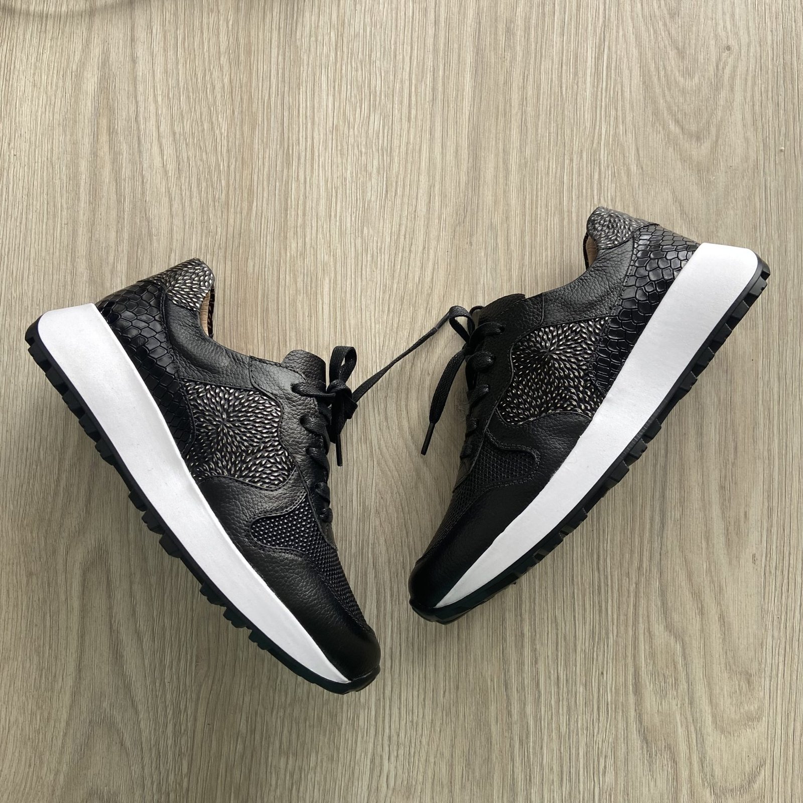 Tenis negro en cuero con apliques en folia. Forrados en cuero. Plantilla ergonómica. Cordones encerados. Hechos en Colombia.