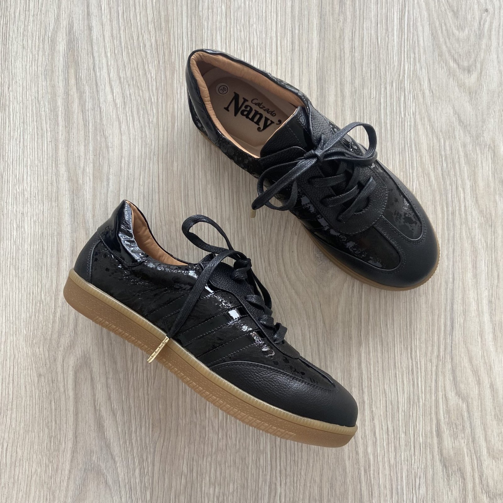 Tenis negro en cuero con suela en goma café. Forrados en cuero. Plantilla ergonómica. Hechos en Colombia.