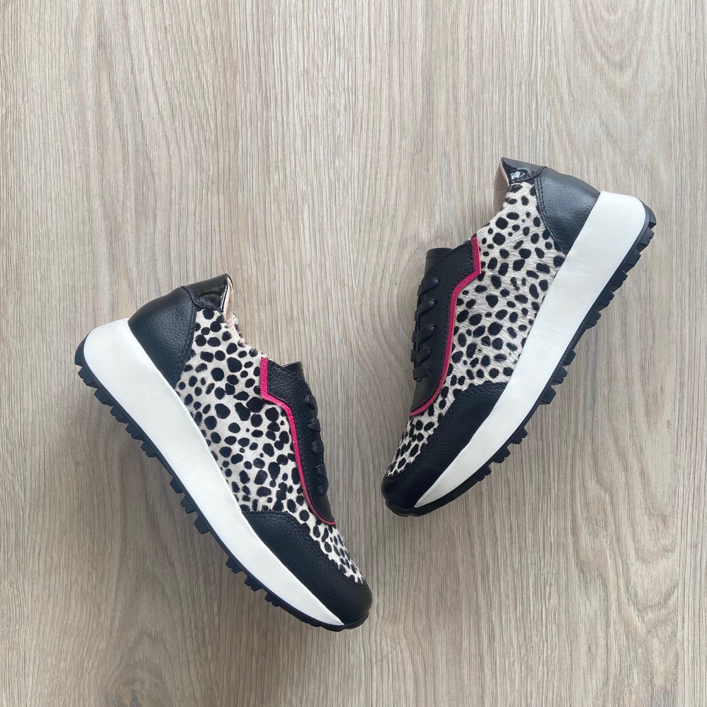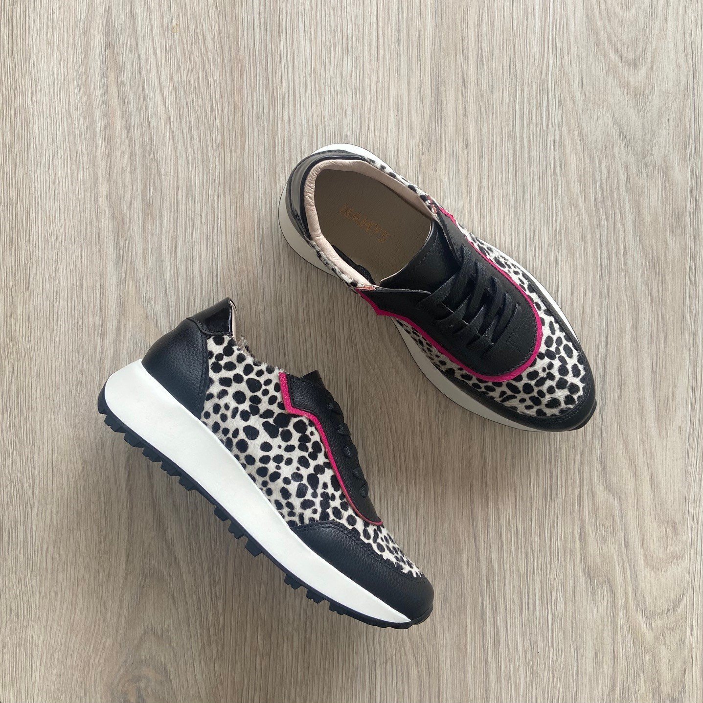 Tenis negros con animal print y fucsia en cuero. Forrados en cuero. Hechos en Colombia.