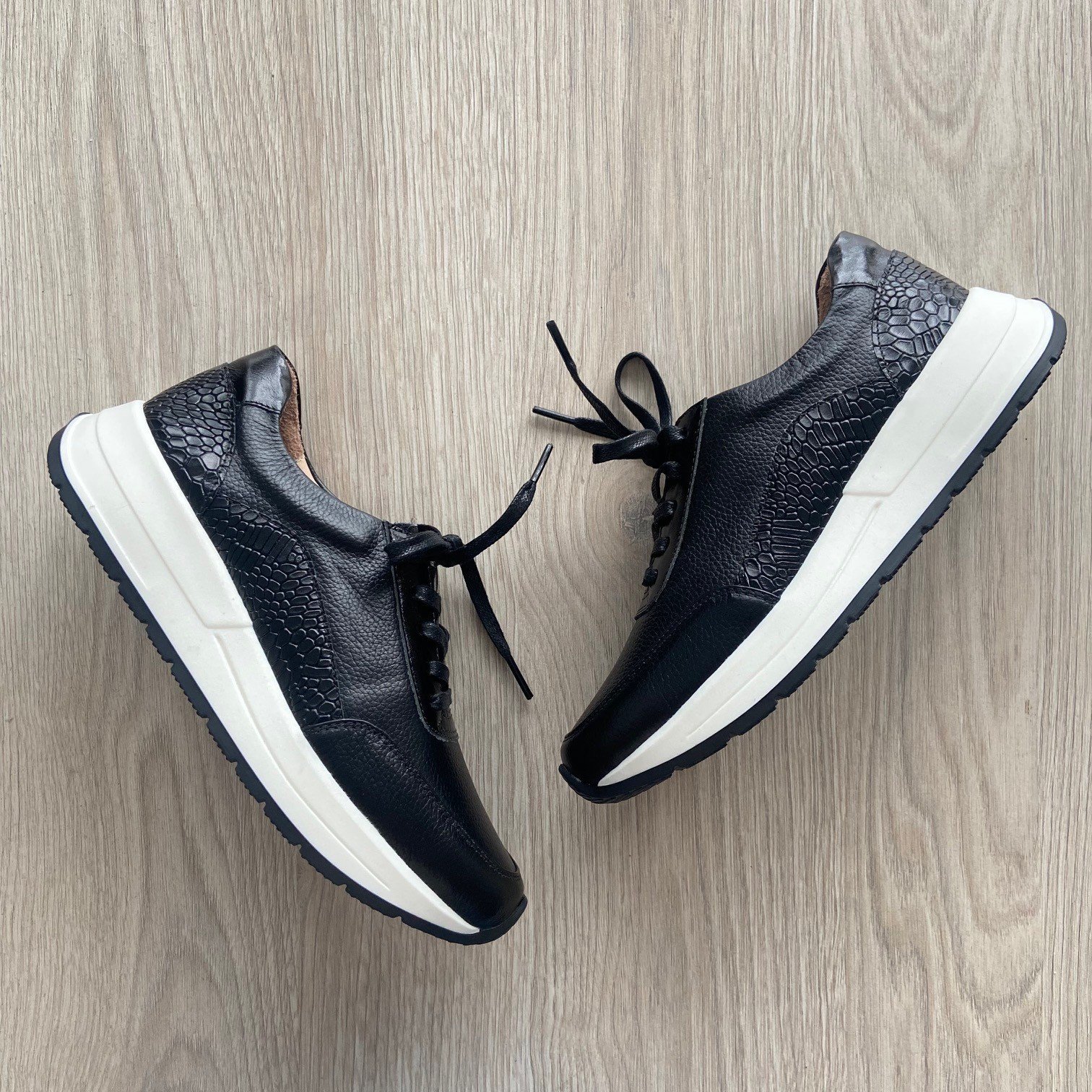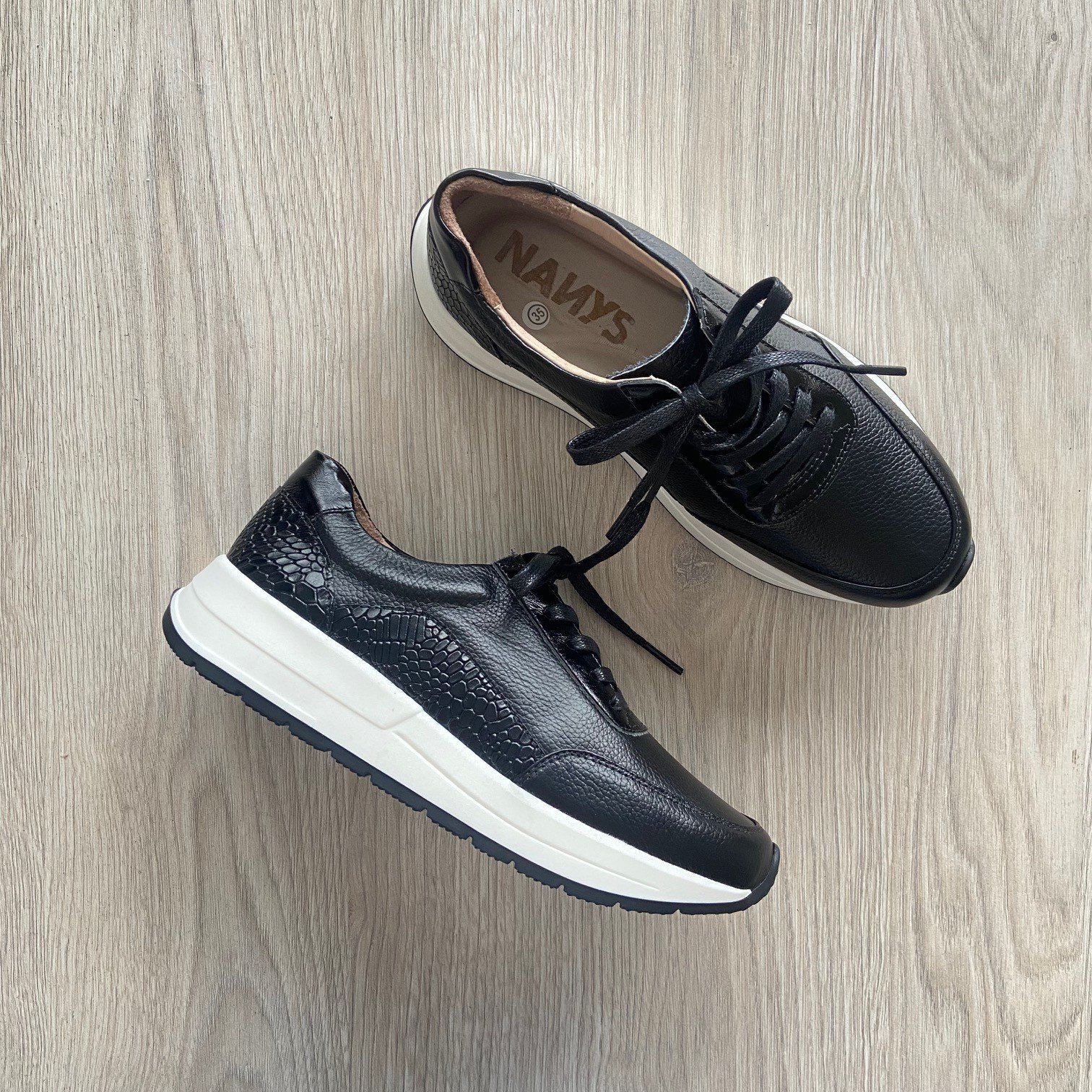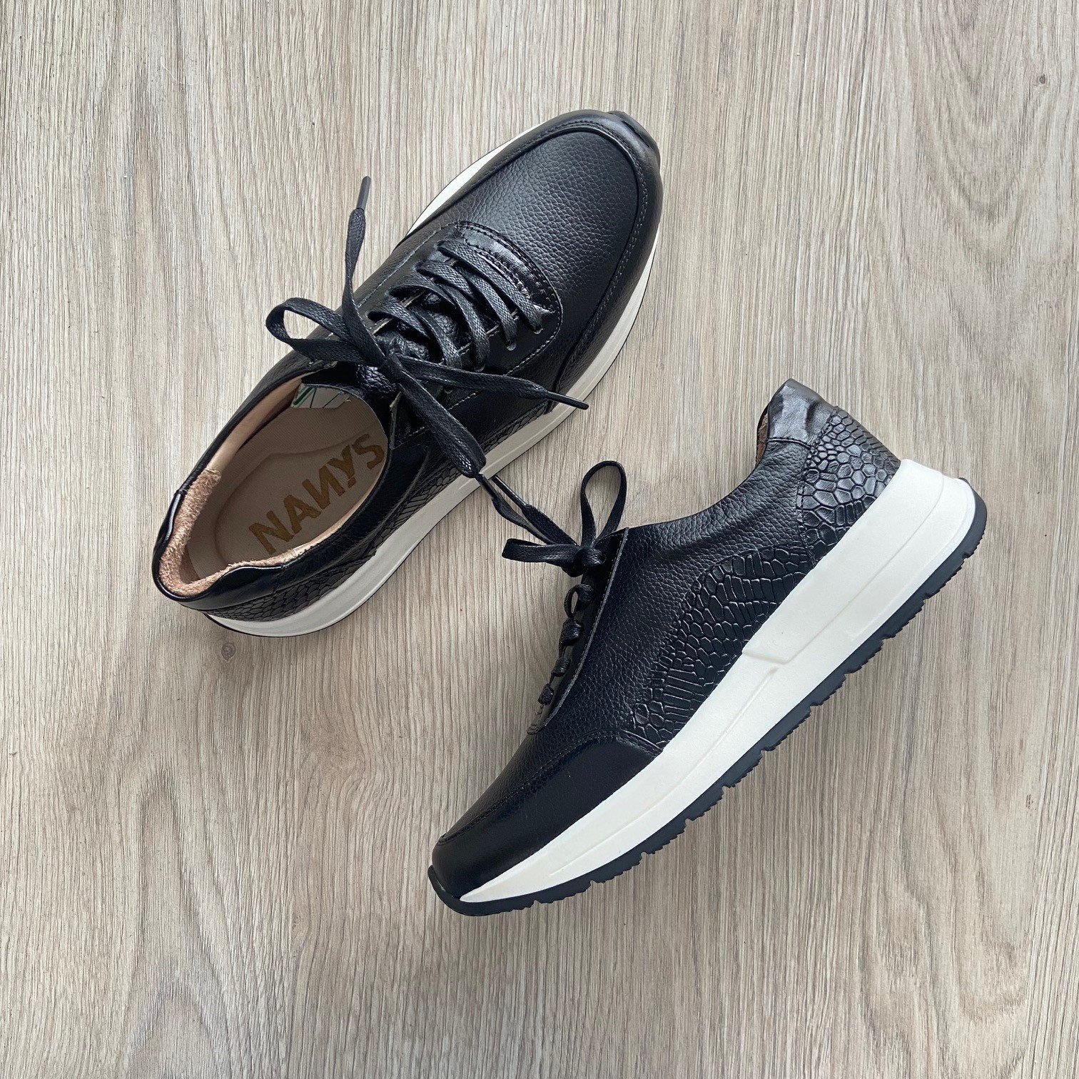 Tenis negros en cuero con aplique en cuero grabado. Forrados en cuero. Cordones encerados. Plantilla ergonómica. Hechos en Colombia