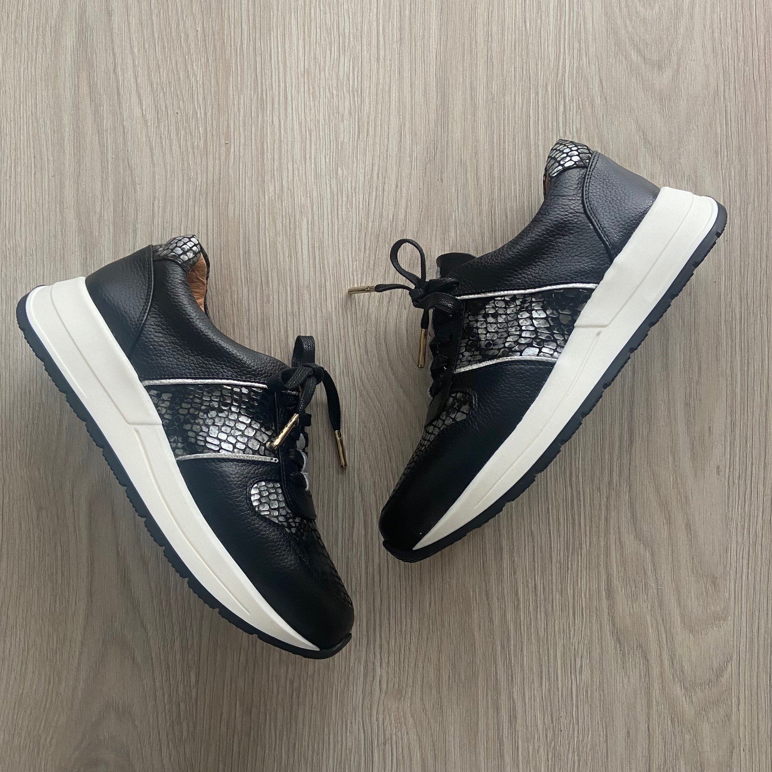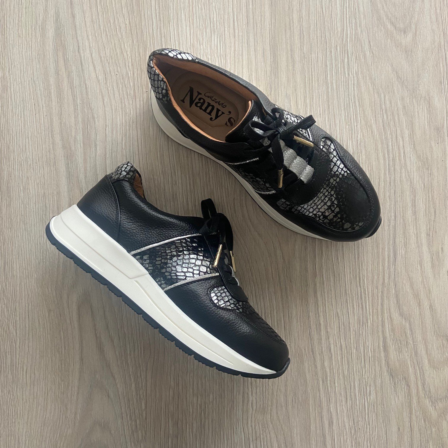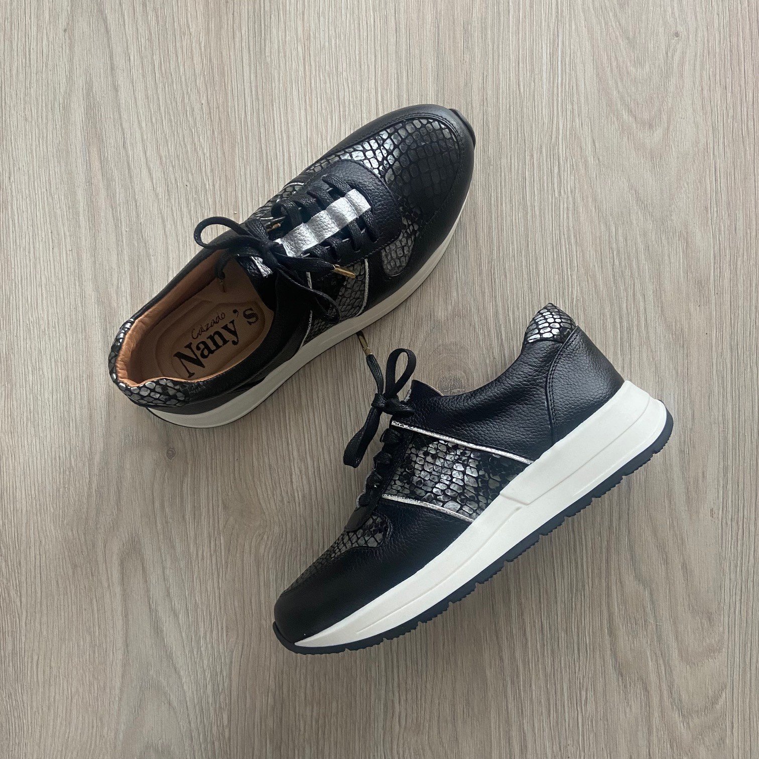 Tenis negros en cuero con apliques plateados y folia. Plantilla ergonómica. Cordones encerados. Forrados en cuero. Hechos en Colombia.