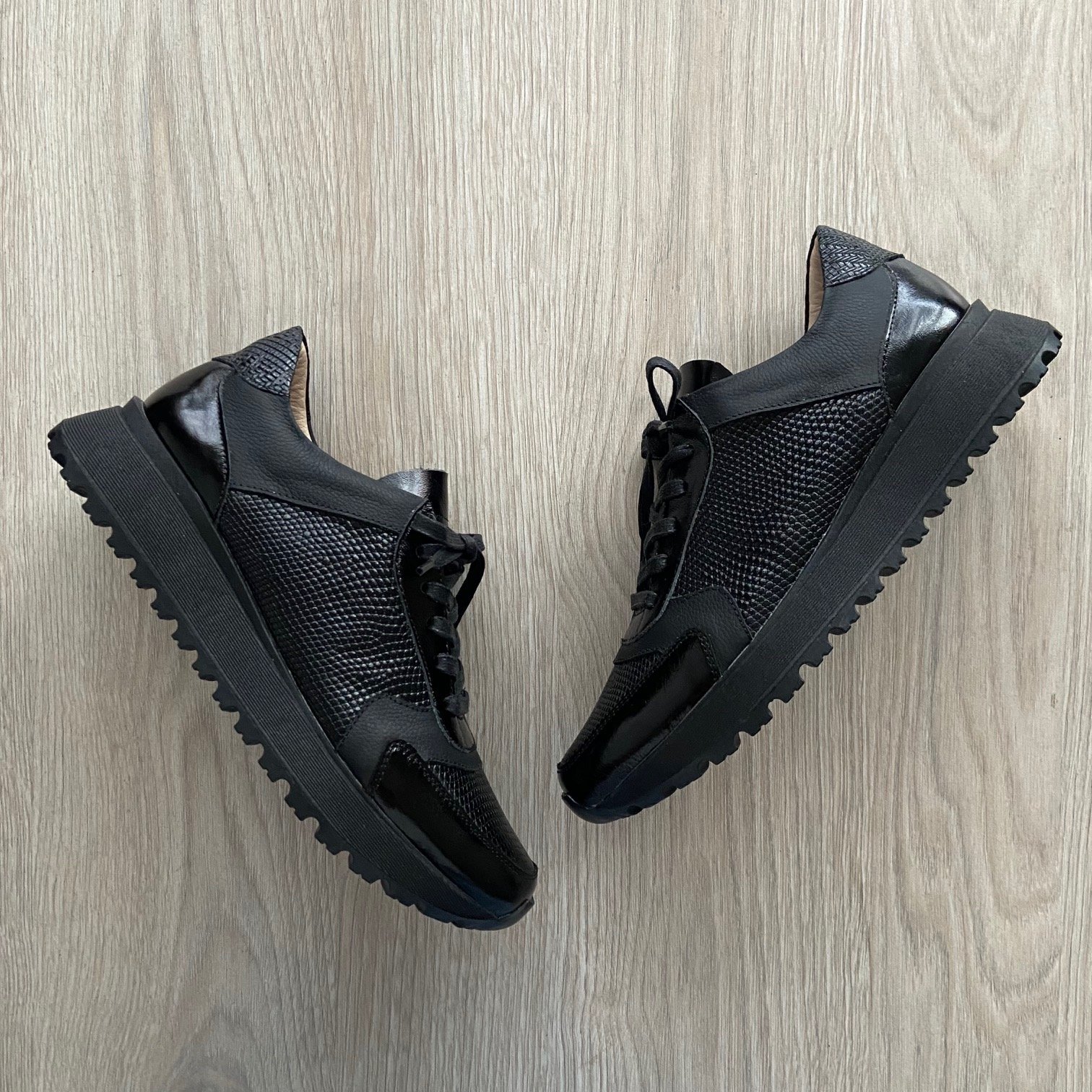 Tenis negros en cuero con suela negra. Forrados en cuero. Plantilla ergonómica. Cordones encerados. Hechos en Colombia.
