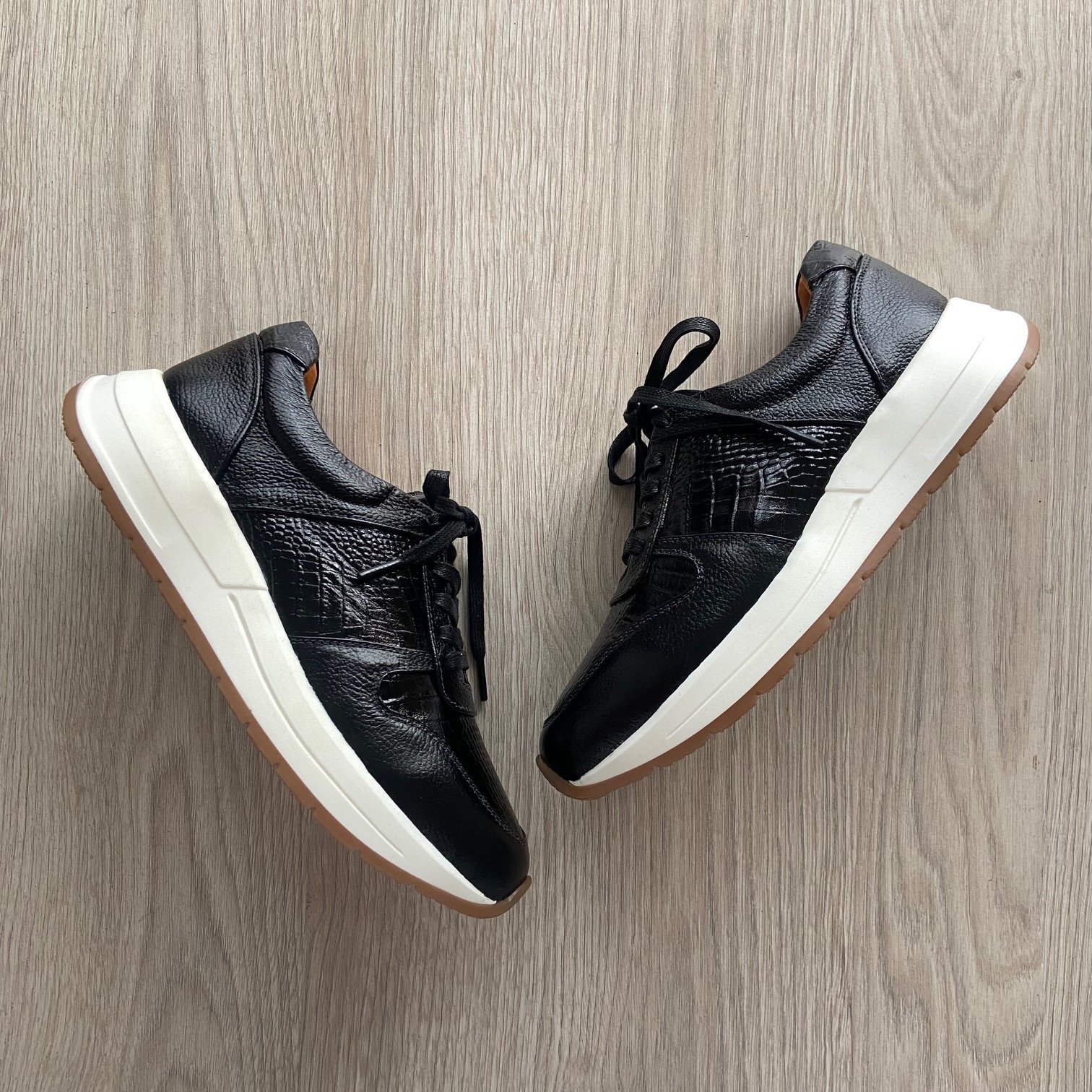 Tenis negros en cuero liso y grabado. Forrados en cuero. Cordones encerados. Plantilla ergonómica. Hechos en Colombia.