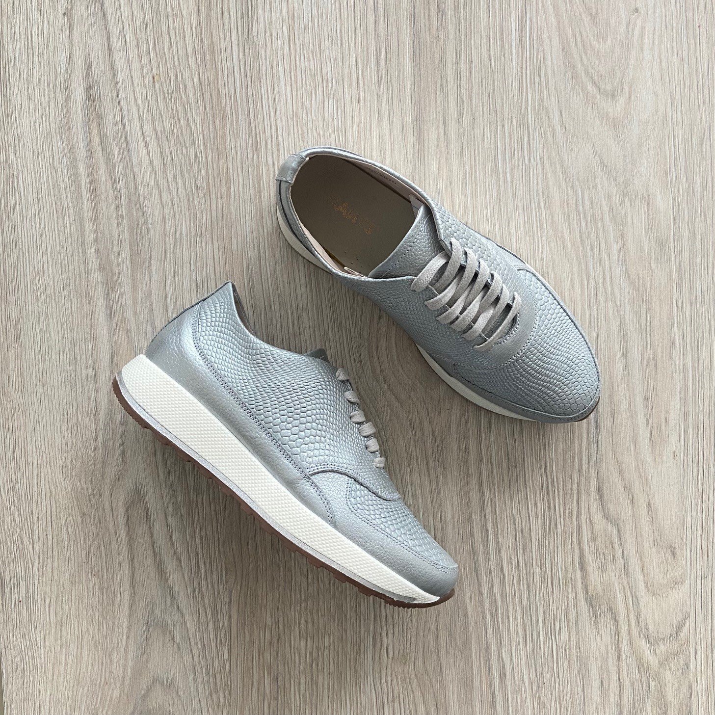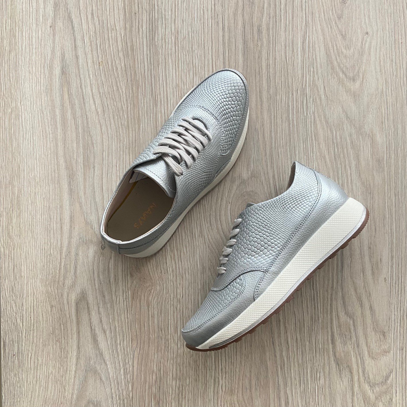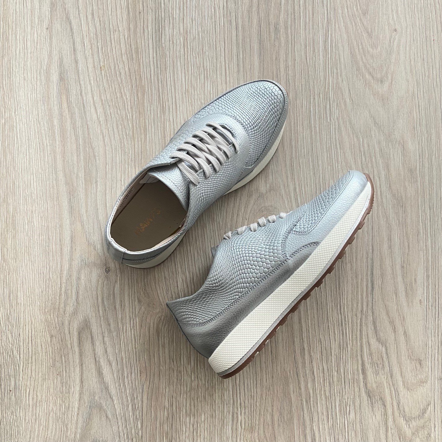 Tenis plateado en cuero grabado. Forrados en cuero. Hechos en Colombia.