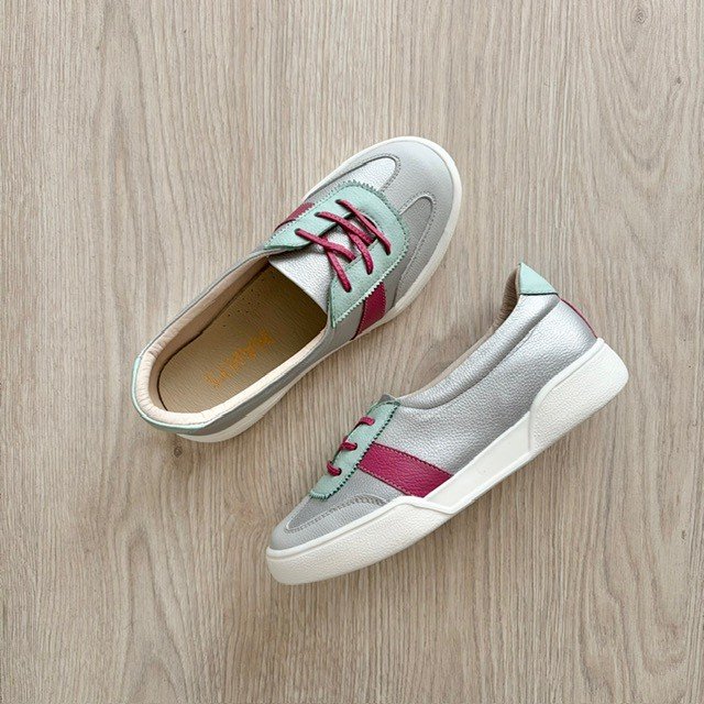 Tenis plateados, gris, fucsia y azul en cuero. Forrados en cuero. Cordones en cuero. Hechos en Colombia.