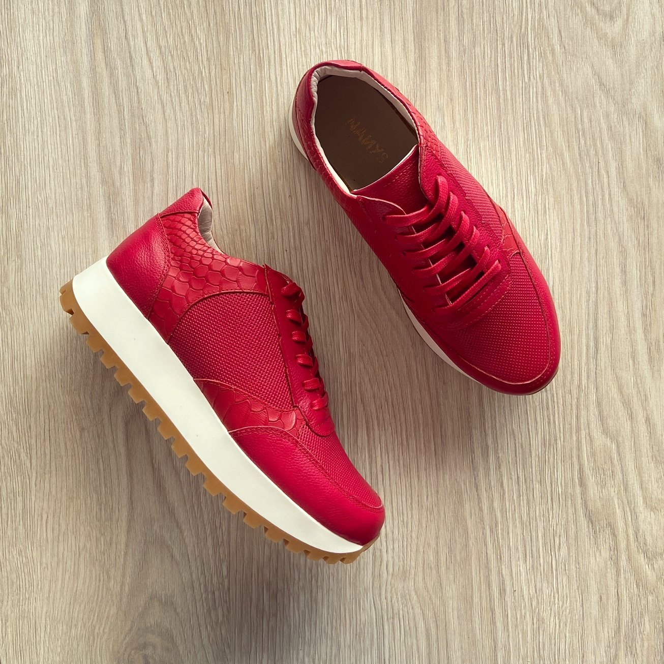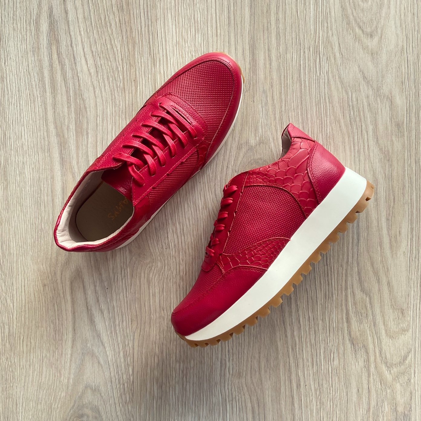 Tenis rojos en cuero liso y grabado. Suela alta. Forrados en cuero. Hechos en Colombia.