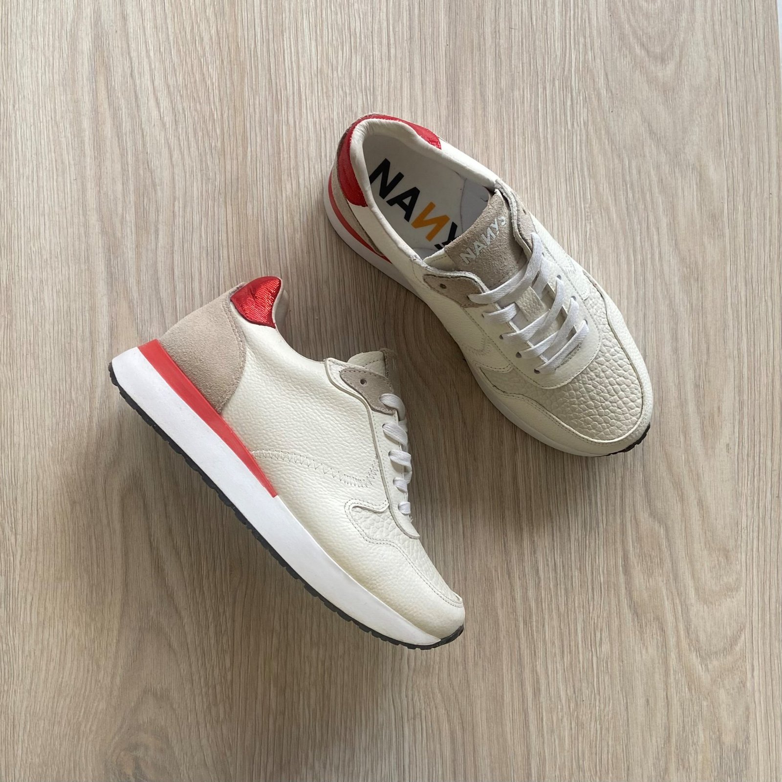 Tenis talco con apliques rojo cuero. Forrados en cuero. Cordones encerados. Hechos en Colombia.