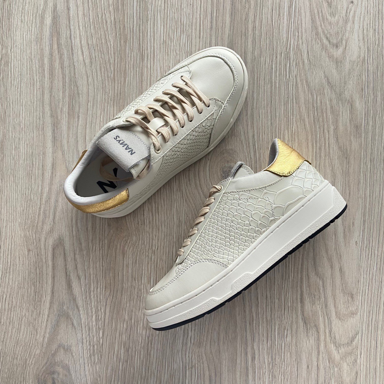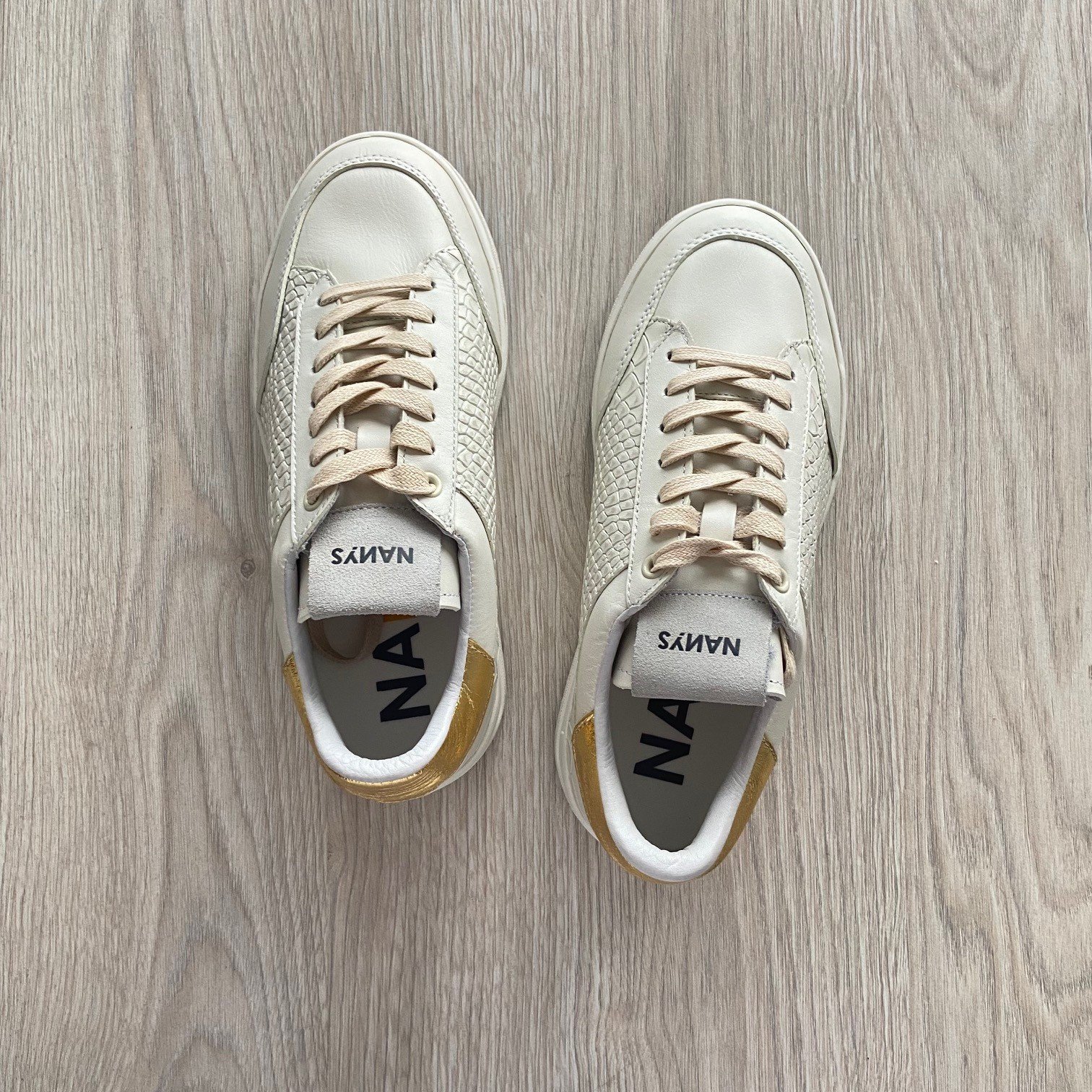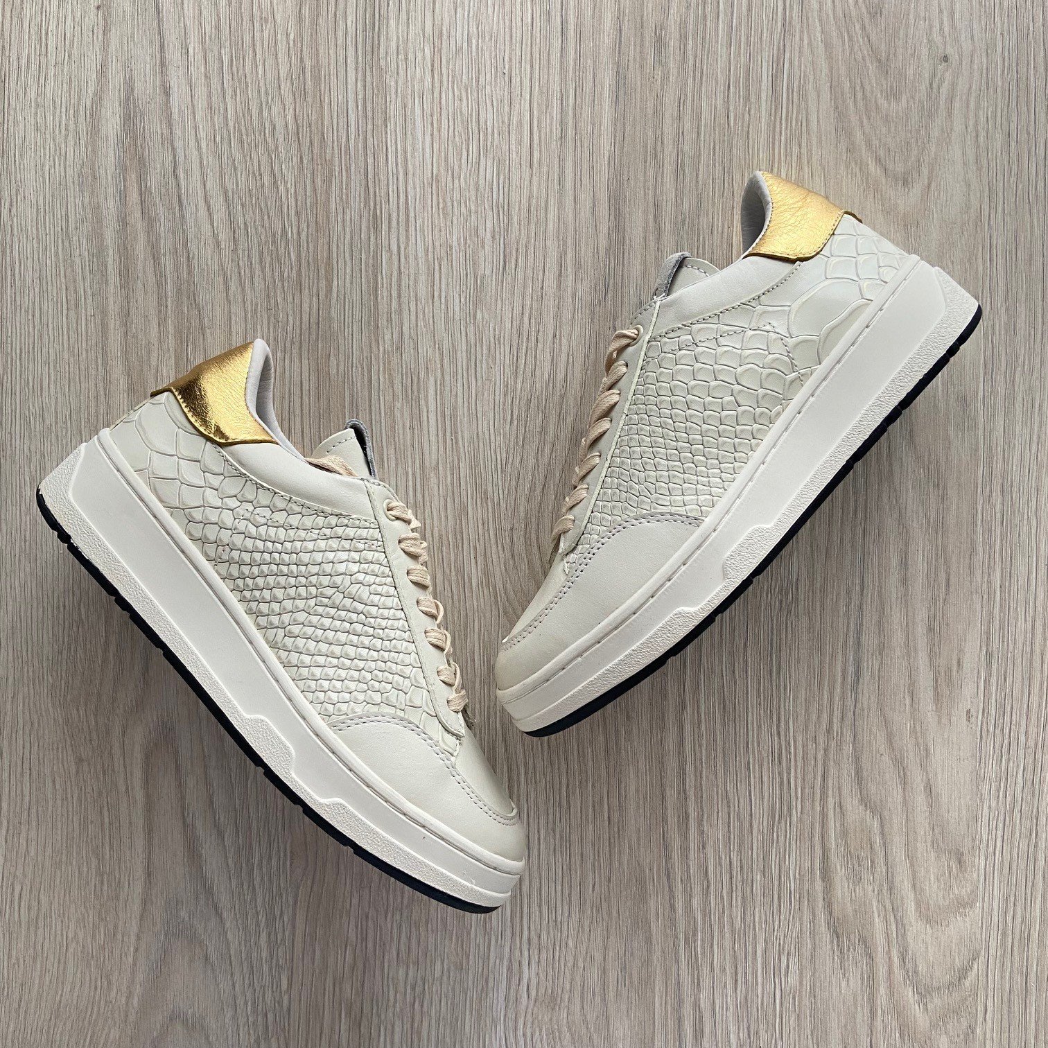 Tenis talco en cuero grabado y liso con aplique dorado en la parte trasera. Cordones encerados. Hechos en Colombia.