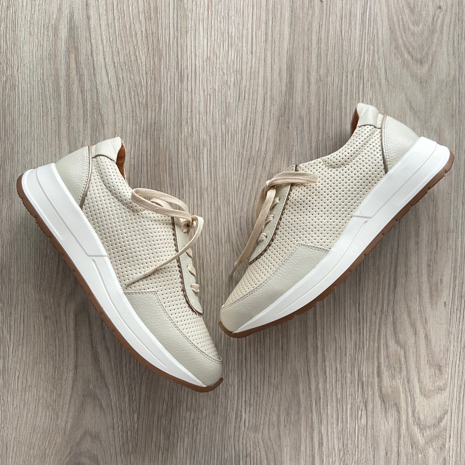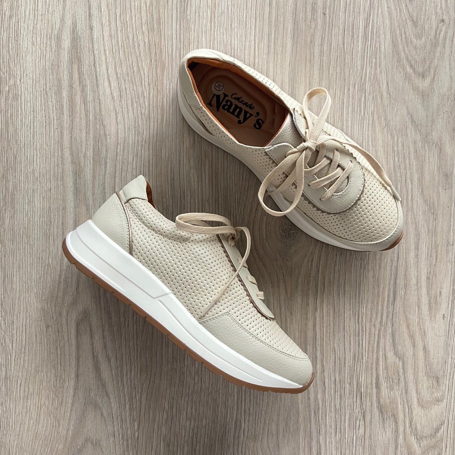 Tenis talco en cuero gradado con apliques dorados en la cordonera y talón. Forrados en cuero. Plantilla ergonómica. Cordones encerados. Hechos en Colombia.