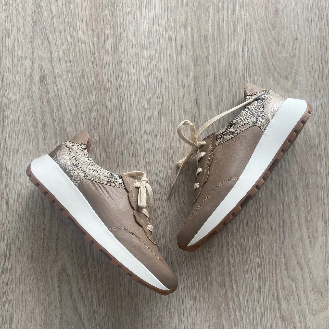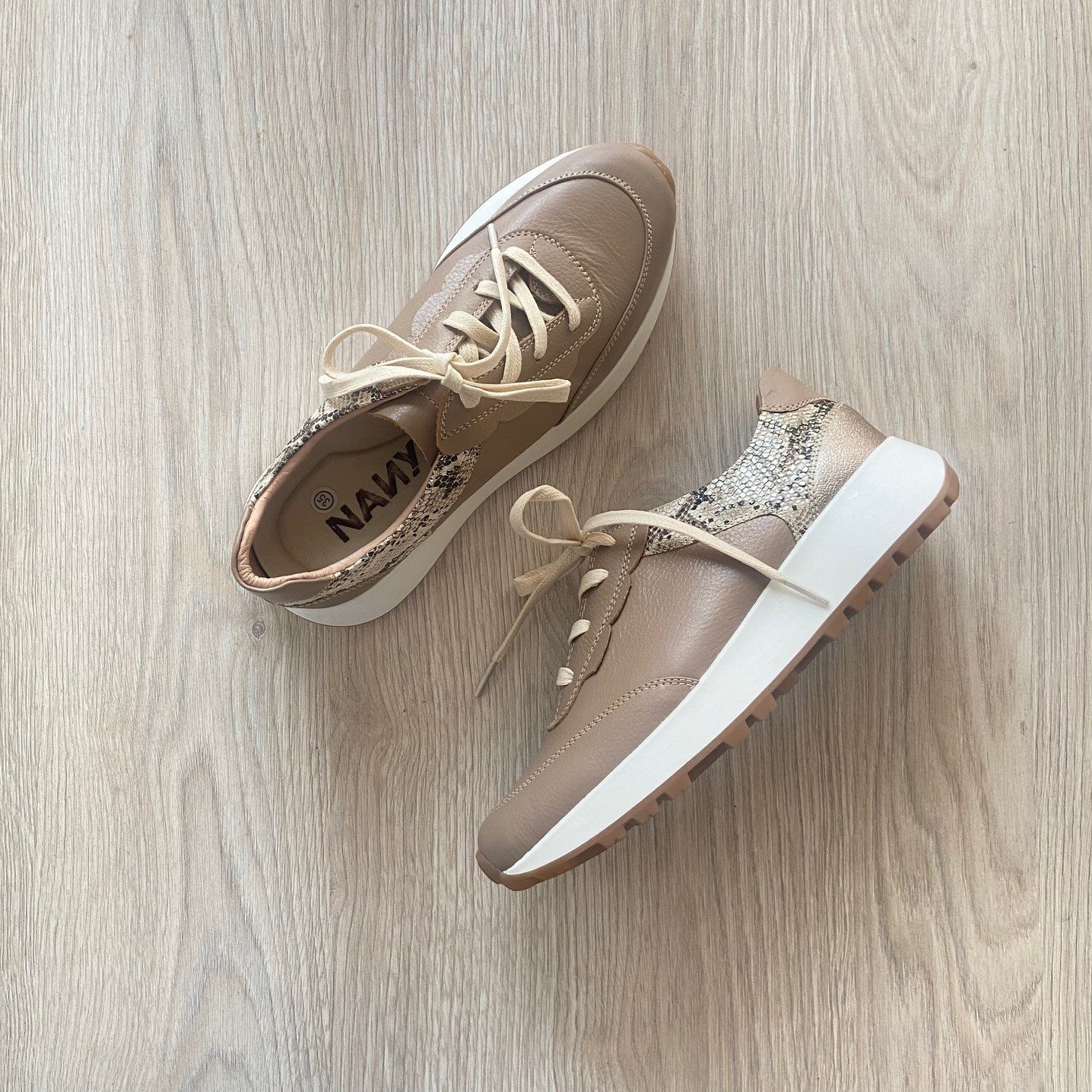 Tenis taupe en cuero con aplique en folia. Plantillas ergonómicas. Cordones encerados. Forrados en cuero. Hechos en Colombia.