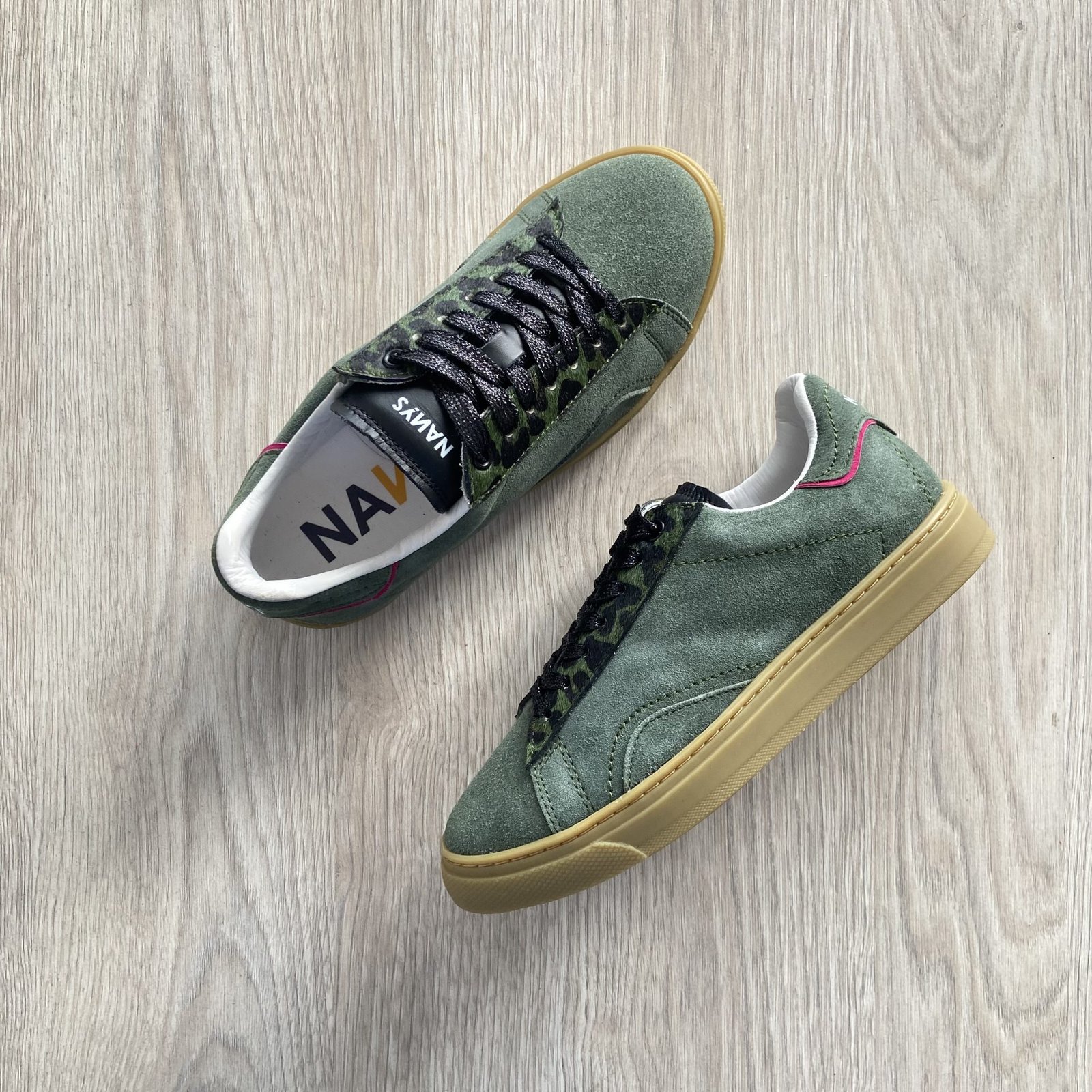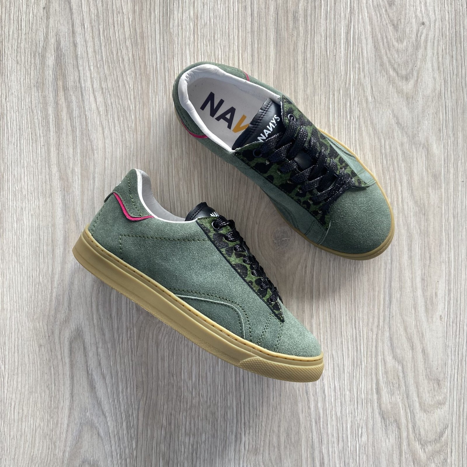 Tenis verdes en cuero tipo carnaza, con aplique fucsia y cordonera en animal print verde. Suela en goma. Hechos en Colombia.