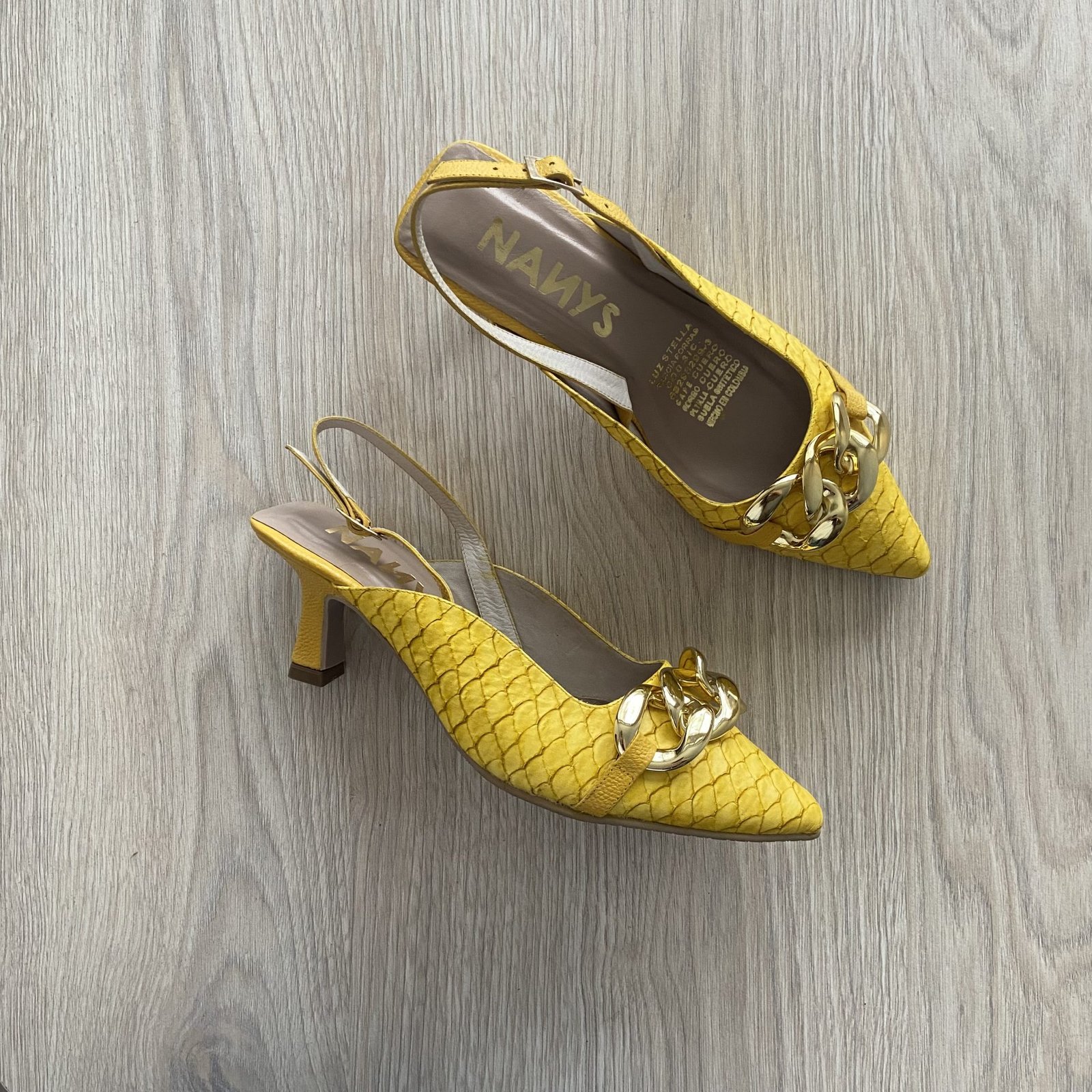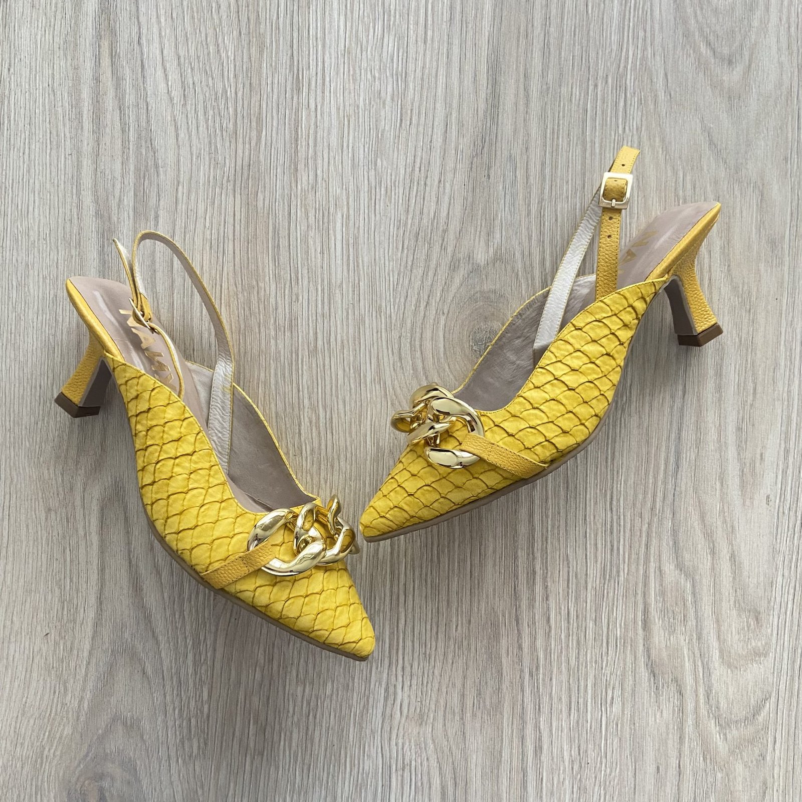 Zapato amarillo en cuero con cadena dorada. Tacón 5.5 cm. Suela antideslizante beige. Forrados en cuero. Hechos en Colombia.