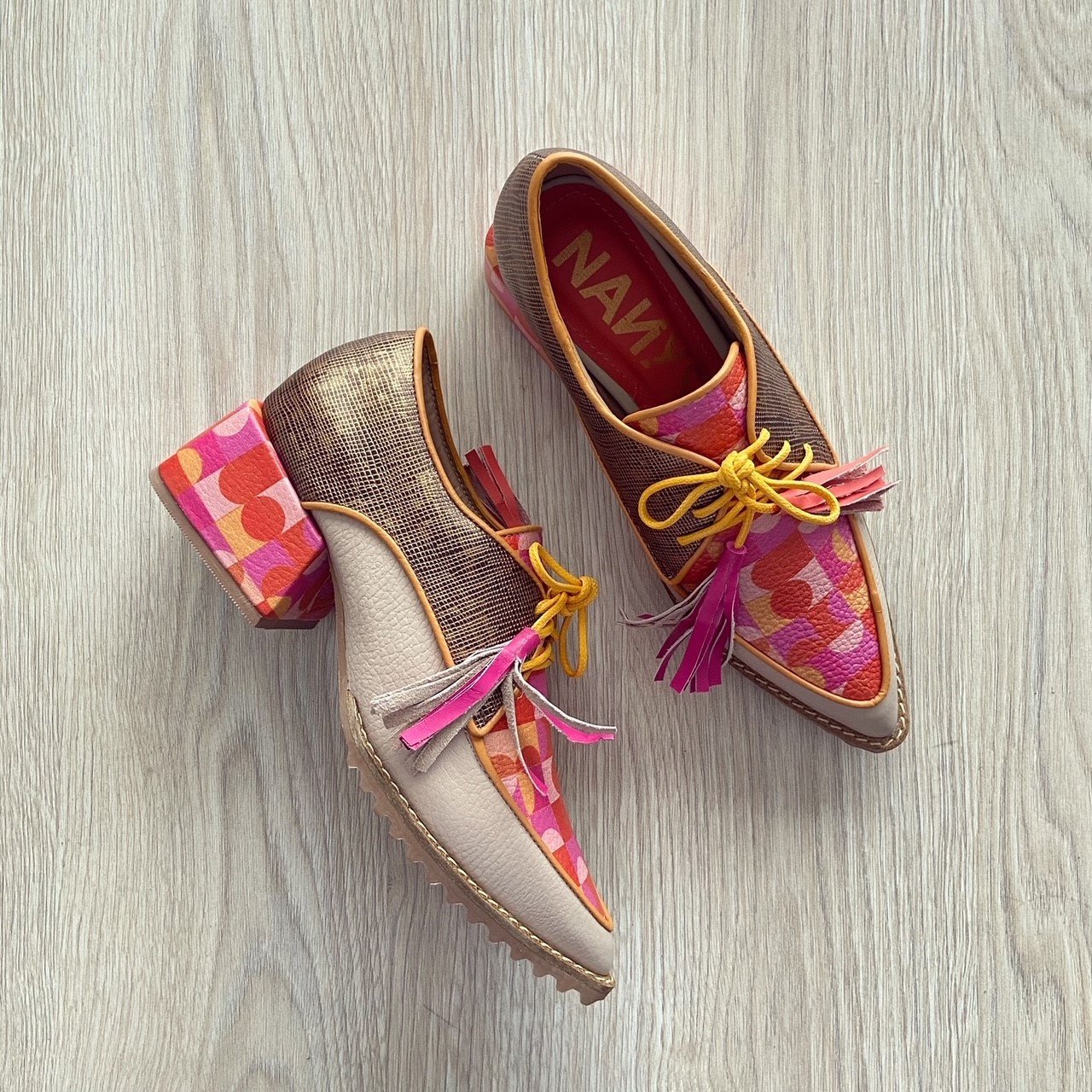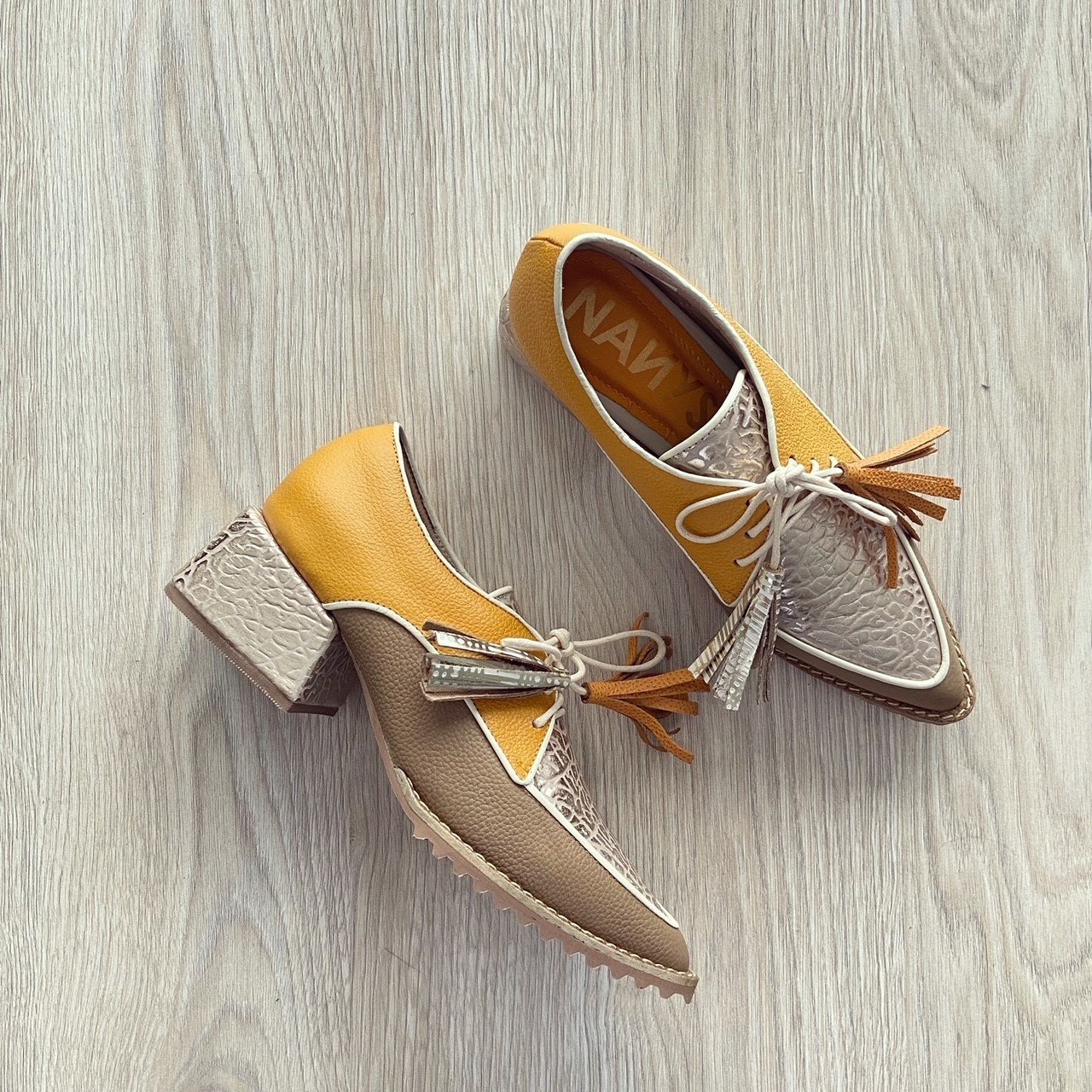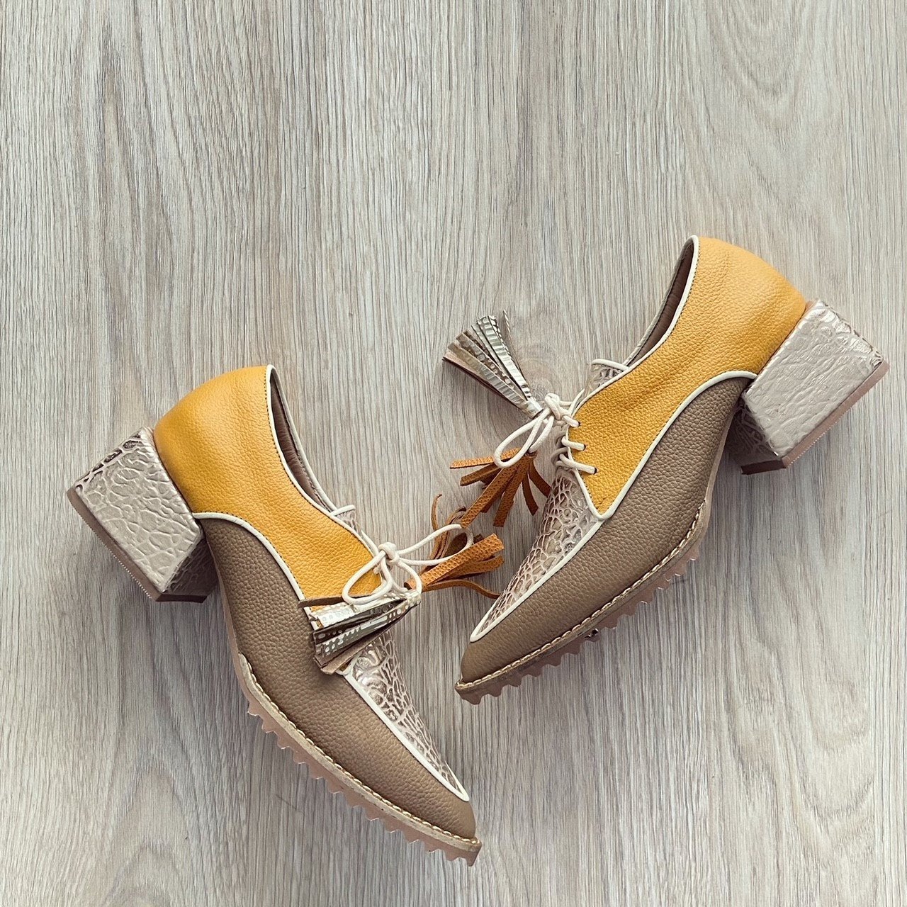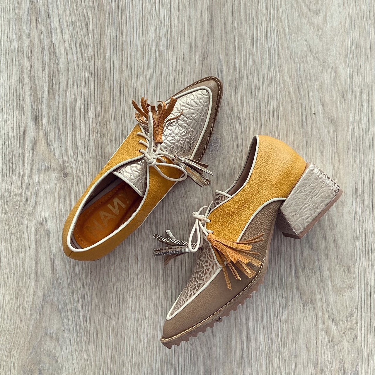 Zapato bolichero taupe con mostaza y dorado en cuero. Cordones redondos encerados con escobillas en las puntas. Suela rizada en goma. Tacón 3.5 cm forrado en cuero. Forrados en cuero. Hechos en Colombia.