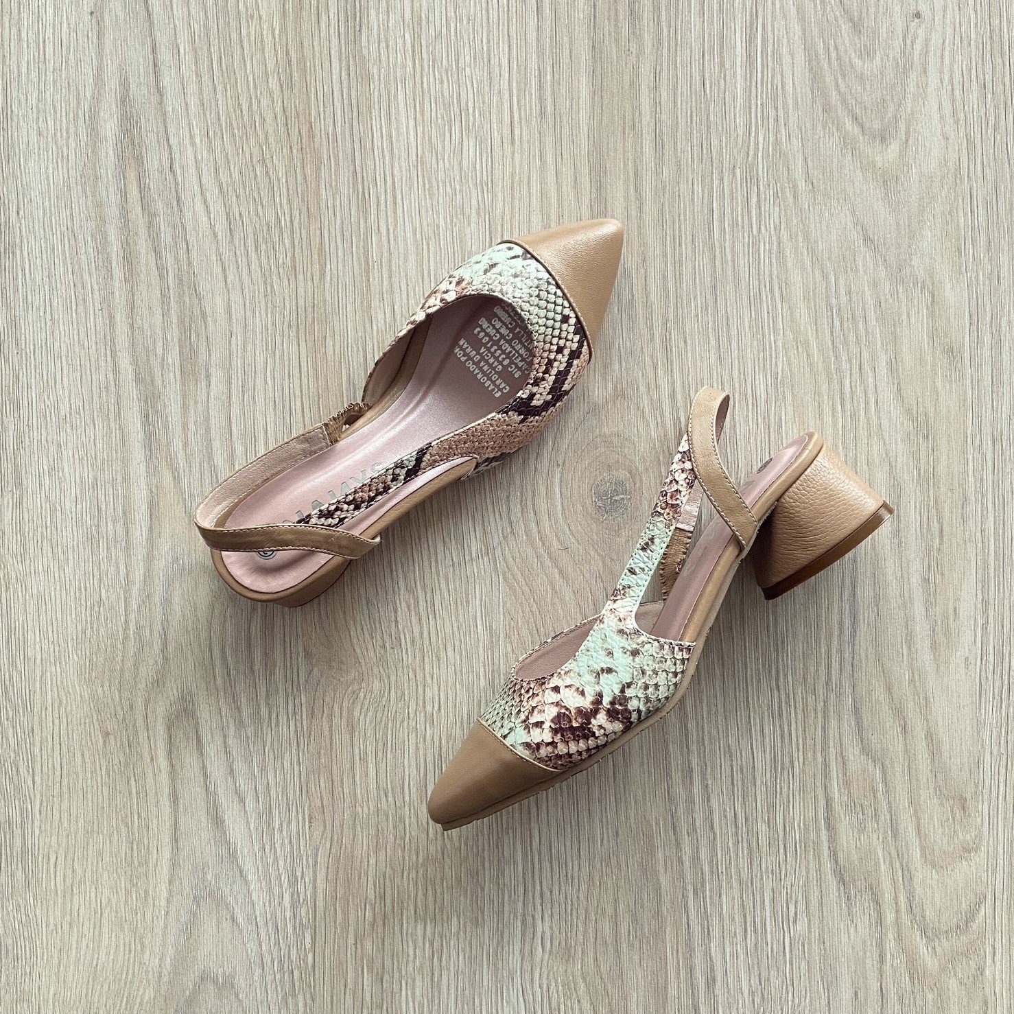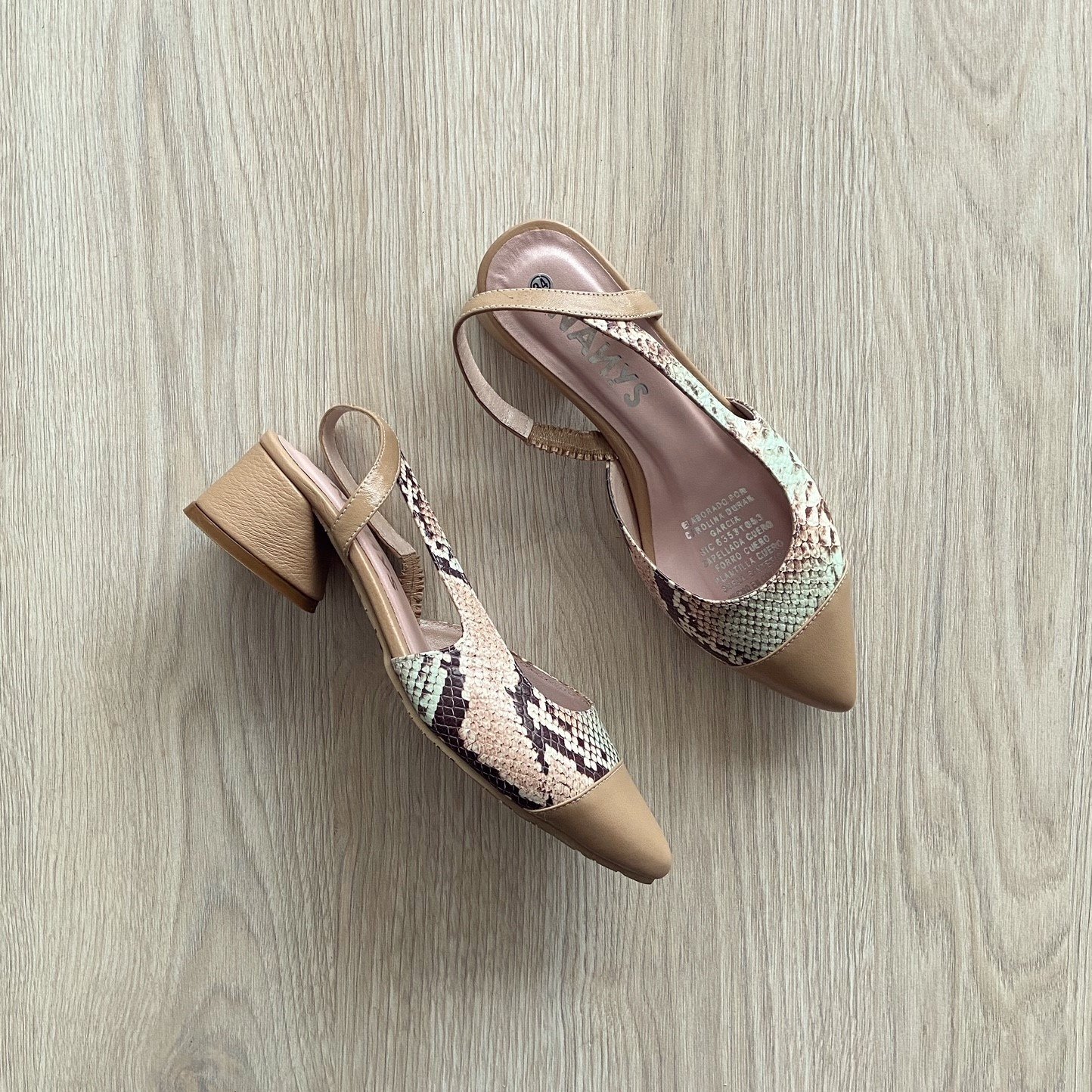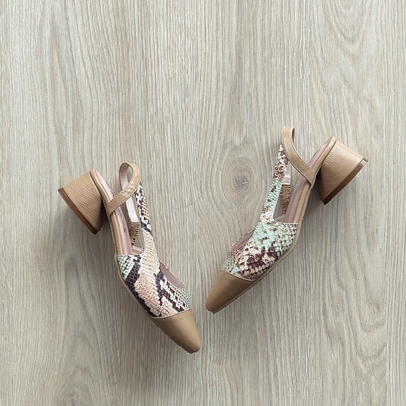 Zapato camel en cuero con folia en tonos verdes en cuero. Tacón 3.5 cm. Suela en goma antideslizante. Forrados en cuero. Hechos en Colombia.