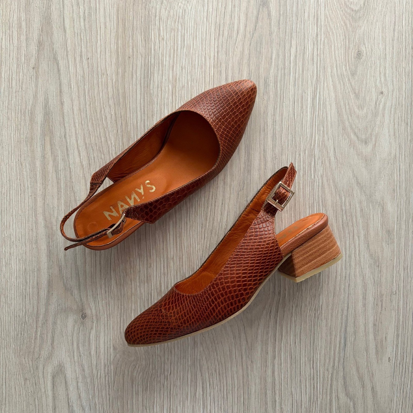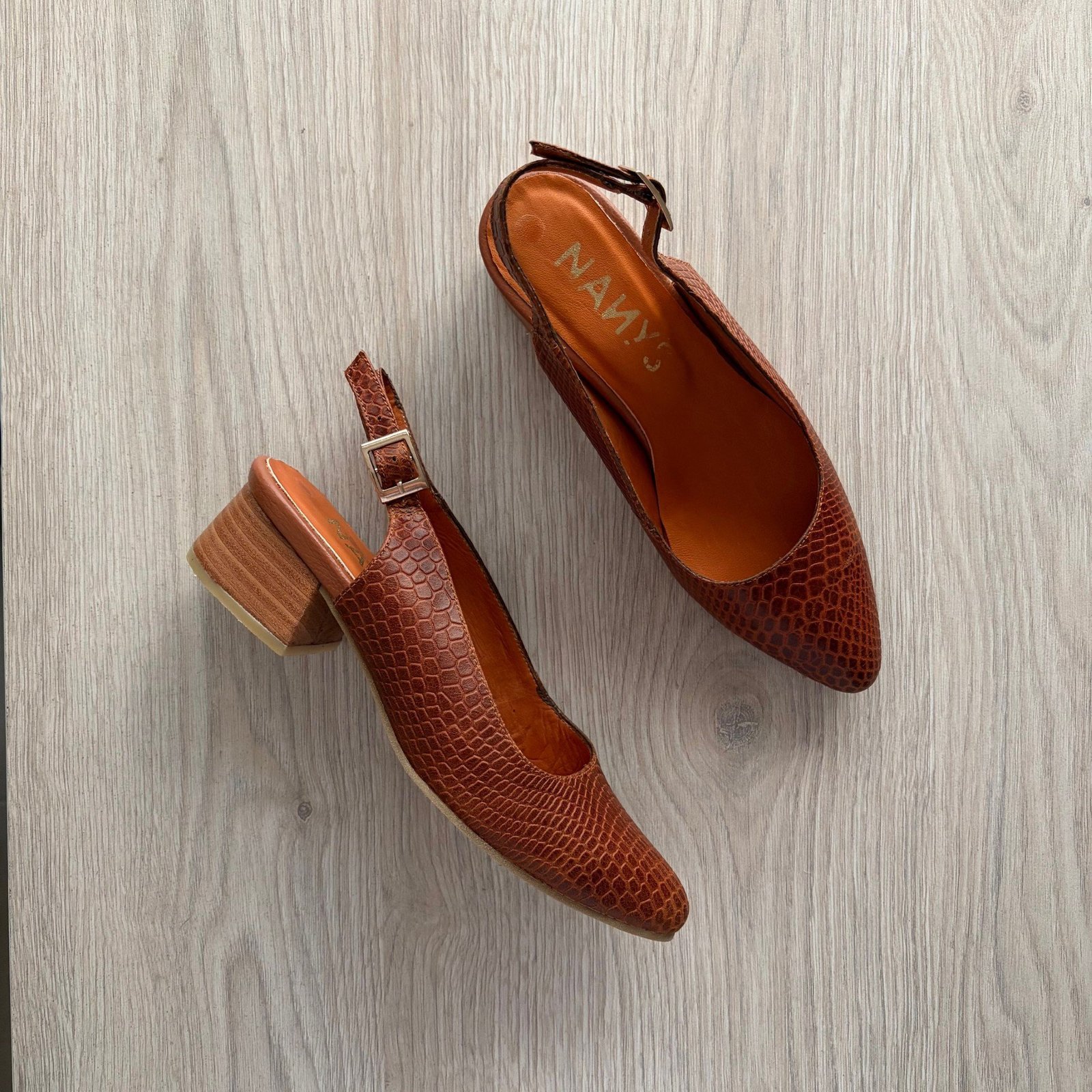 Zapato miel en cuero con hebilla. Suela en goma. Tacón 3.5. Forrados en cuero. Hechos en Colombia.